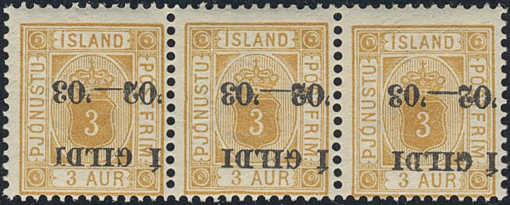 Iceland. Official Facit Tj21 ★★, 1902 Overprint Í GILDI '02-'03 3 aur orange, perf 12¾ in stripe-of three with inverted overprint.