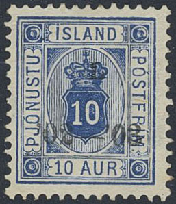Iceland. Official Facit Tj24v2 ★, 1902 Overprint Í GILDI '02-'03 10 aur ultramarine perf 12¾ inverted overprint. SEK 650