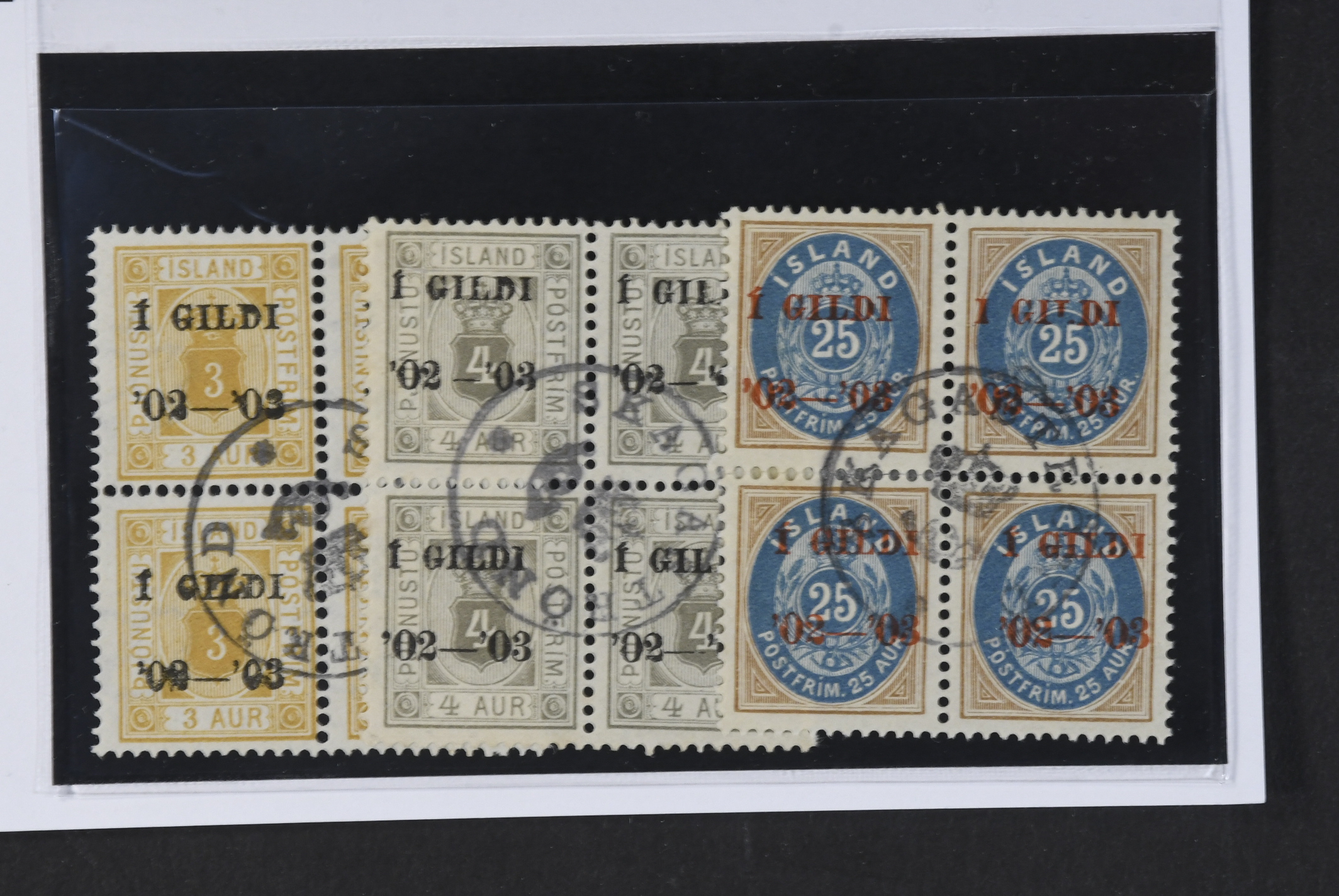 Iceland. Official Facit Tj62, Tj21–22 used, 25 aur rewd overprint, 1902 Overprint Í GILDI '02-'03 3 aur and 4 aur, perf 12¾. Very fine blocks of four cancelled SKAGASTROND. 25 aur block is almost separated.