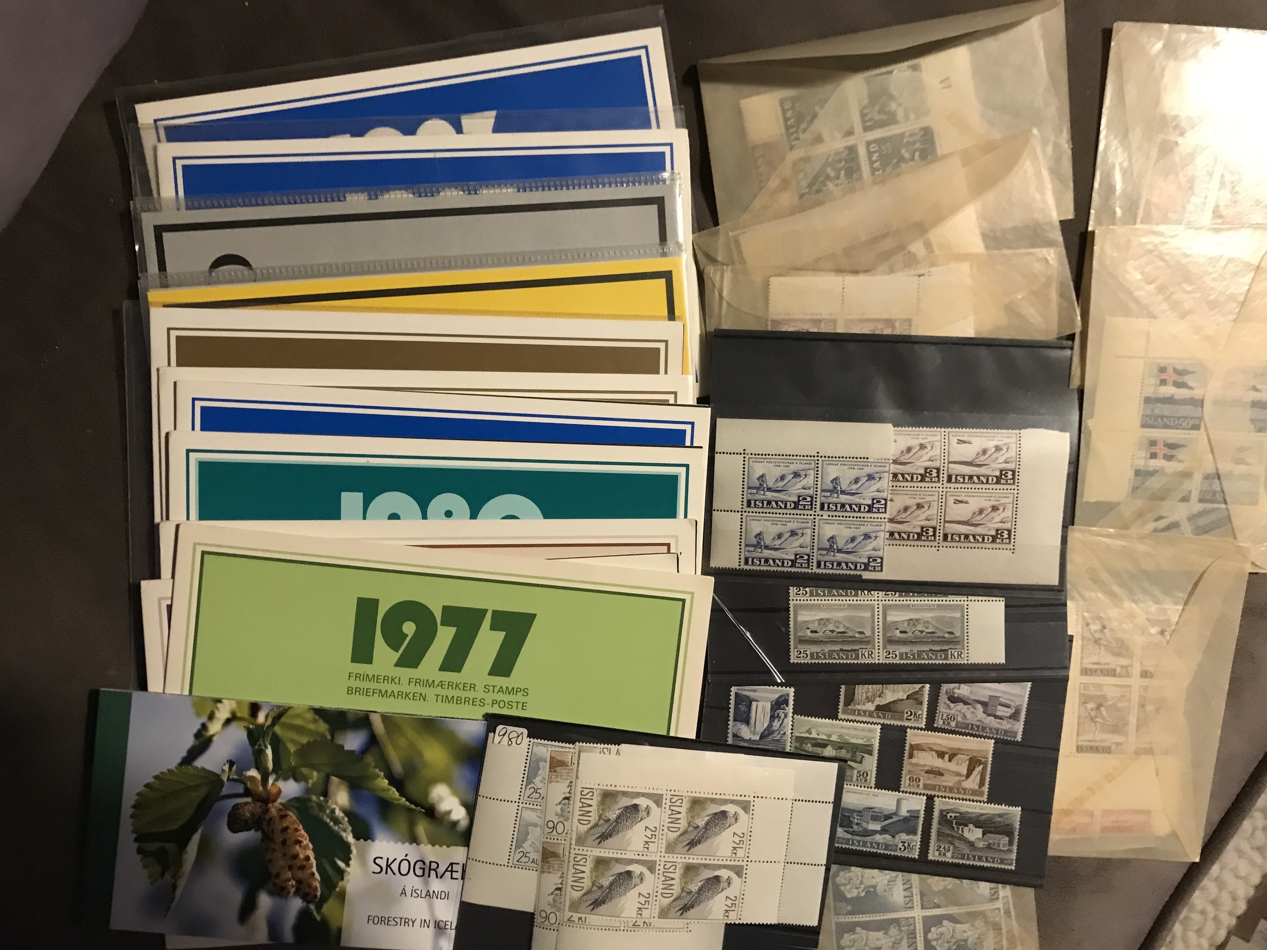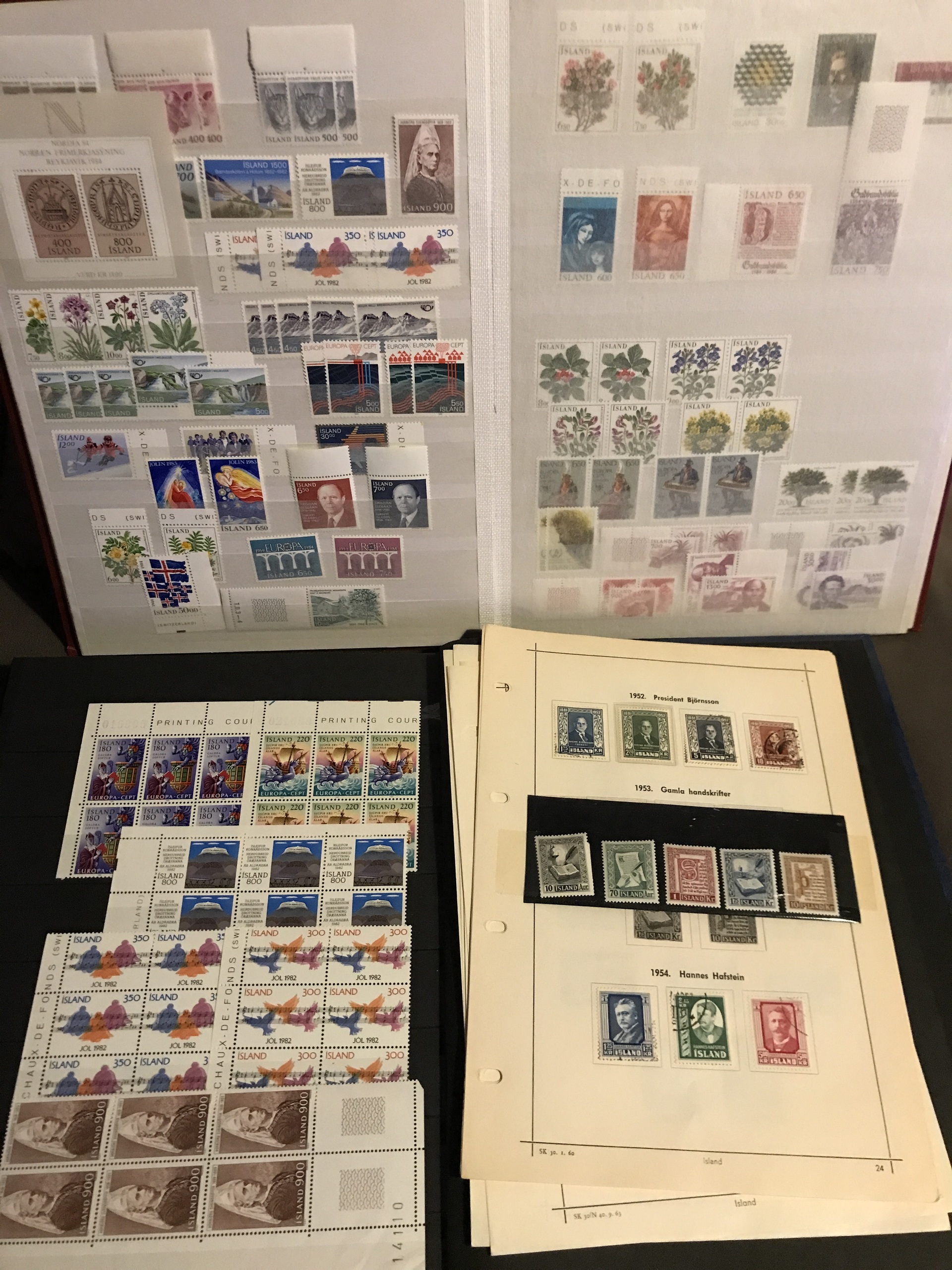 Iceland. Mostly used. Accumulation old-modern in e.g. three stockbooks+ leaves and envelopes incl. many blocks-of-four and other units, ten year sets etc. Please see a selection of scans at www.philea.se.