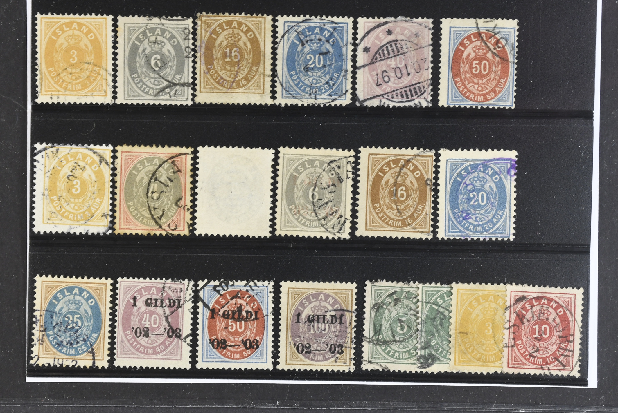 Iceland. Used 1876–1902. All different, e.g. F 8, 11, 13, 15, 17–18, 21–22, 22v1, 27–29, 42–44. Mostly good quality. F SEK 8125 (20)