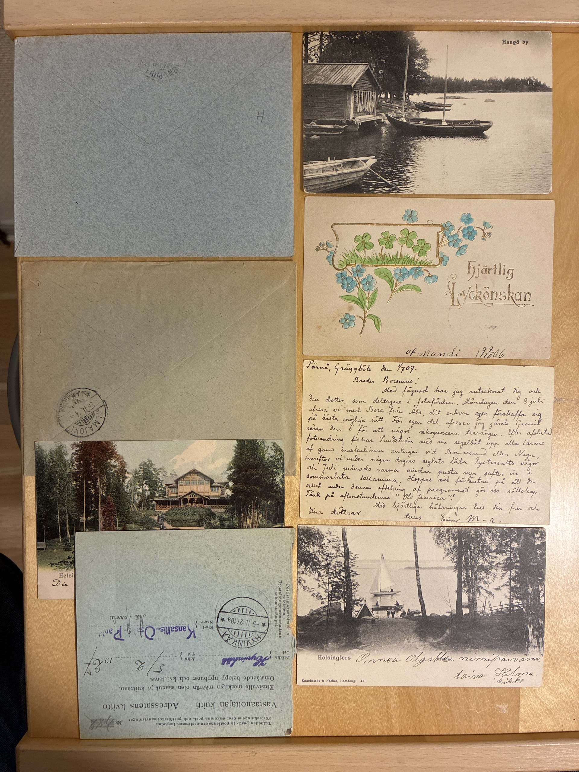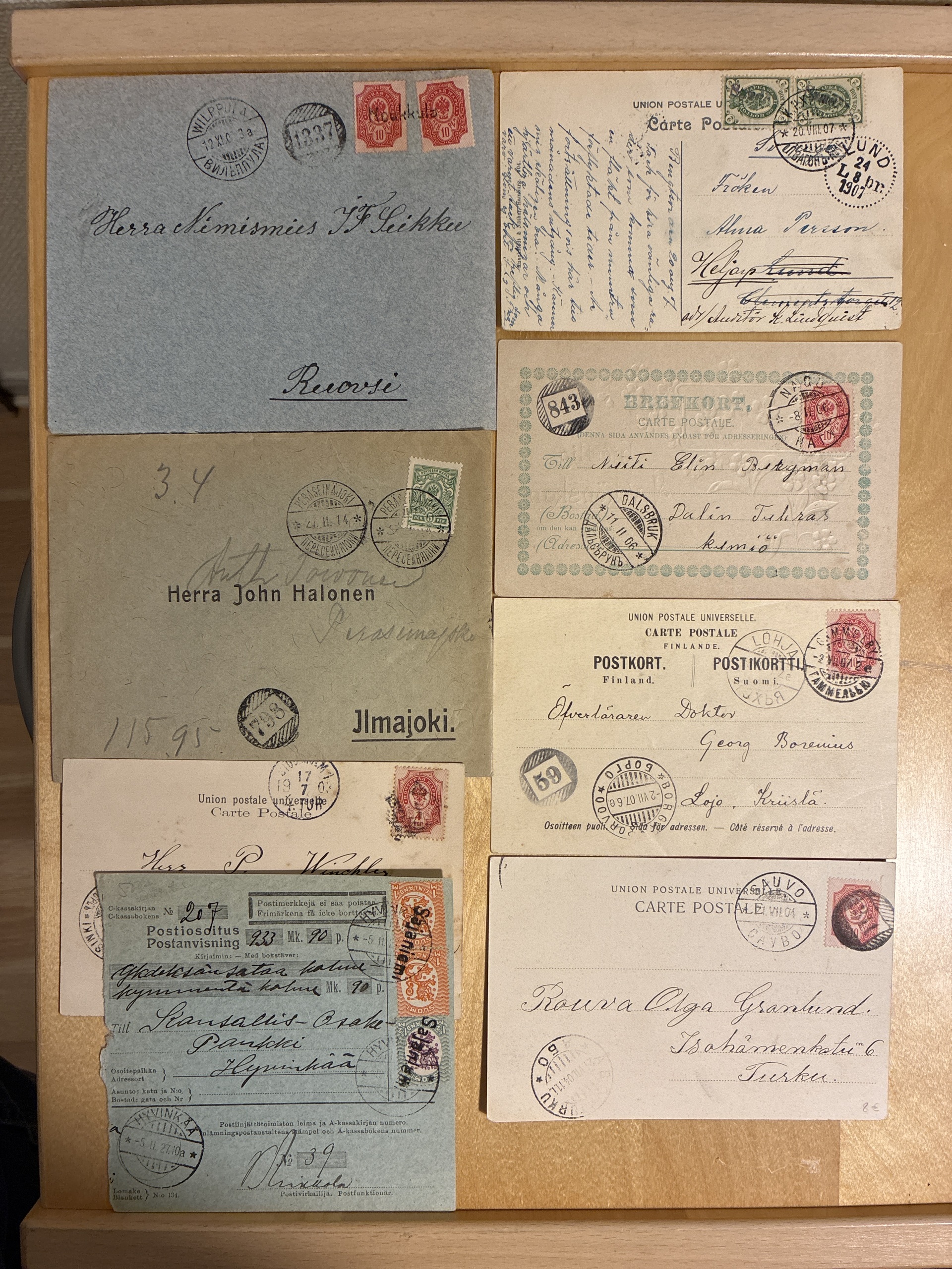 Finland. Lot covers 1904–1927 in envelopes. Eight covers/postcards with number-cancellations or straight line postmark. The entire lot is presented at www.philea.se. Mostly fine quality.
