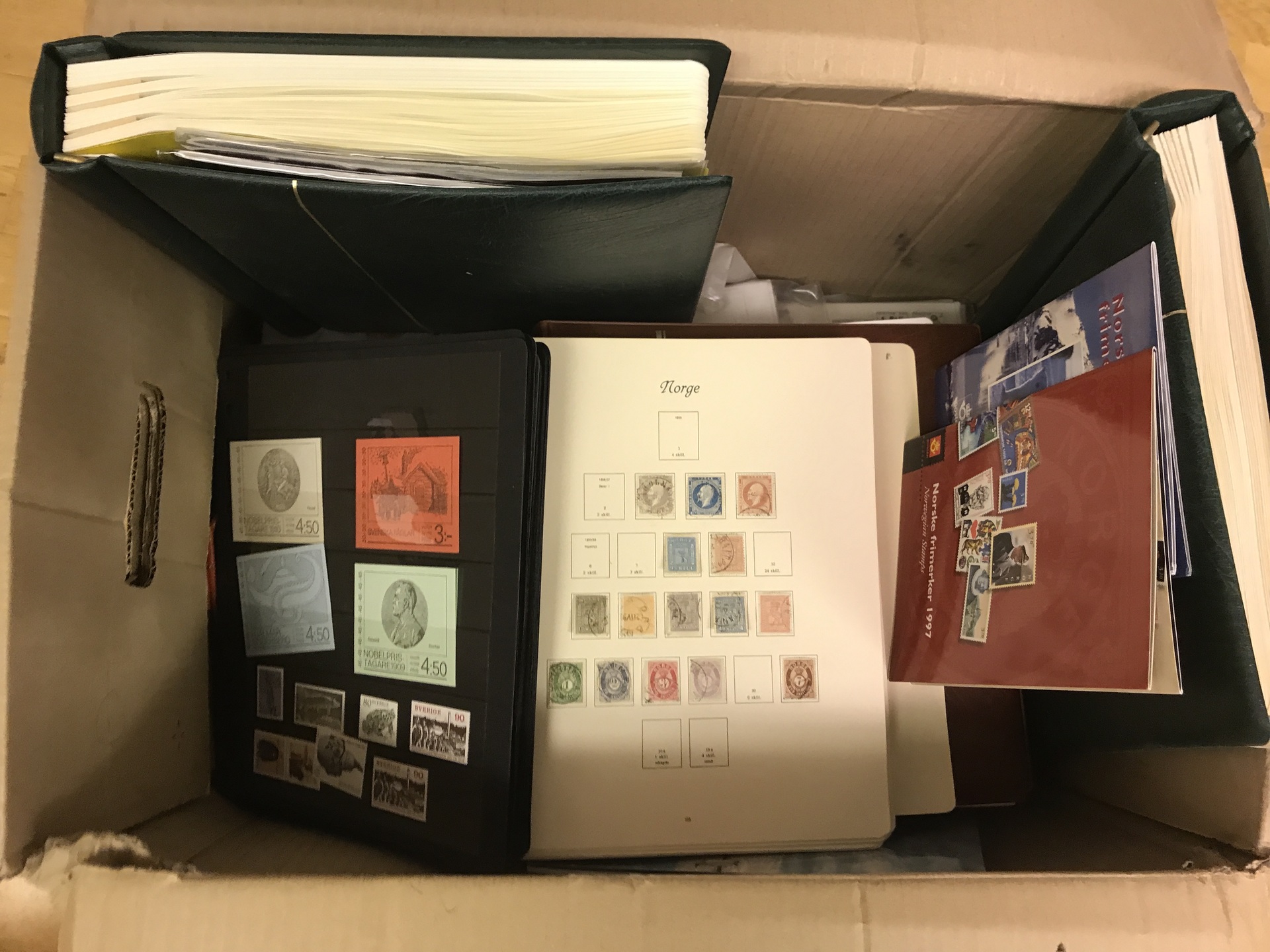 NORDIC COUNTRIES. ★★/★/⊙. Removal box with e.g. collections in Esselte- and Leuchtturm albums, stamps and booklets on visir leaves, better Norway, 100s of FDCs and some year sets, etc. Approx. 24 kg.