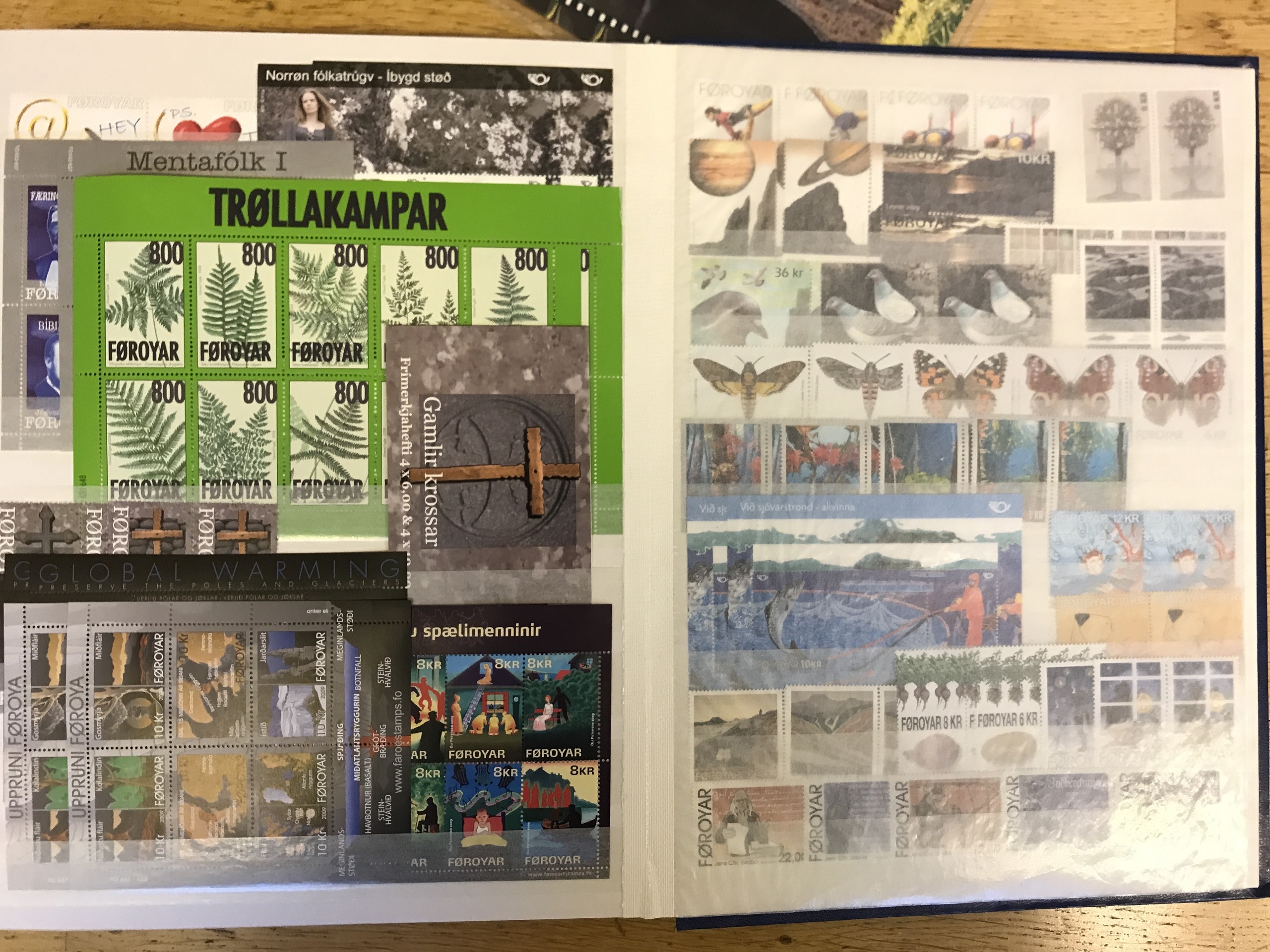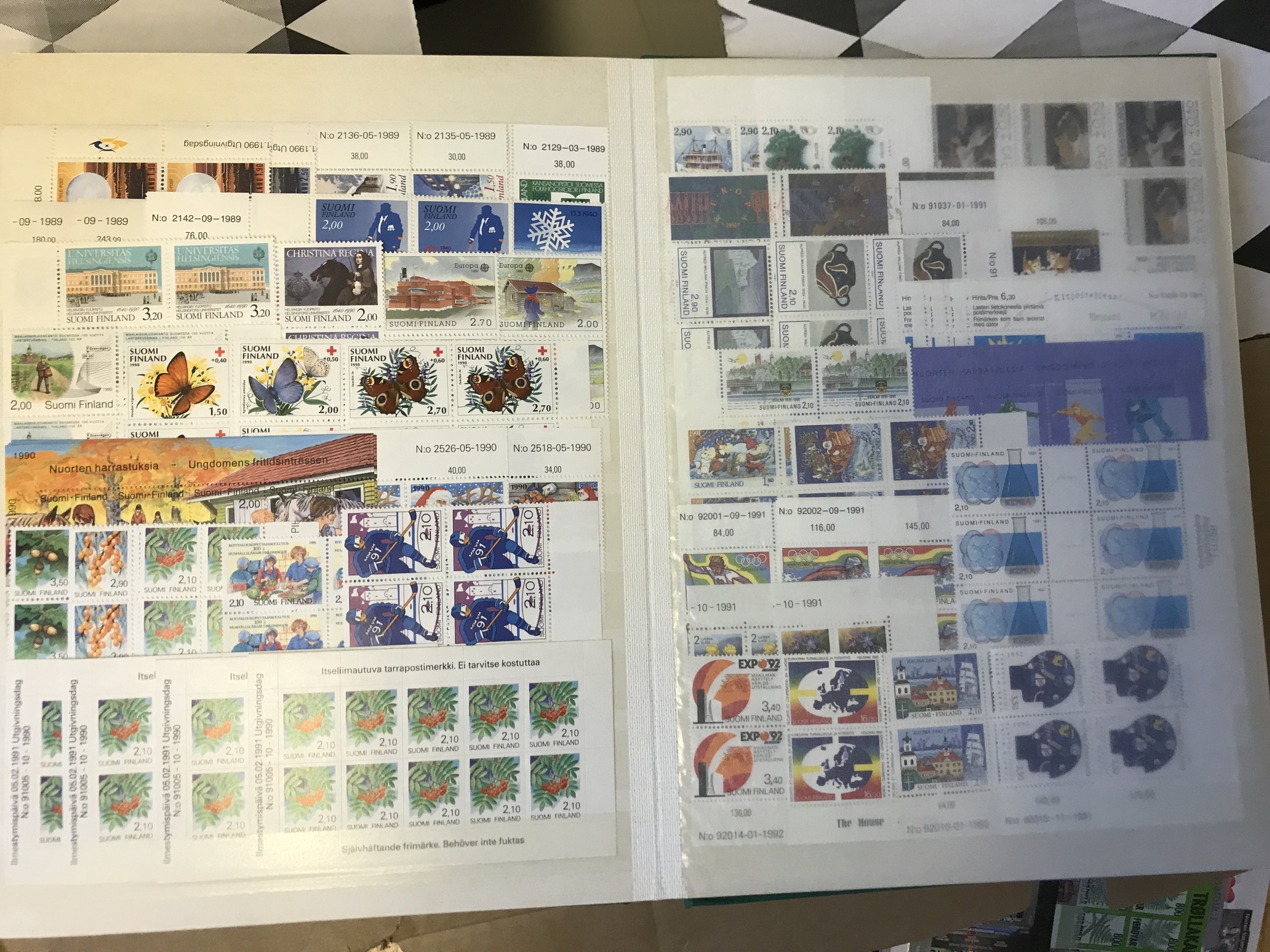 NORDIC COUNTRIES. ★★/★/⊙. 21 stockbooks + leaves with 1000s of stamps old–modern. Containing e.g. much ** Finland and Faroes incl. 18 year sets, etc. Please see a selection of scans at www.philea.se. Approx. 18 kg.