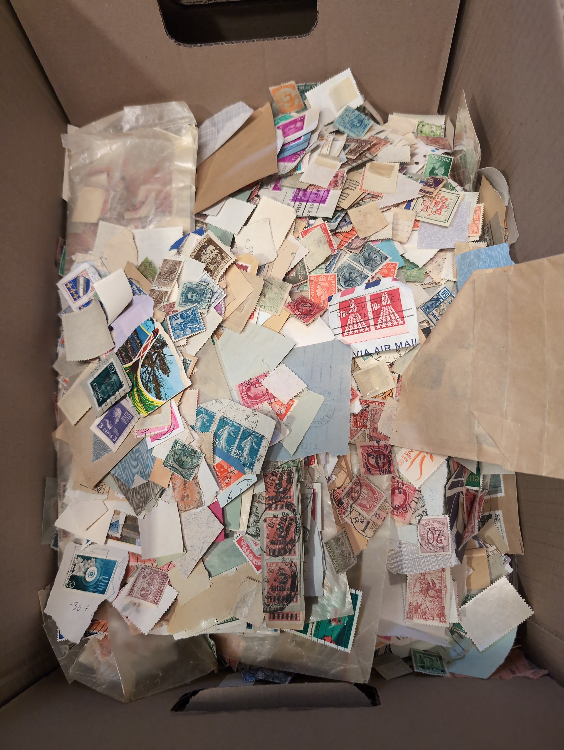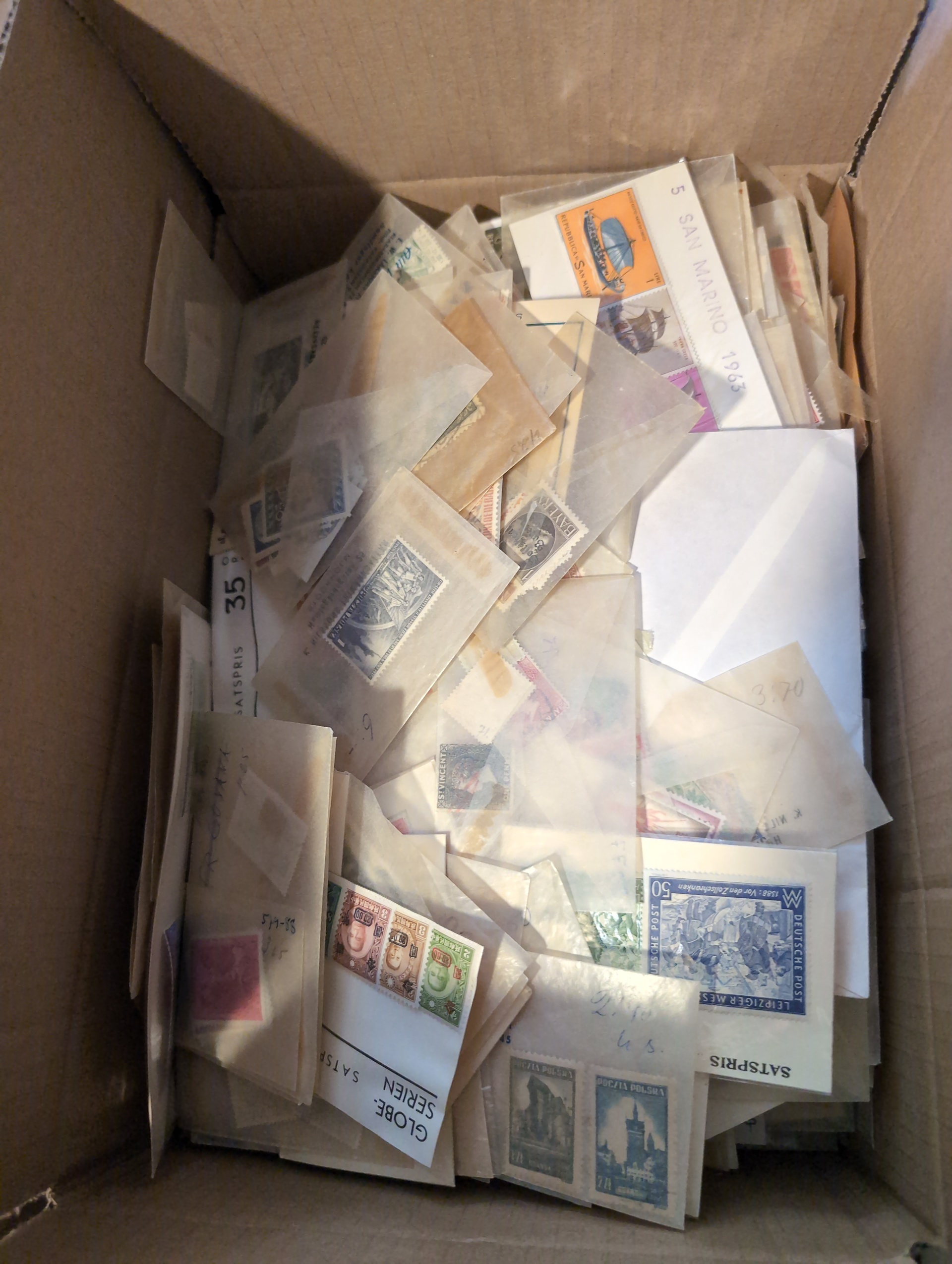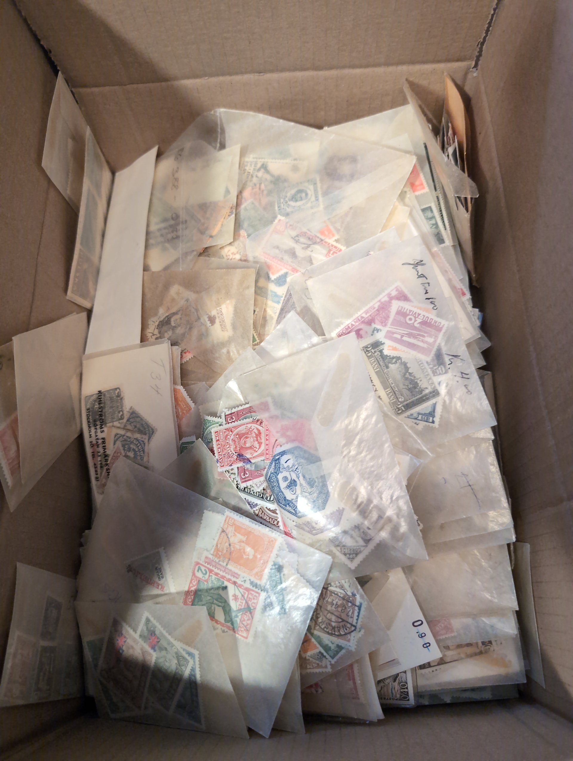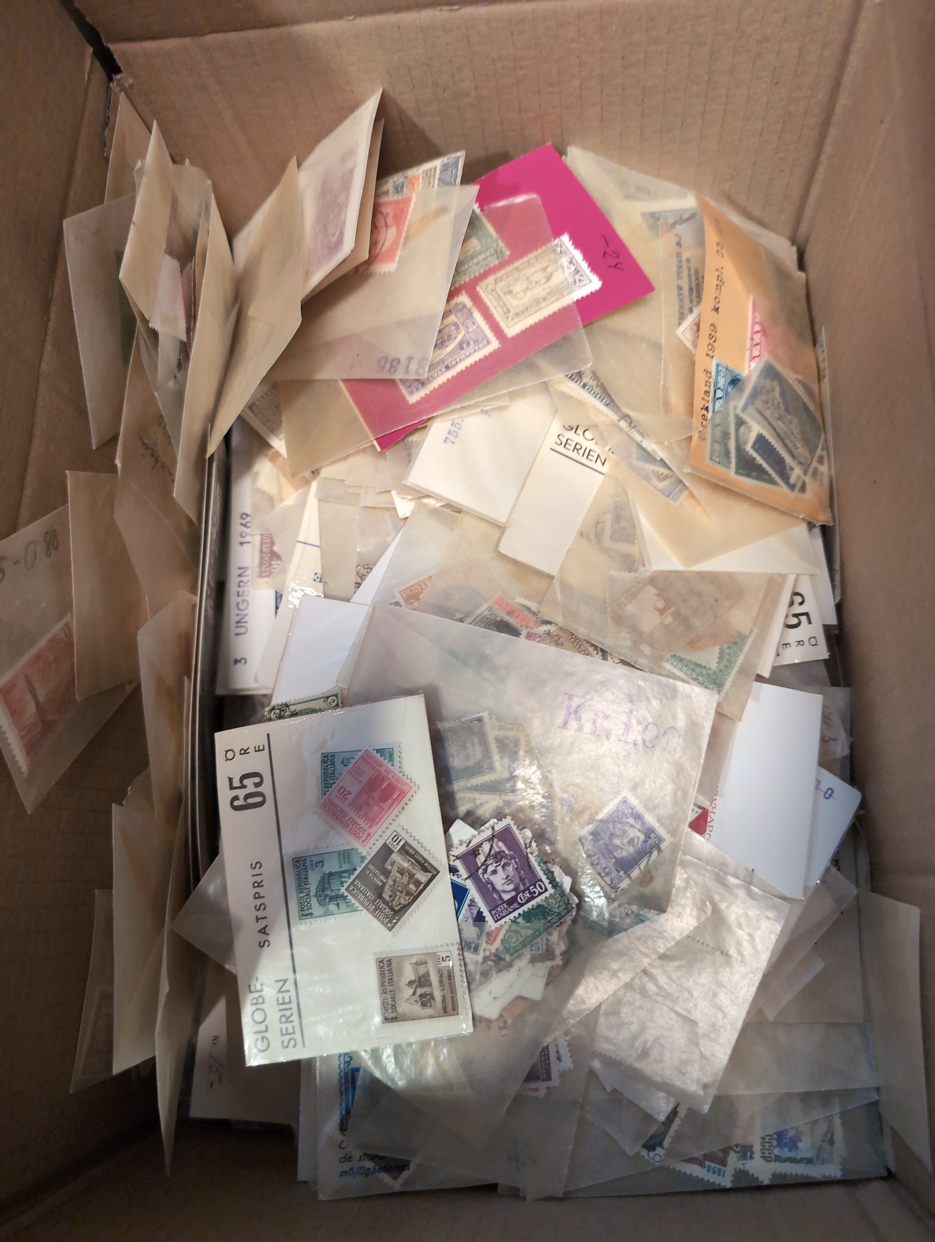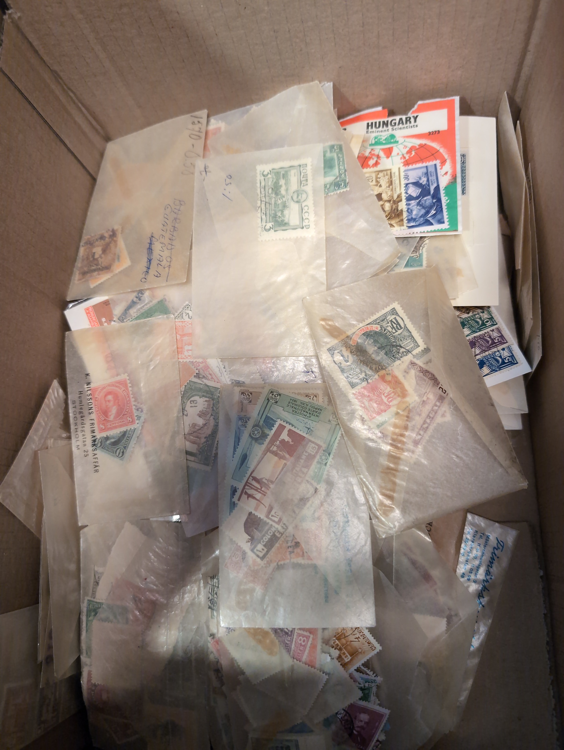 ALL WORLD. Accumulation ★★/★/⊙ 1850s–1960s in medium removal box. half of the box with massware partly on paper much 1900–1950s. one smaller box filled with glassine envelopes with much */** incl. some better complete sets. Some of the best are presented on stockcards. Please see a selection of scans at www.philea.se. Very mixed quality. Approx. 7 kg. (10000s)