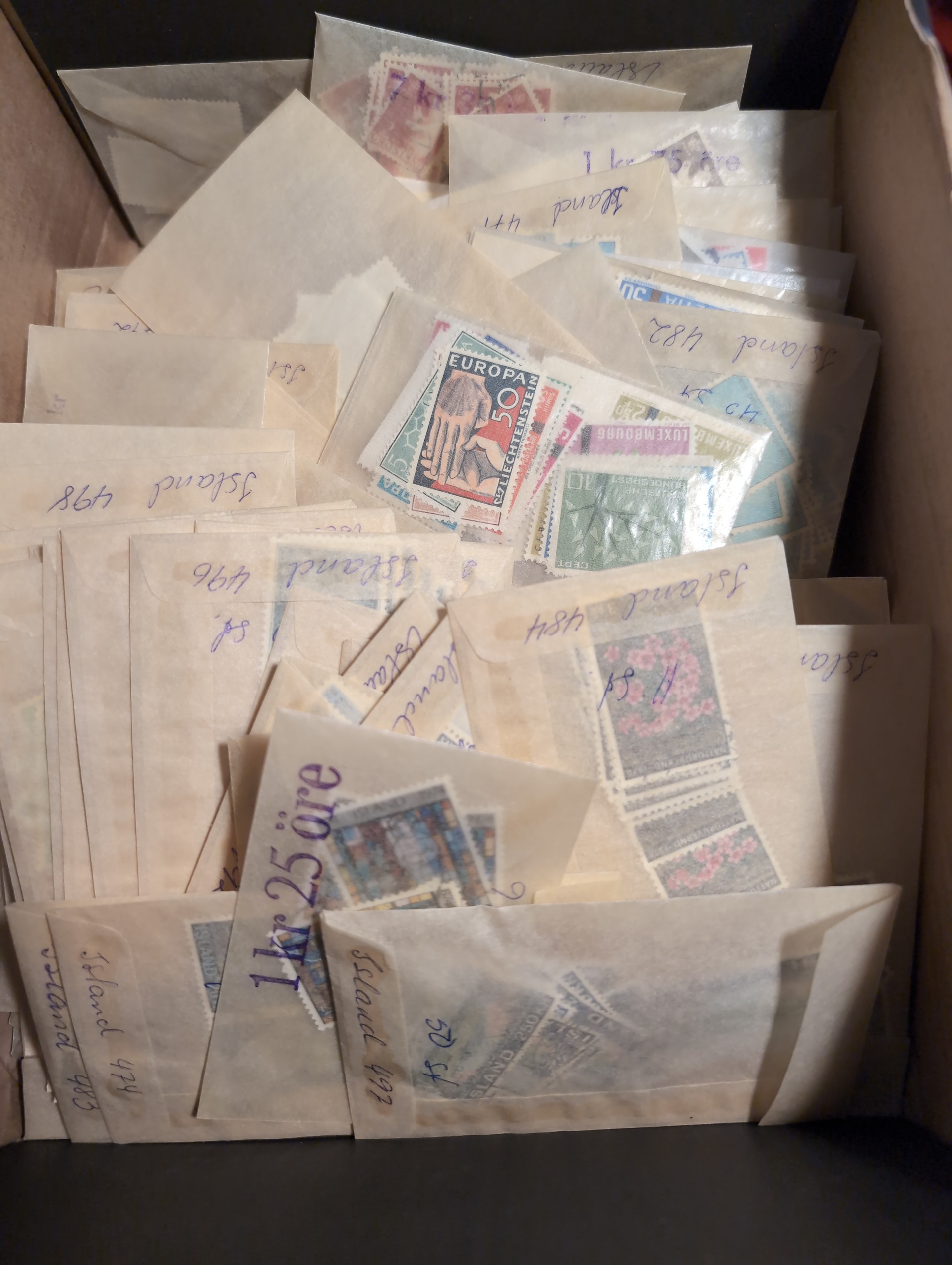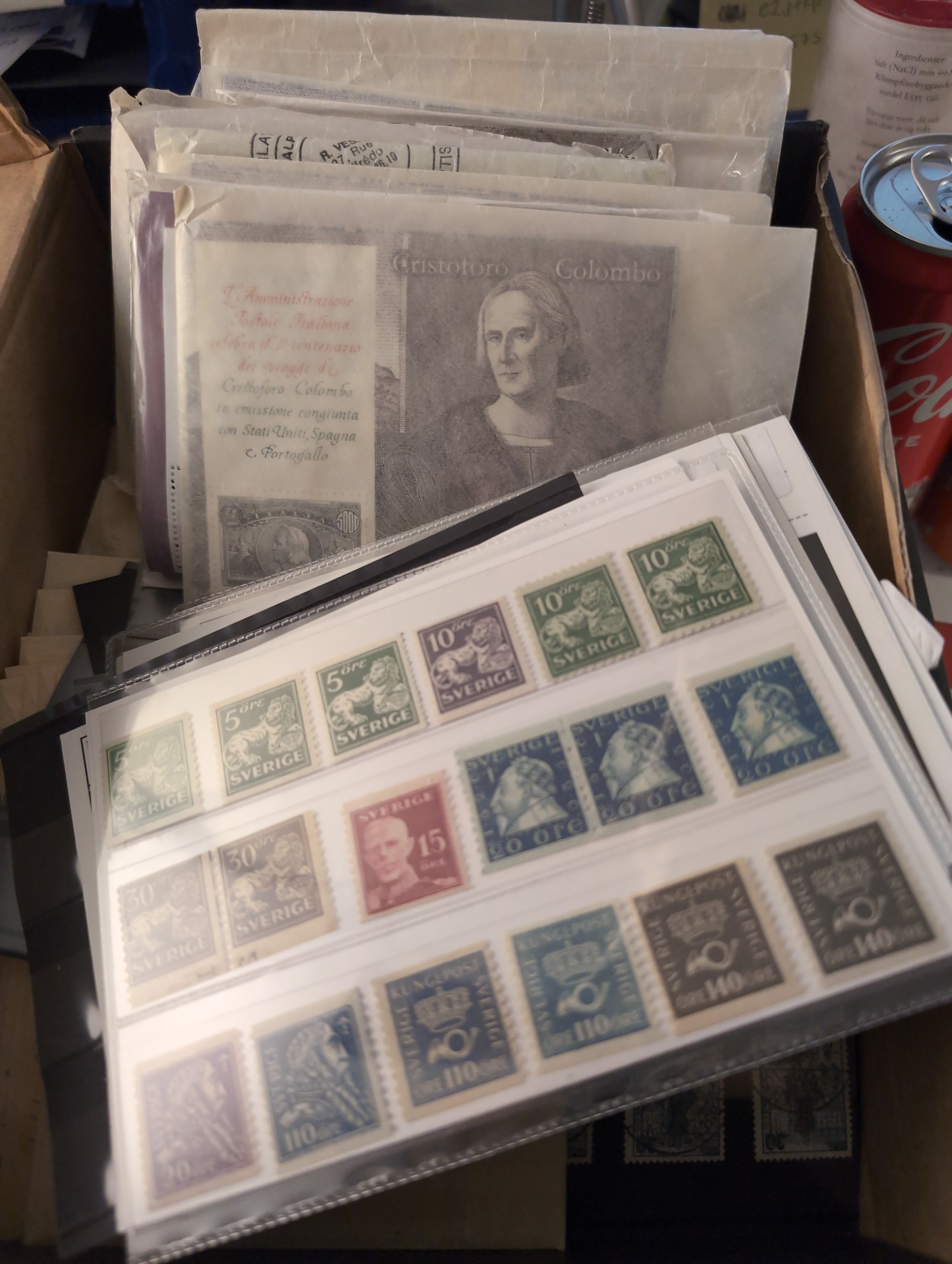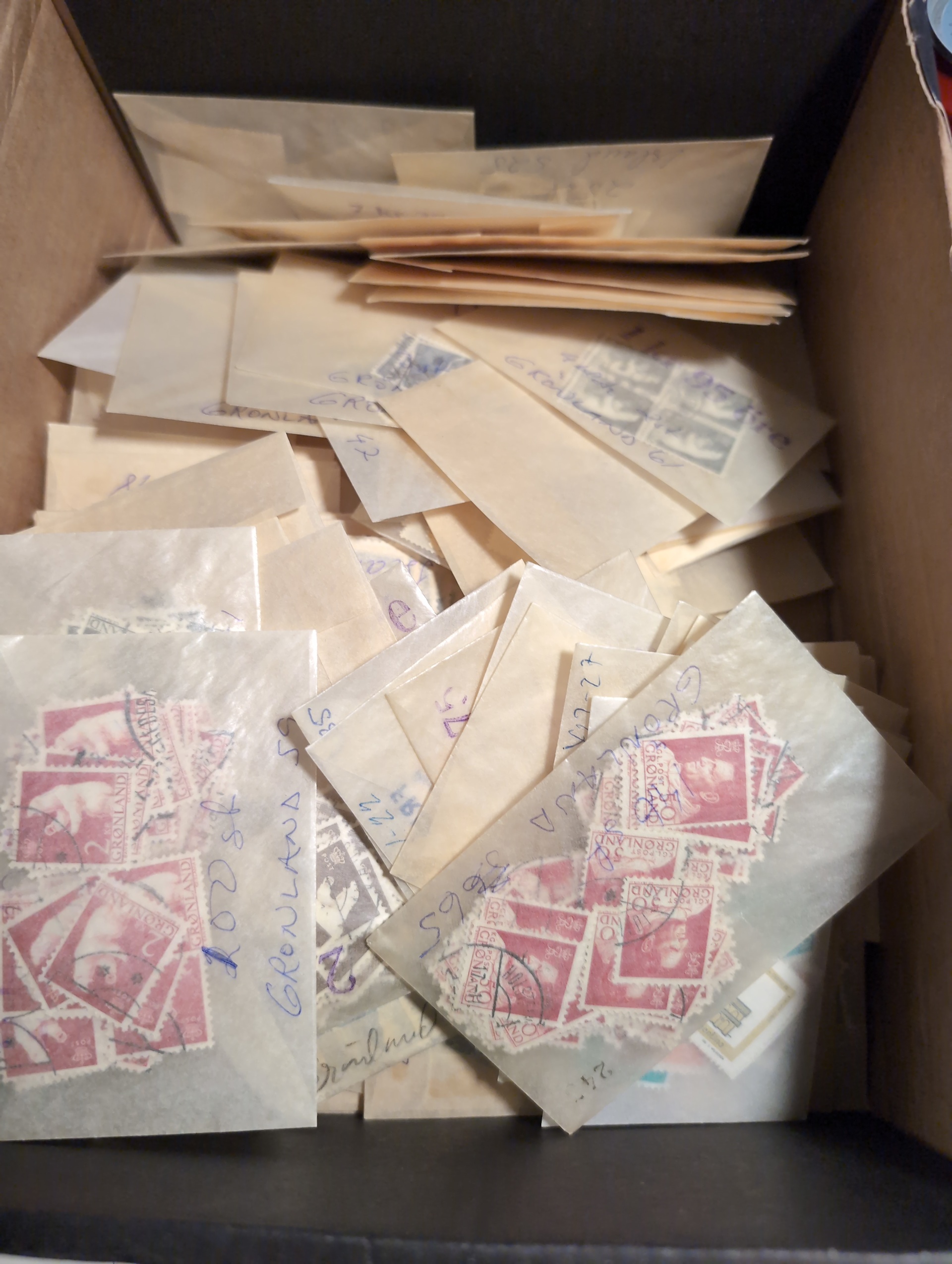 ALL WORLD. Accumulation ★★/★/⊙ 1850s–1980s in small box. With mostly nordic stamps. incl. somewhat better on stockcards, glasines with stock used Greenland and Iceland 1950s–1980s. Also included are three FDCs from Zanzibar and a stockcard Italy NH and a prephil cover from Stockholm to France 1845. Please see a selection of scans at www.philea.se. Somewhat mixed quality. (1000+)