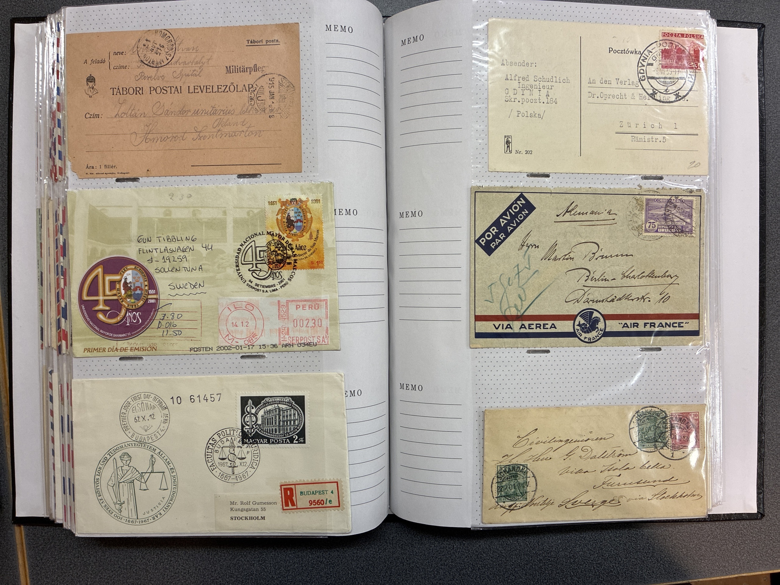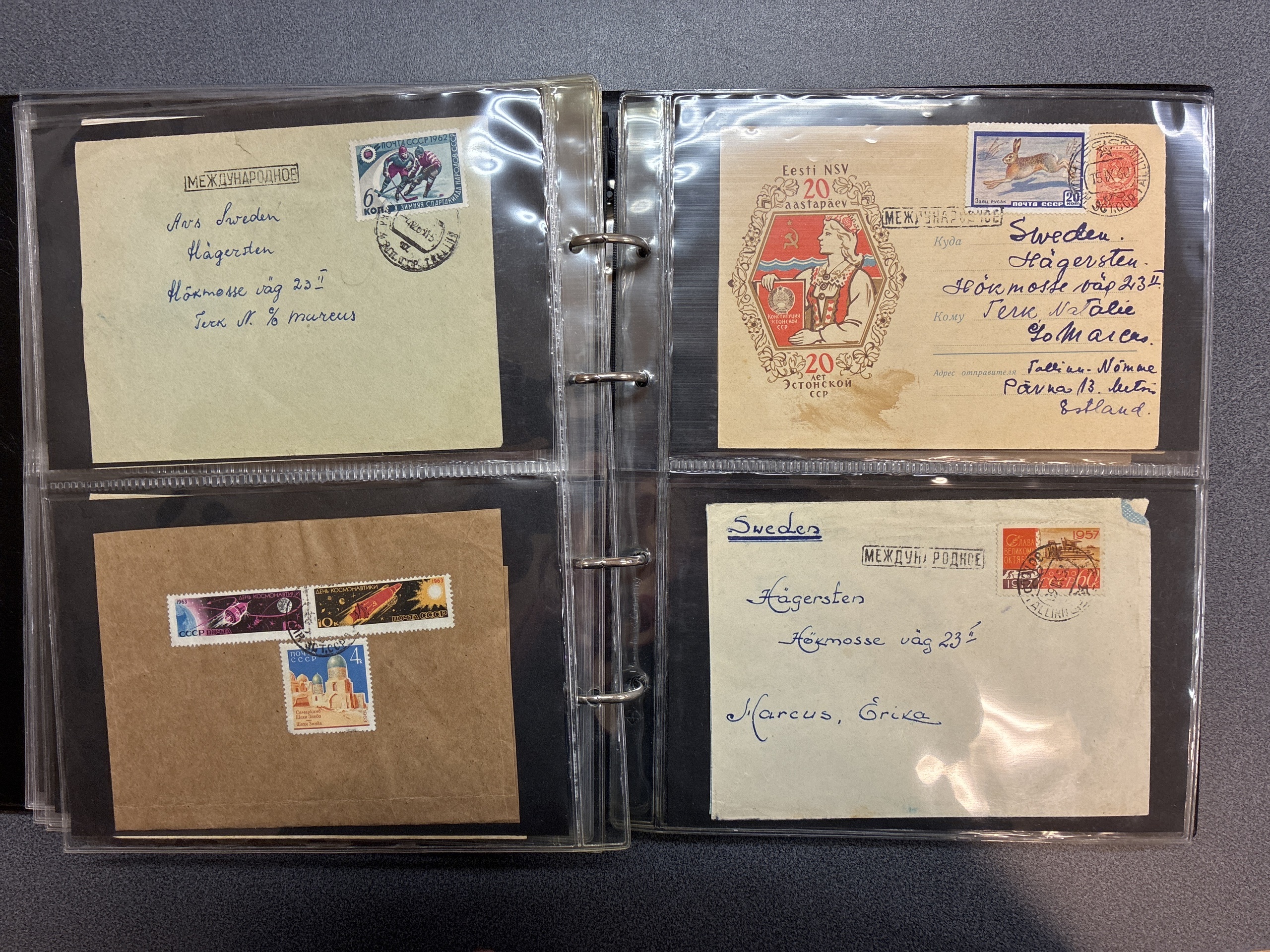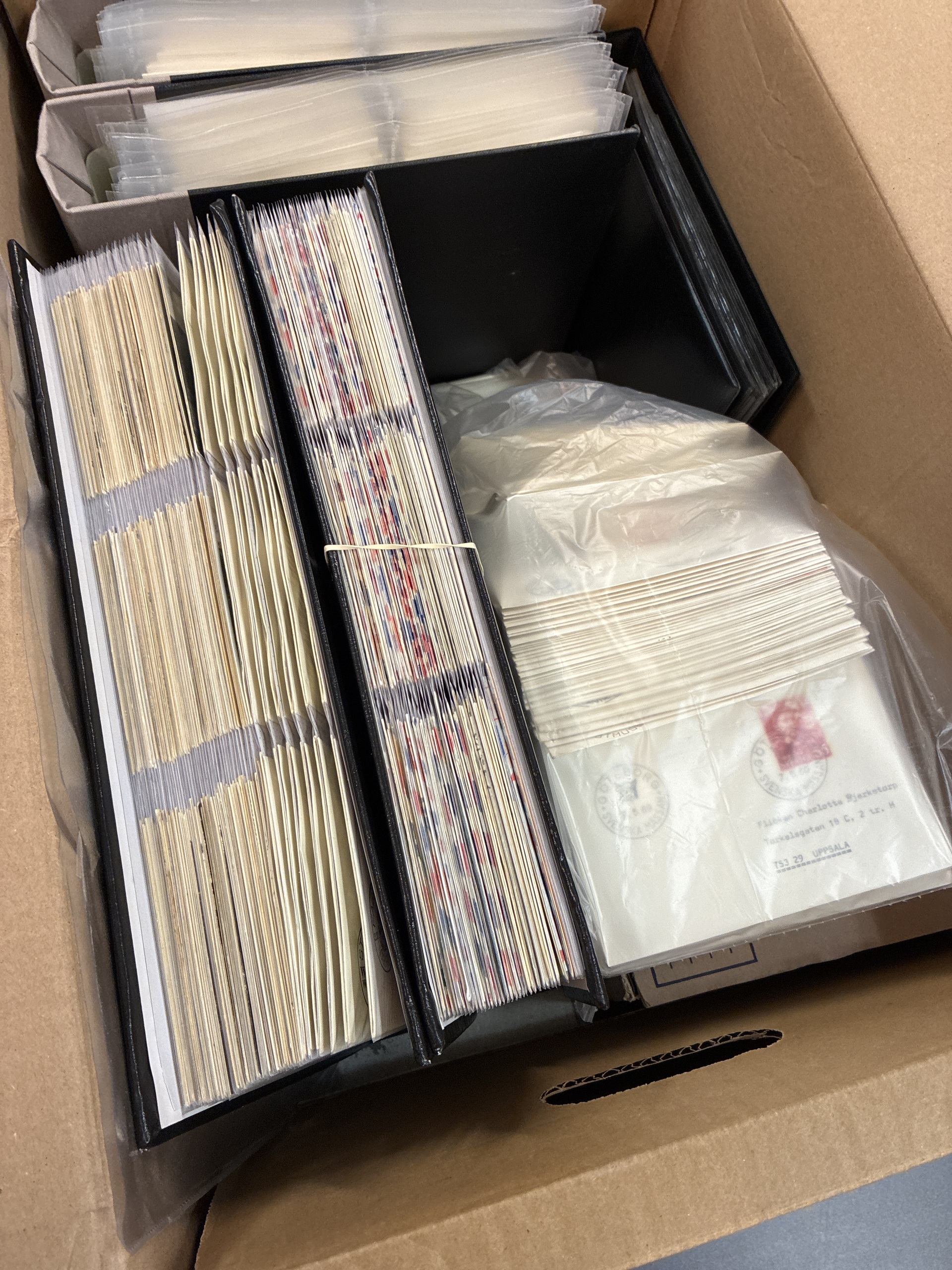 ALL WORLD. Miscellaneous, accumulation 1900–1980 in removal box. Letters and postcards. Commemorative postmarks on letters. Five albums and three boxes. Postcards from Sweden. Letters from different countries. Please see a selection of scans at www.philea.se. Mostly good quality. Approx. 14 kg.