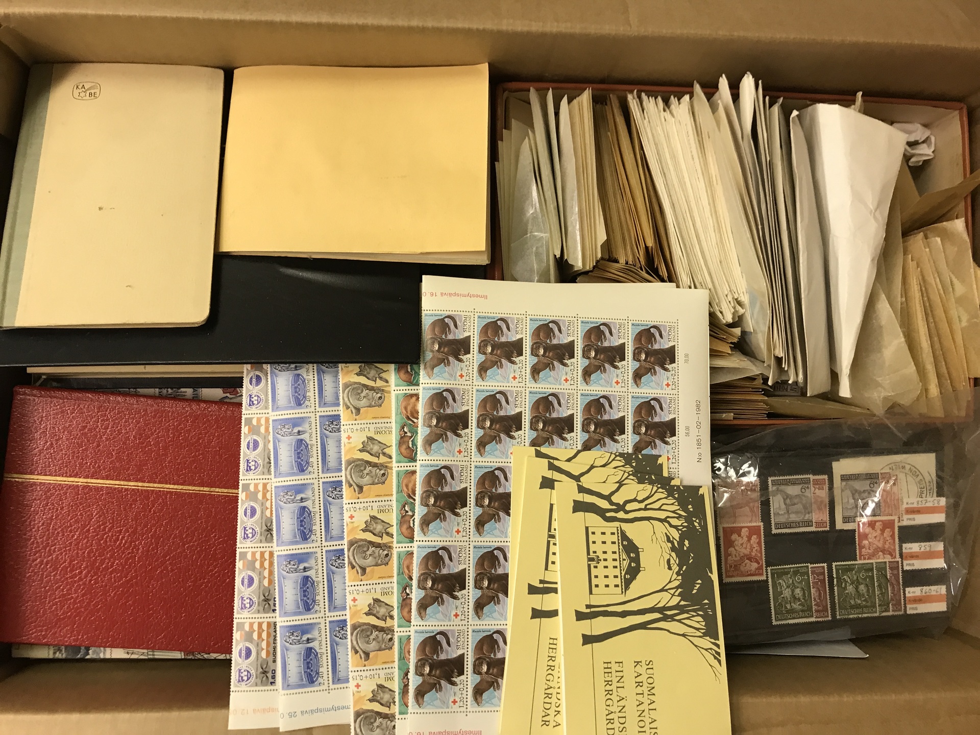ALL WORLD. Mostly used. Removal box with 10000s of stamps old–modern from a large number of countries. Mainly used but also **/* here and there incl. e.g. Reich, Finland, some booklets, etc. Approx. 11 kg.