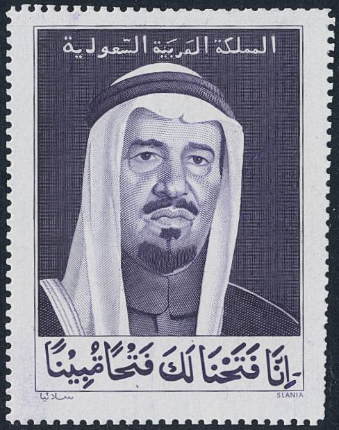 Thematics, Slania, Saudi Arabia. (★). King Khaled. Steel engraving in very dark ultramarine. Perforated. Scarce!