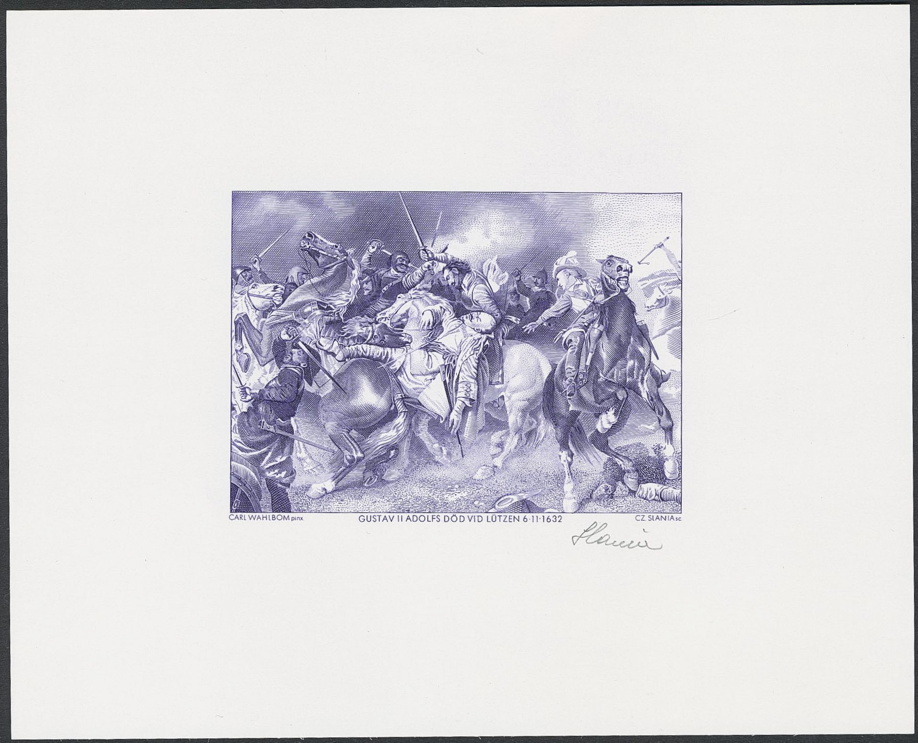 Thematics, Slania, Sweden. (★). 'GUSTAV II ADOLFS DÖD VID LÜTZEN'. Steel engraving in ultramarine, signed 'Slania'.