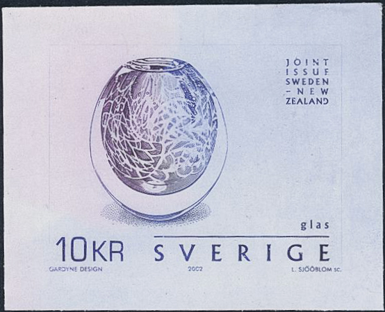 Thematics, Slania, Sweden. Facit 2314. (★). 2002 Art of glass and Maori handicrafts 10 kr Glass. Plate proof in ultramarine. Engraved by L. Sjööblom, one of Slania's pupils.