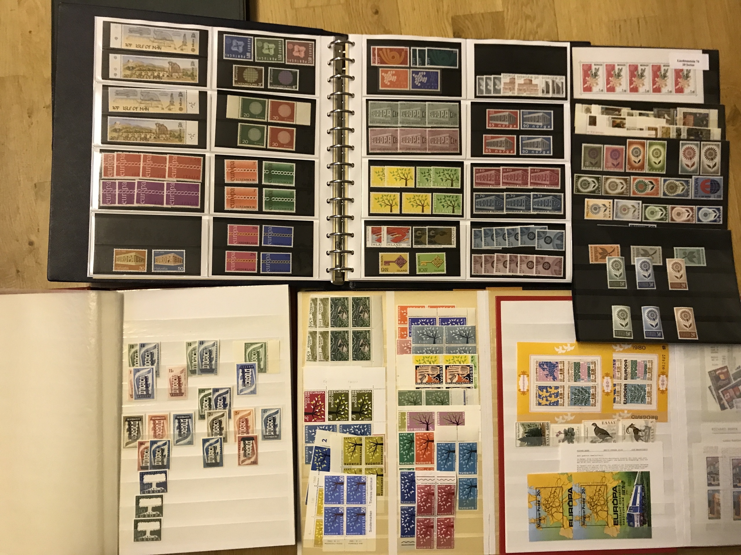 Thematics, Europa CEPT. ★★. Coll./accumulation 1956–1990 in four albums + stock cards incl. e.g. Luxemb 1956 + two 1957, two Liechtenst-1960, souvenir sheets and blocks-of-four, etc. Also Leuchtturm SF-album + stockbook with 'Mitläufer' 1952–1983 incl. e.g. Romania BL122 and two BL125, etc. Very high cat.value and excellent quality. Approx. 13 kg.