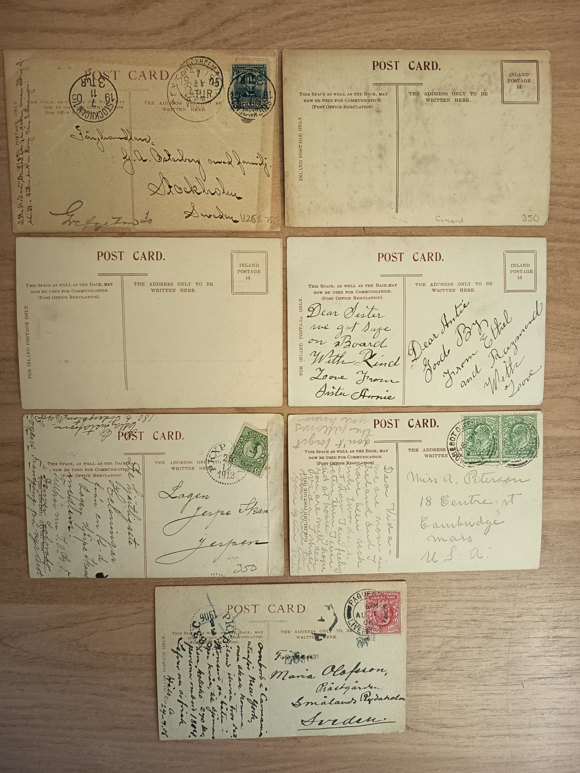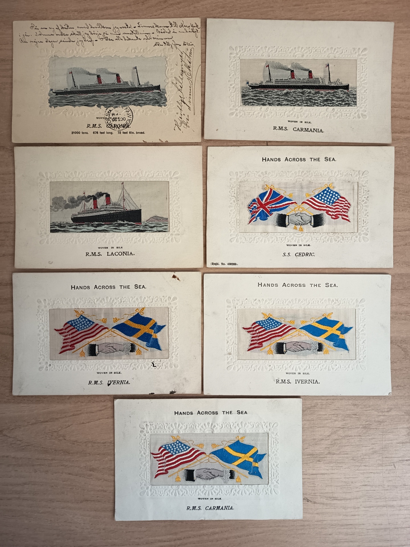 Thematics, Ships. Picture postcards. SHIPS Silk cards 3 different + Hands across the sea with ships names 3 different + one duplicate. The entire lot is presented at www.philea.se. Good quality. (7)
