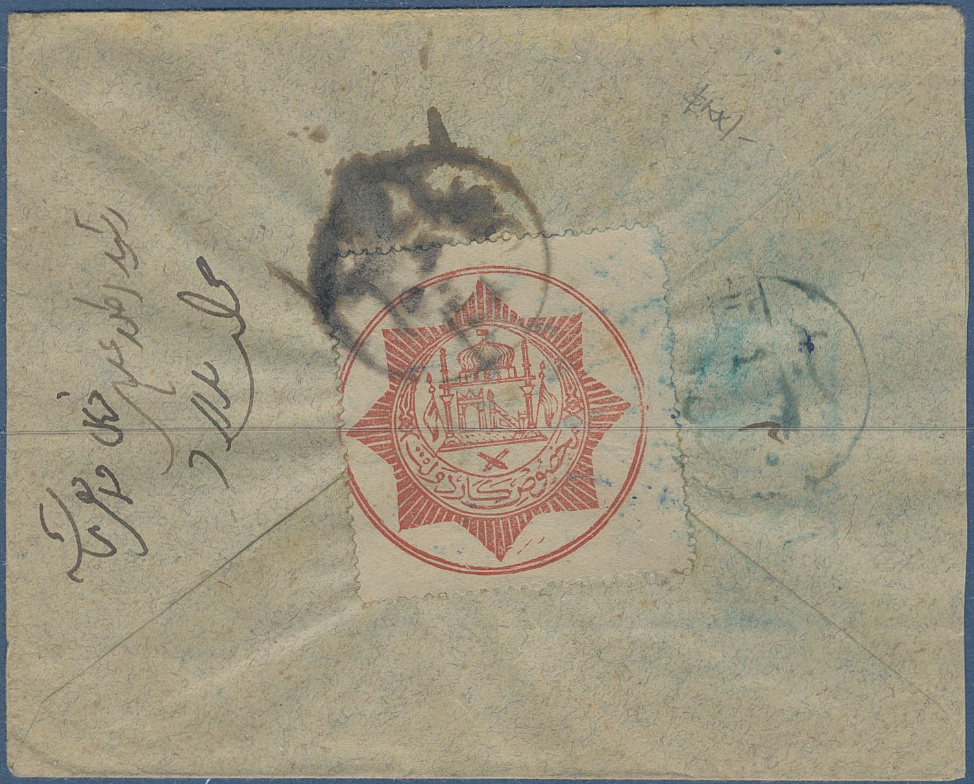 Afghanistan. Michel D1 on cover, Cover franked with single 1909 red official (SG 0173) tied by unclear green KHANABAD RASHTAG cancel. Sent to Kabul with arr cds at reverse. Interesting and scarce. The cover is a bit cut down.