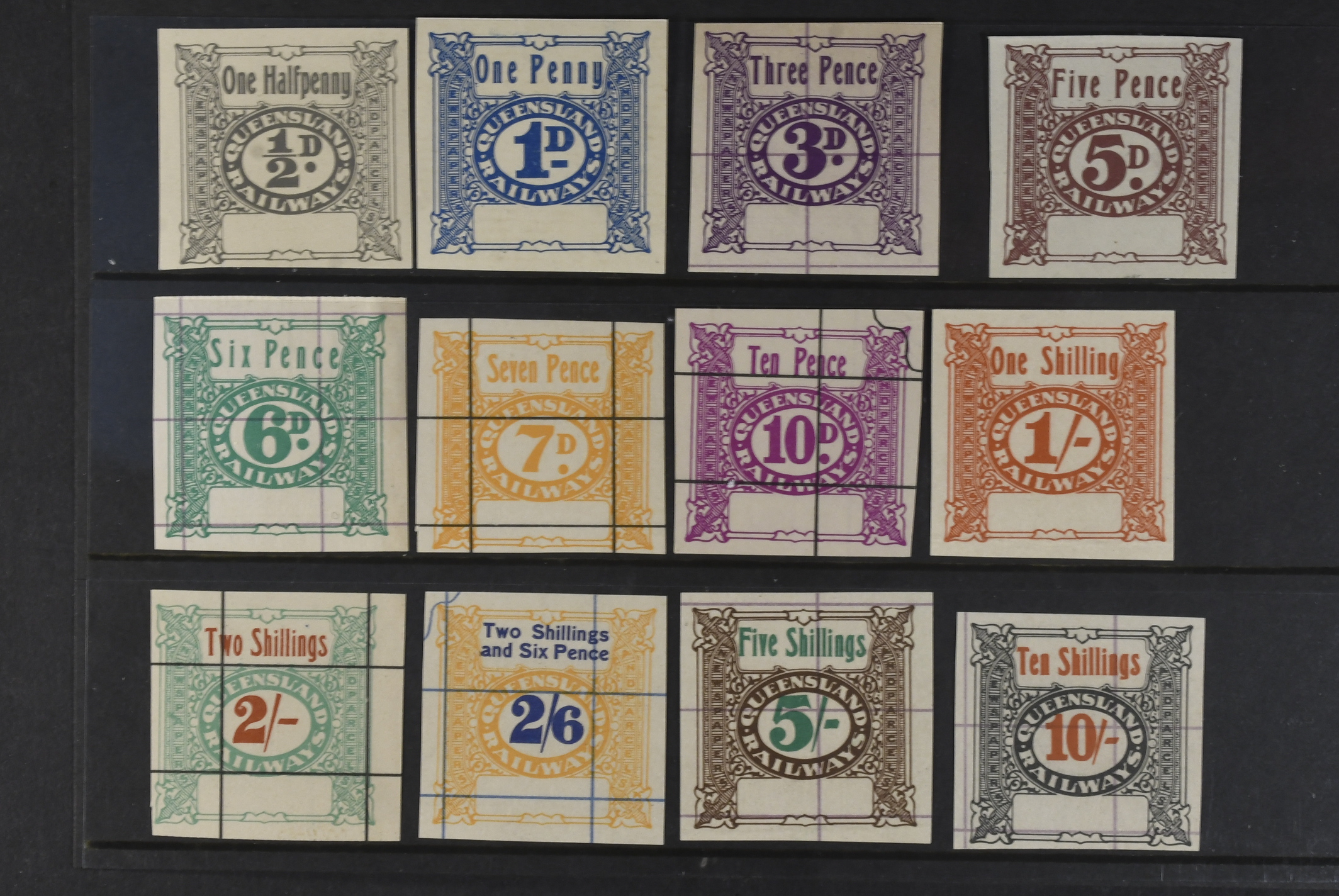 Australia, Queensland. Railway stamps (★), 1/2 d to 10/- railway stamps, imperf proofs, very scarce.