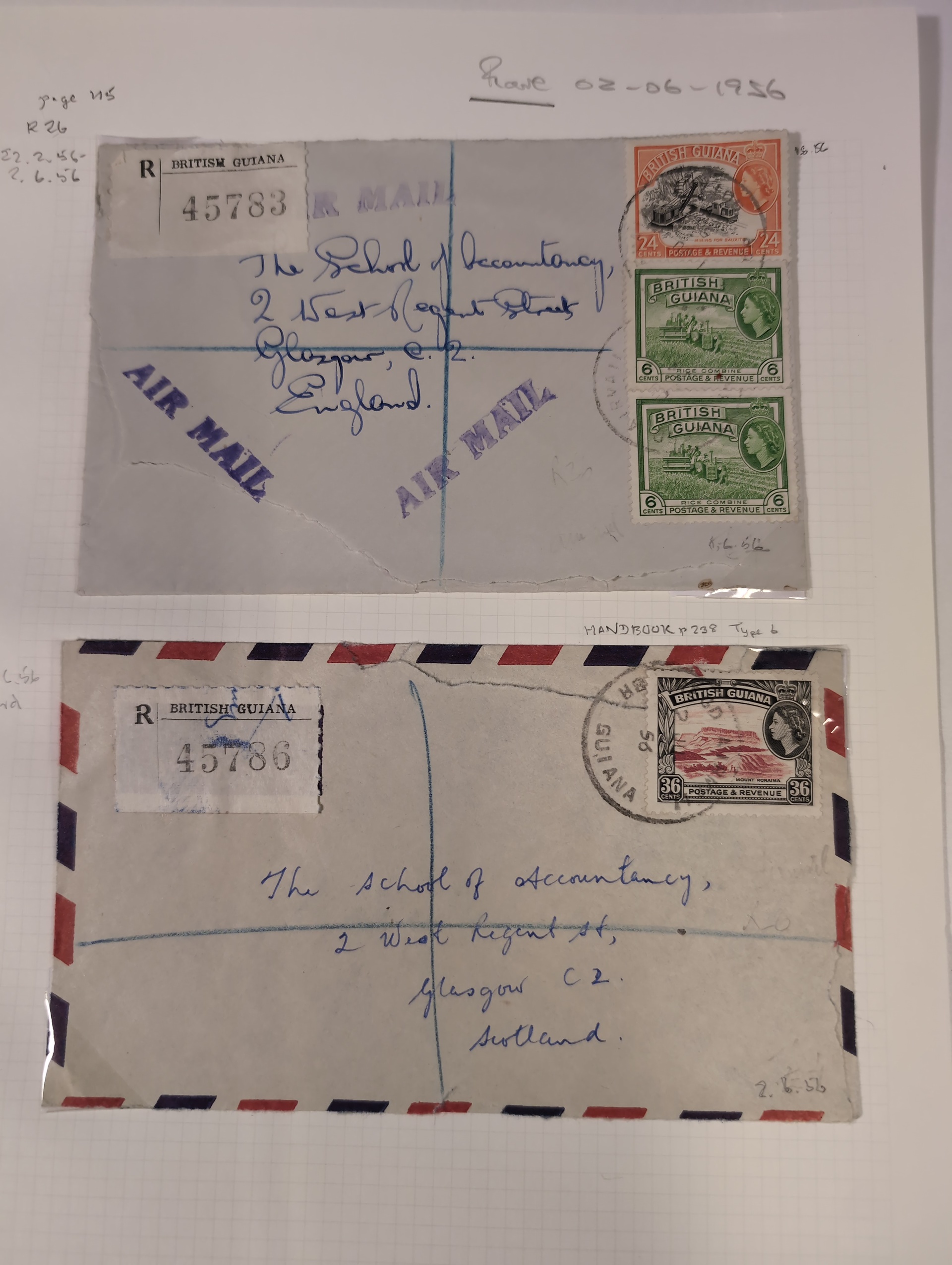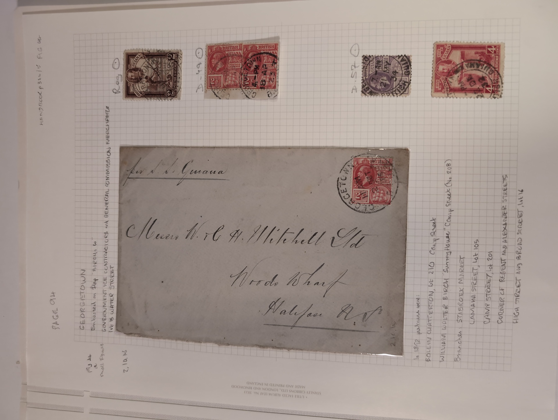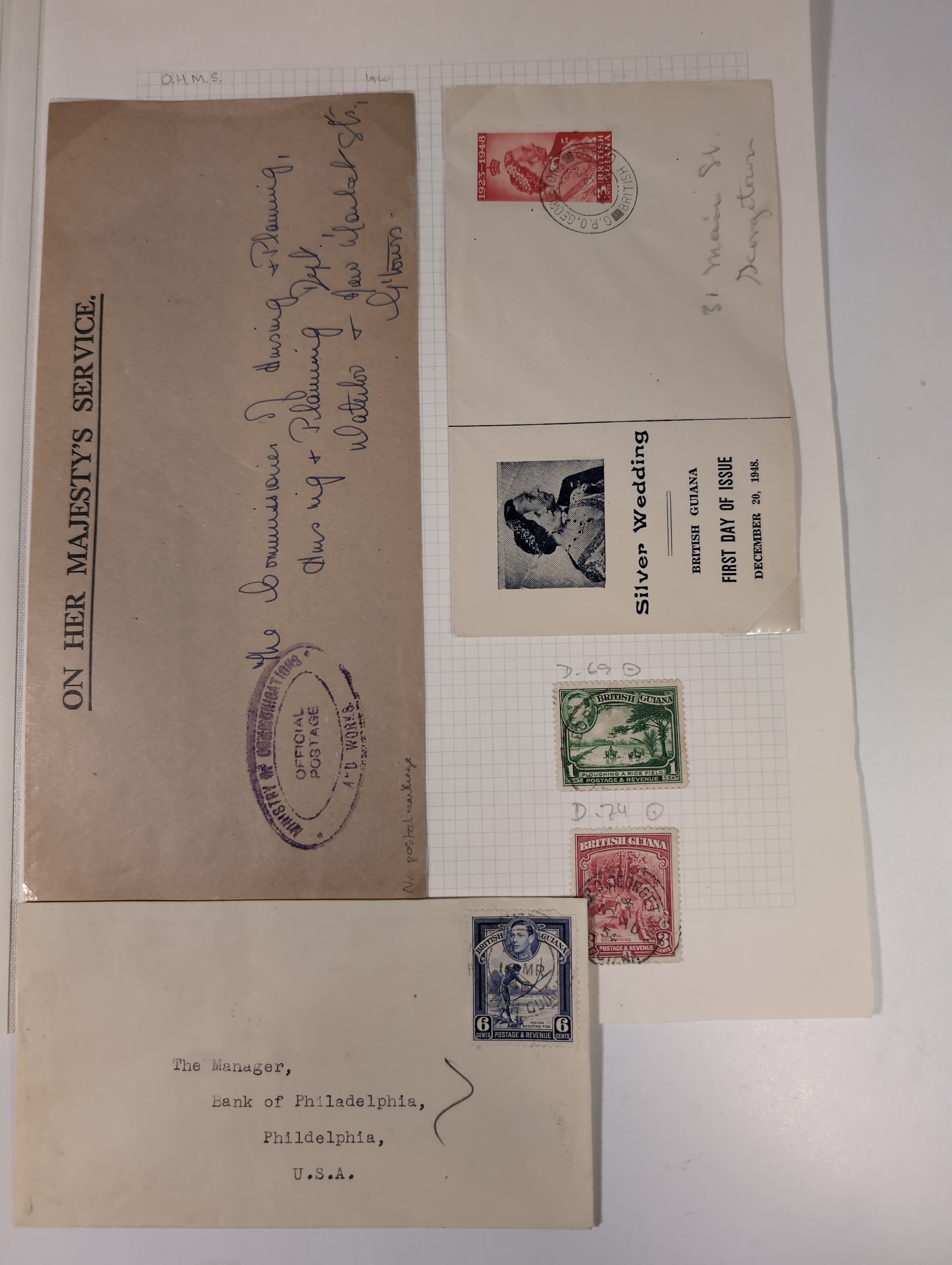 British Guyana. Collection covers 1916–1948 on leaves. Two early postcards and 10 covers. Stamps with cancel interest. The entire lot is presented at www.philea.se. Mostly good quality. (12 Covers+24 stamps)