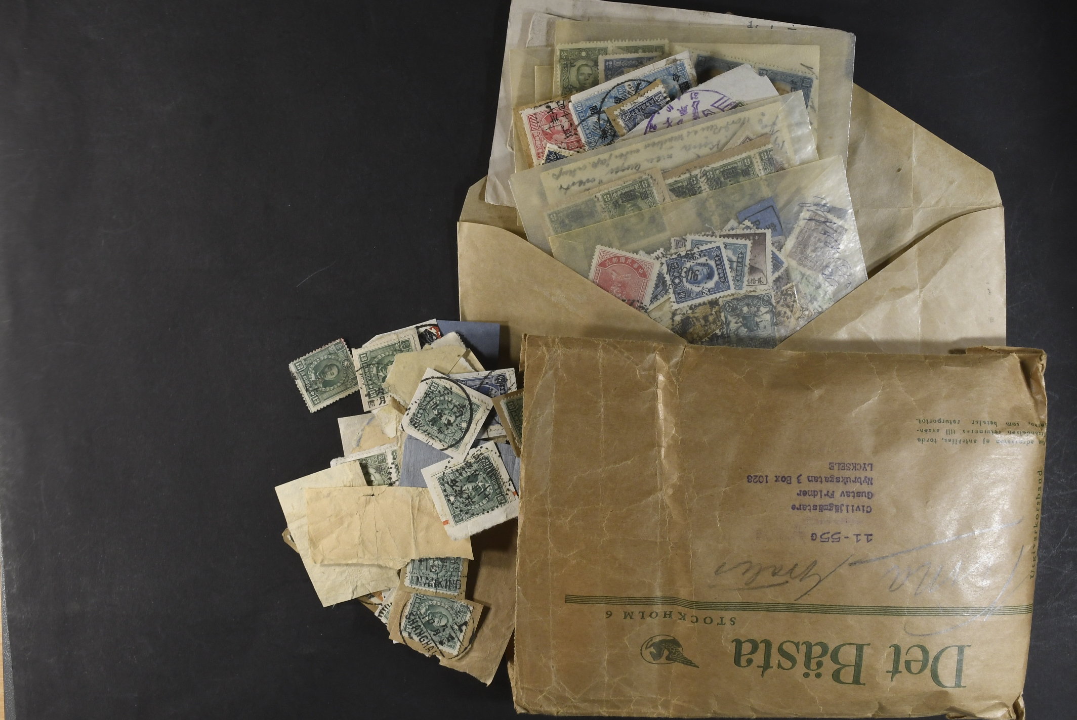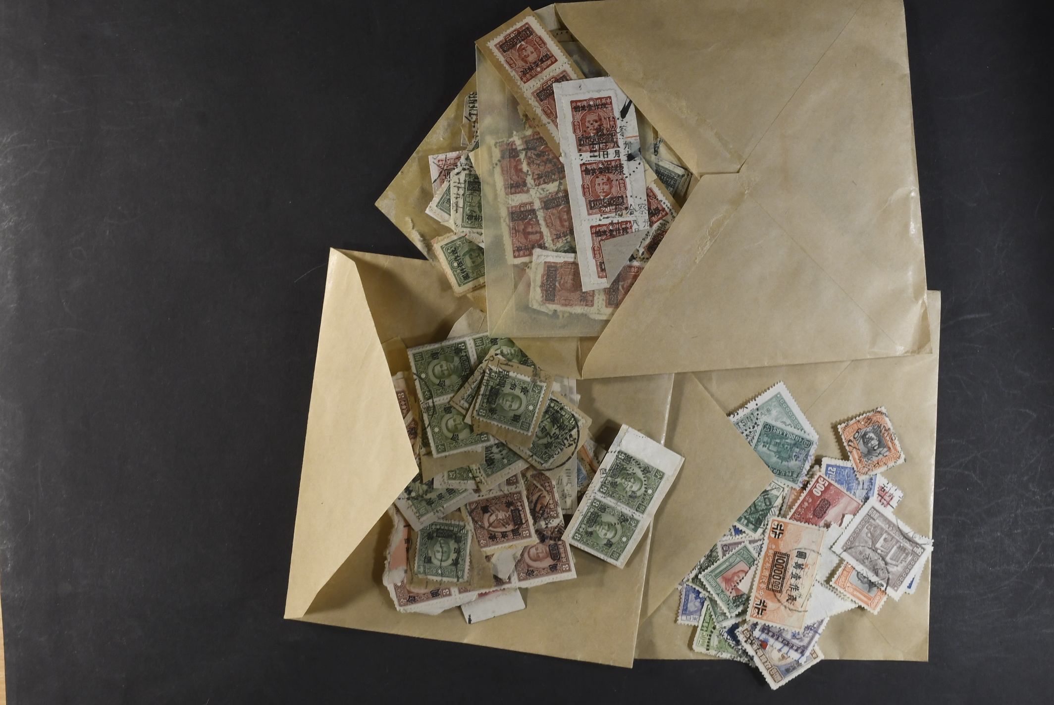China, R.O.C. Used. Box with early papercuts 1920–1940s. Nothing expensive identified, but many different stamps and cancels – seldom seen.