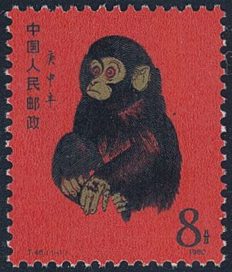 China, People’s Republic. Michel 1594 ★★, 1980 Year of the Monkey 8 f red/black with original invoice from China Stamp Export Co, and J.54 from the same bill. Superb quality. EUR 2800.