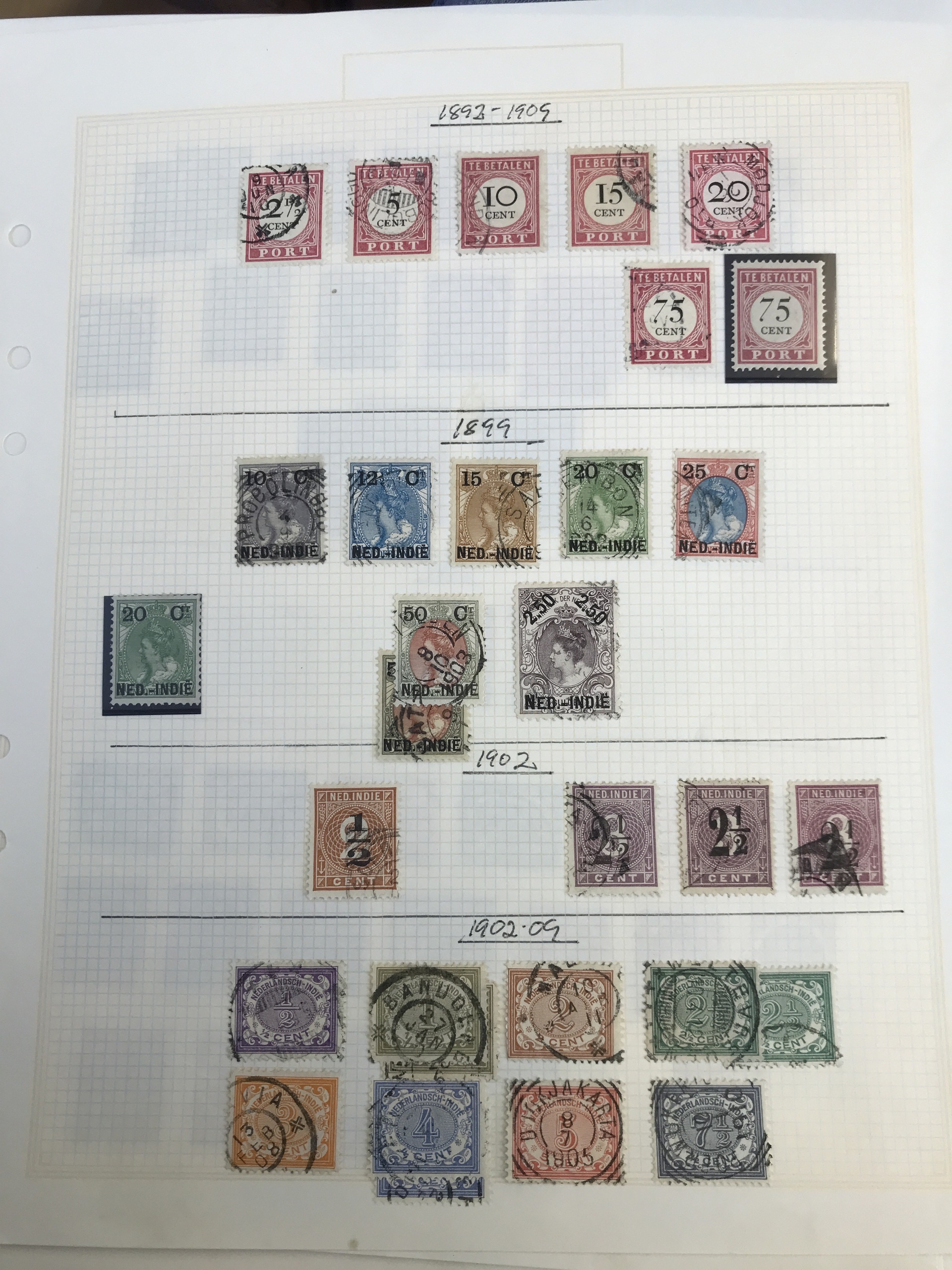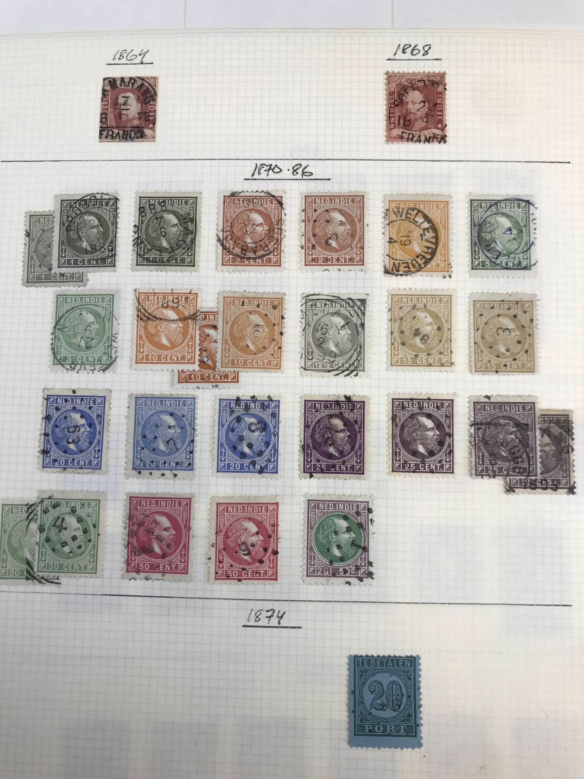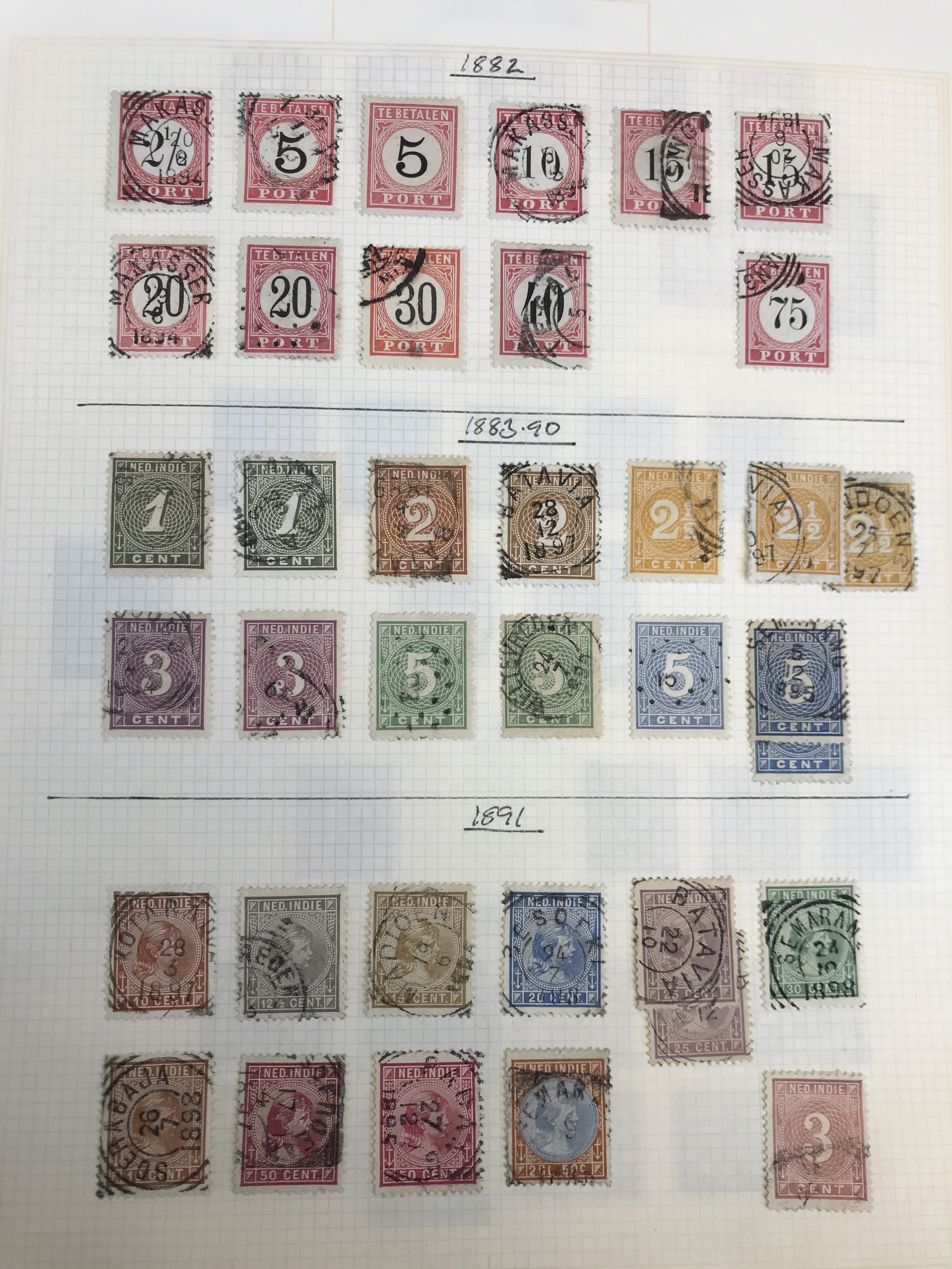Dutch East Indies. Mostly used. Collection 1864–ca. 1970 on leaves. Containing e.g. Mi1–55, 61–78 and some better back-of-the-book, etc. Please see a selection of scans at www.philea.se. Mostly fine quality. (800)