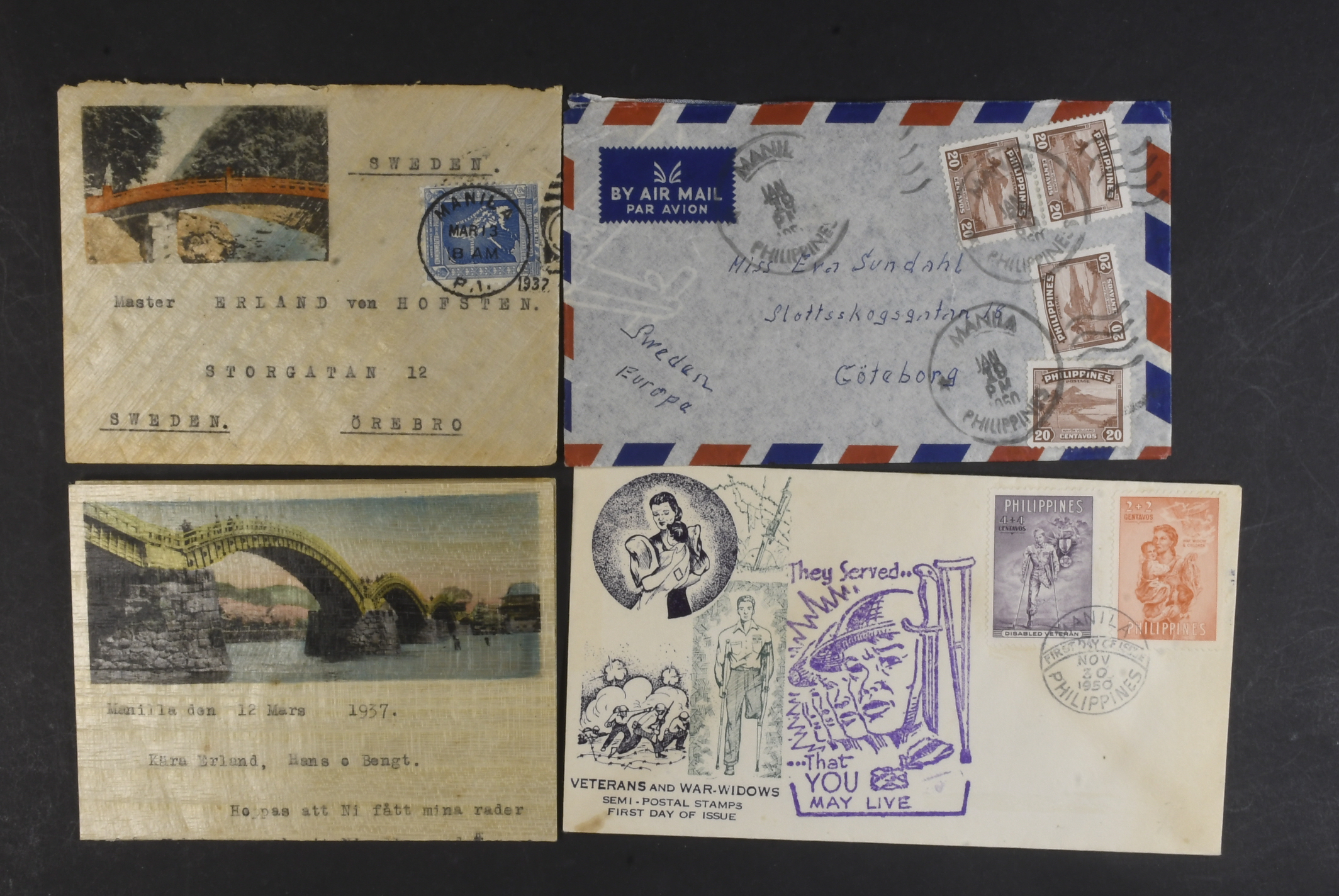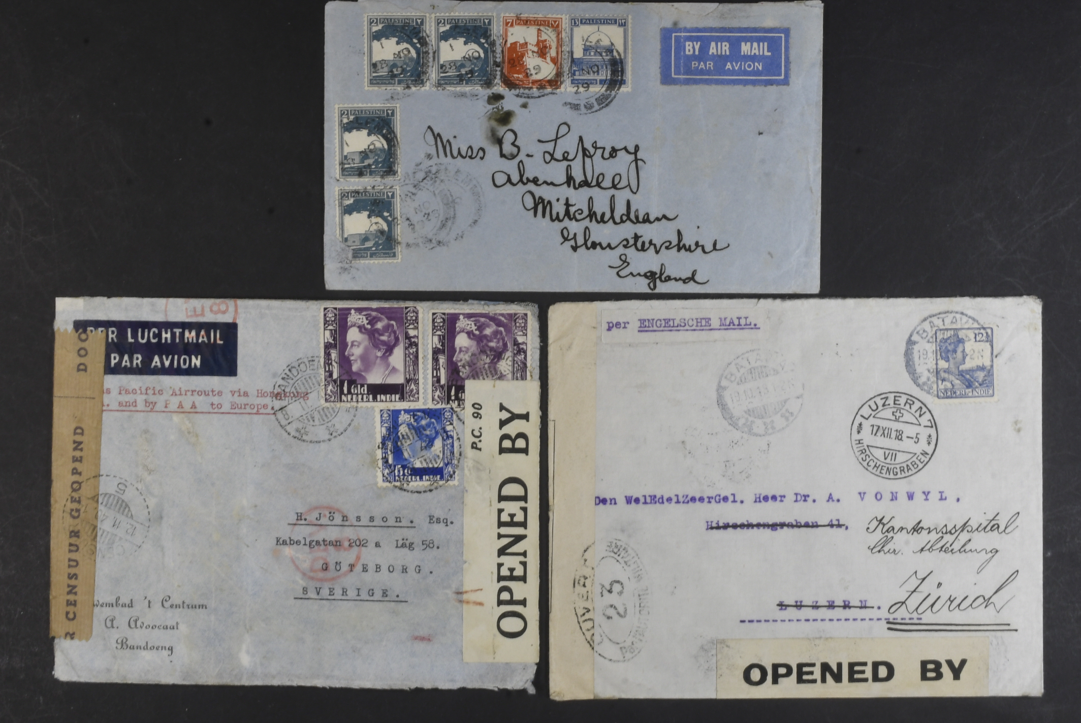 Dutch East Indies. Covers. Also Palestine and the Philippines. Interesting mix. The entire lot is presented at www.philea.se. (6)