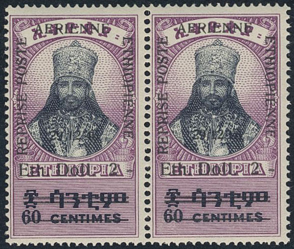 Ethiopia. Michel 224 ★★, 1947 Air mail service overprint $2 on 60 c lilac/blue-black in Pair. Scarce stamps. EUR 240