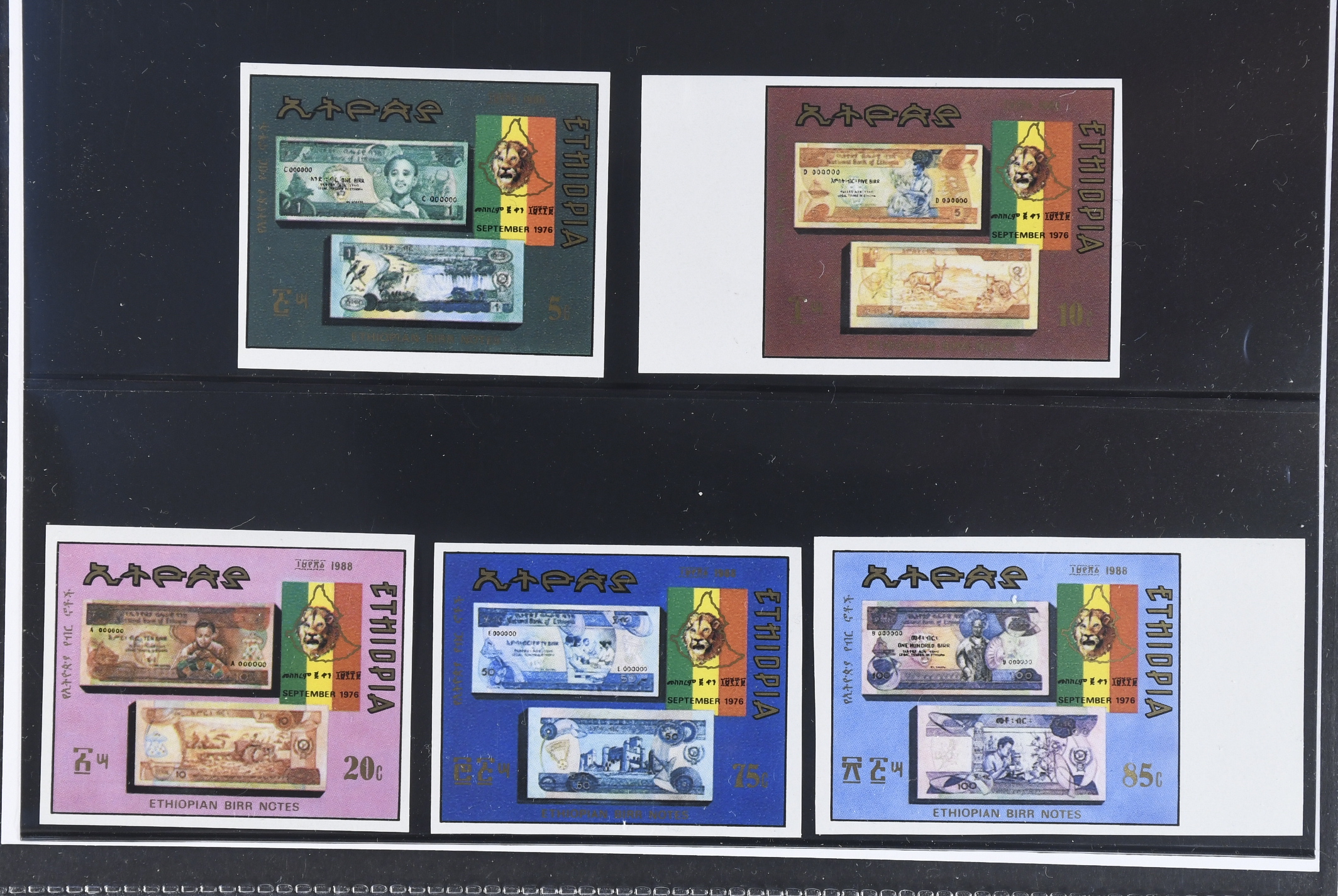 Ethiopia. Postage due Michel 1311–15 ★★, Bank Notes set. Imperforated, only 150 sets issued. Not valued in Michel.