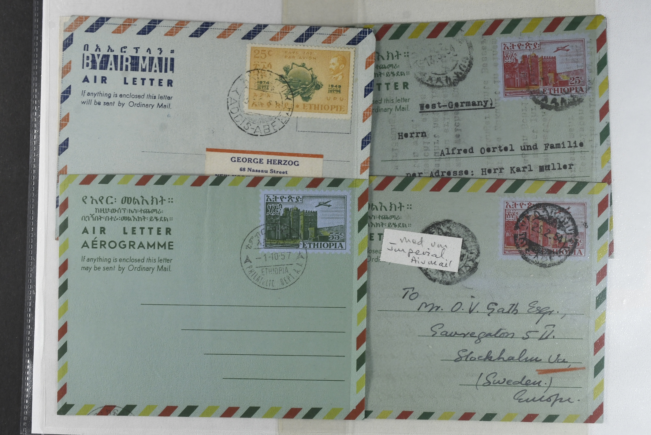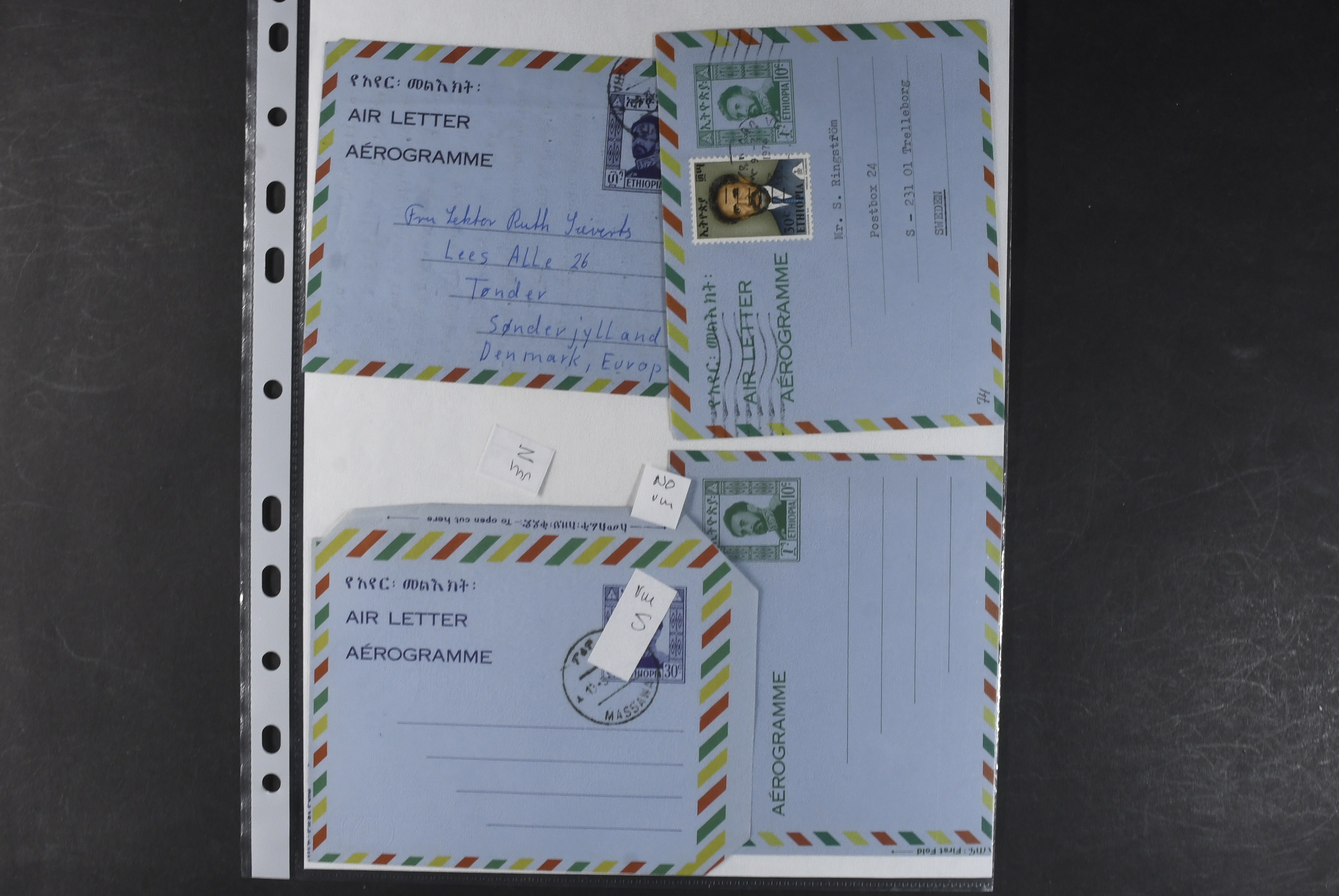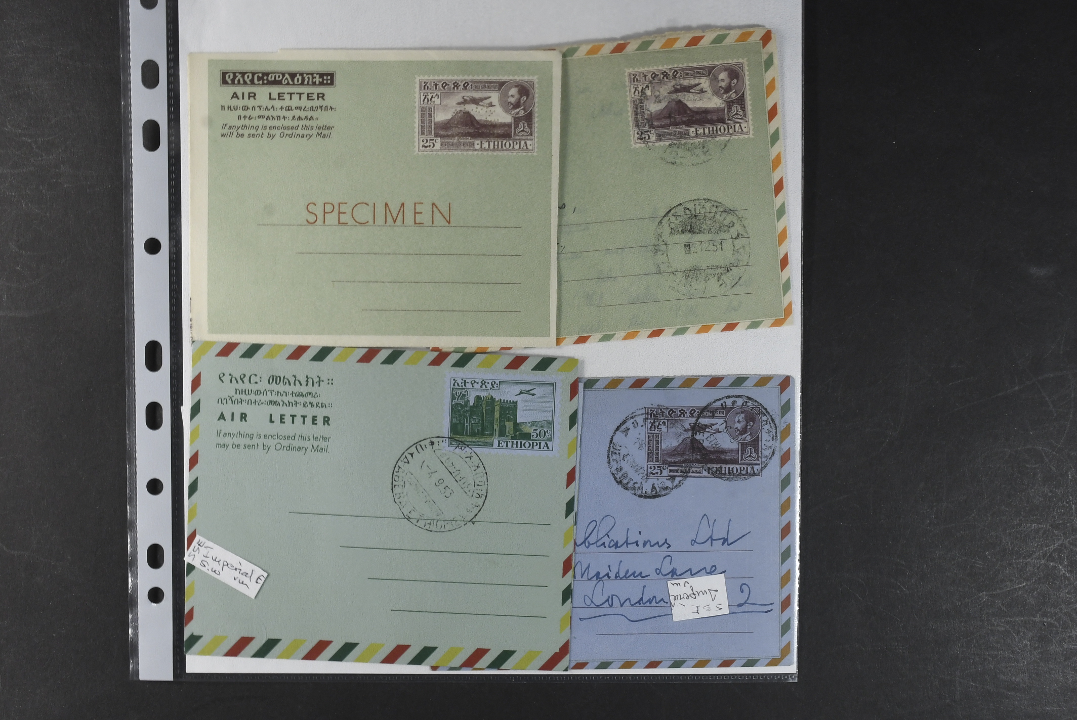 Ethiopia. Postal stationery, collection 1950s–1970s. Air Letters, incl. two Specimen, two with missing colours, one unofficial and a couple of postal cards. The entire lot is presented at www.philea.se. Mostly fine quality. (25)