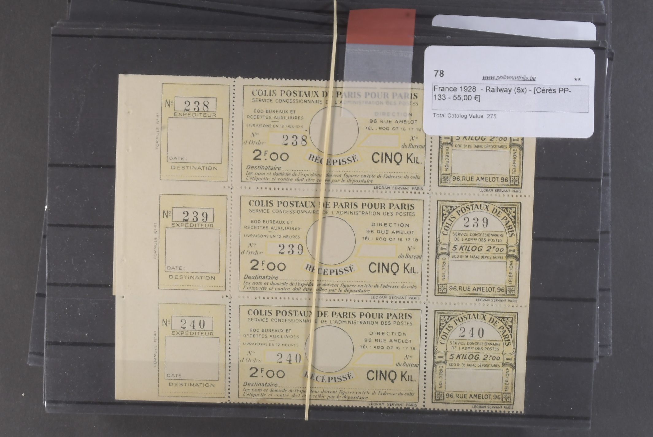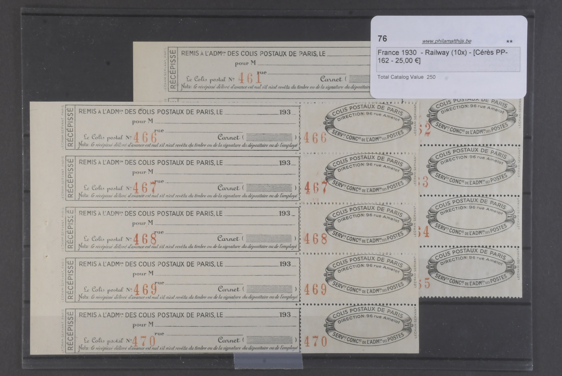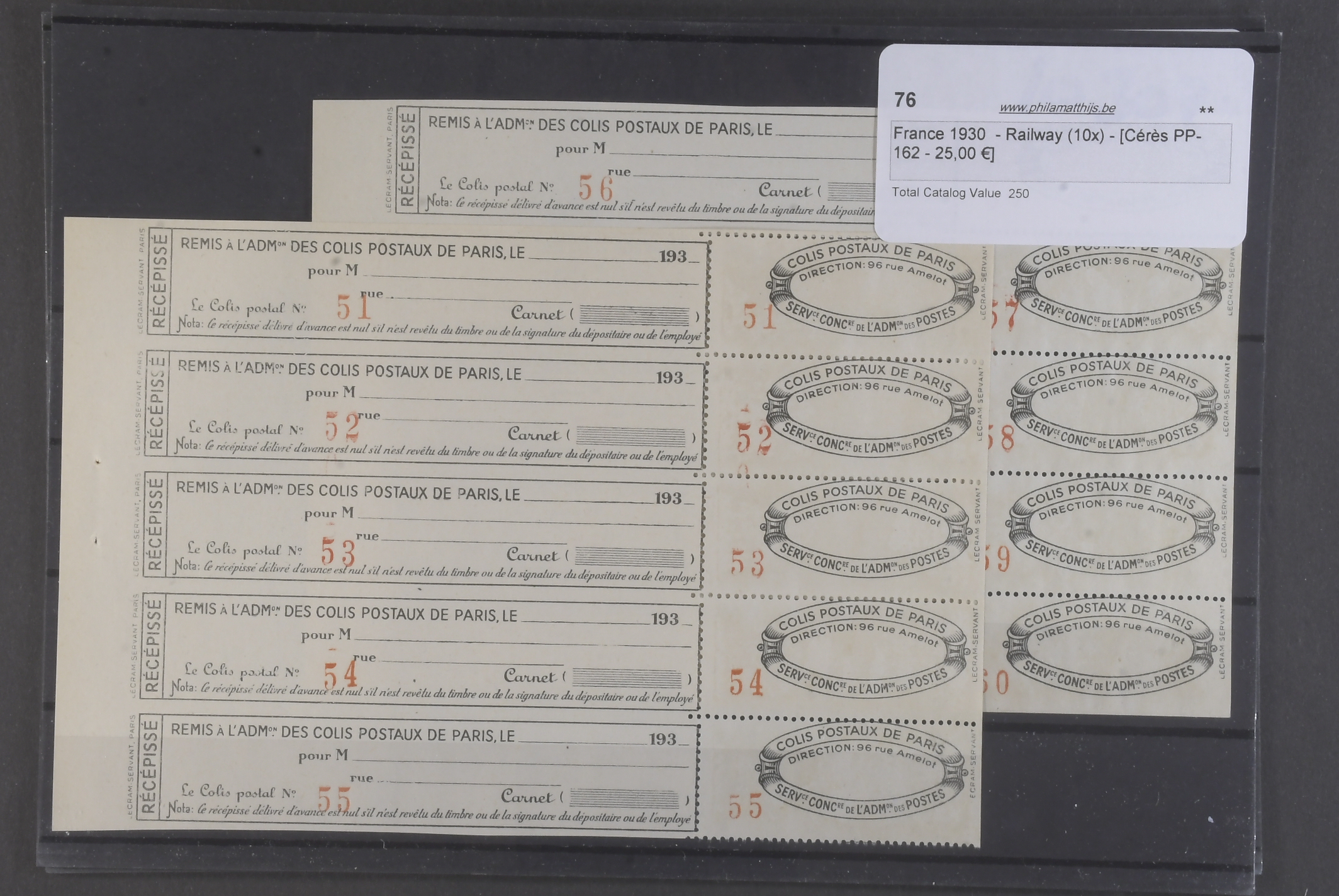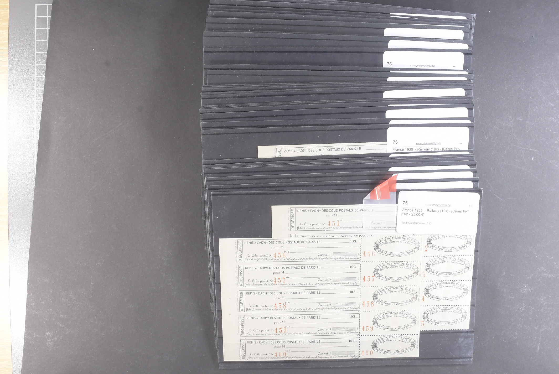 France. ★★. Back of the book only, considerable duplication with anything relating to railways, as listed in the Ceres specialised catalogue,all in pristine condition MNH from 1919 to 1930 offered in tryptic format (x3 se-tenant). Everything is listed and catalogued, as far as we can tell there is a minimum of 40,000 euro, probably nearer 50,000 euro resale value. This is a most unusual holding, the likes of which you will very probably not see again. If you are a dealer this is a great opportunity particularly if you have the time to market this online. Much of this material is very seldom seen, offered intact as received.