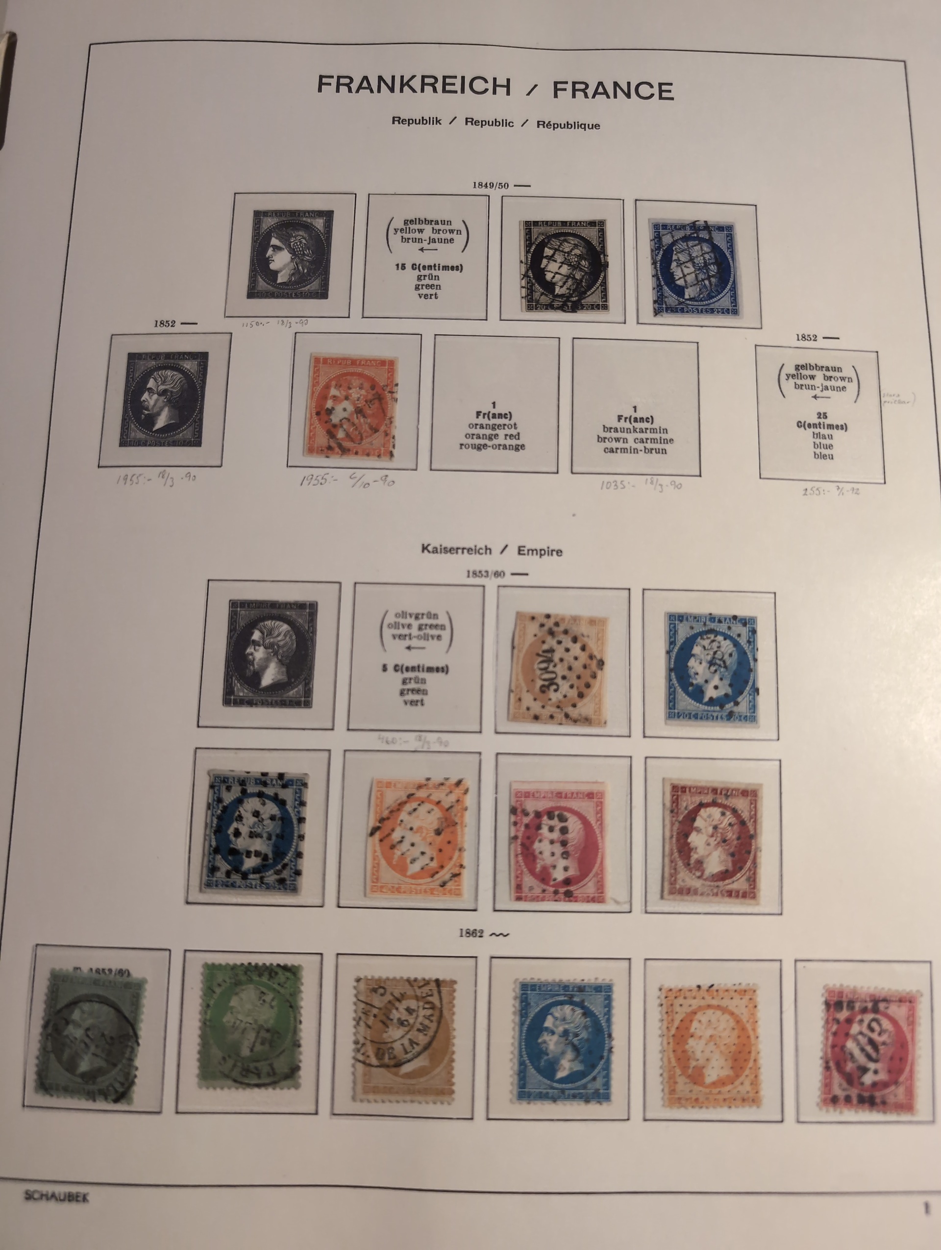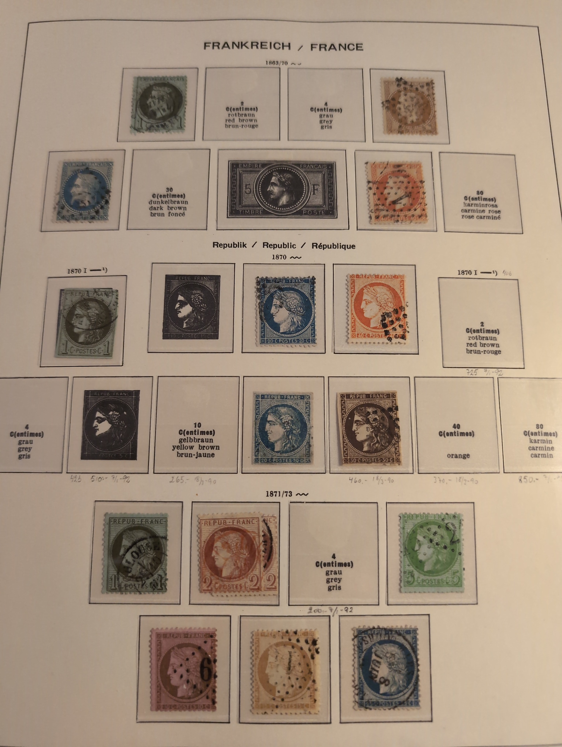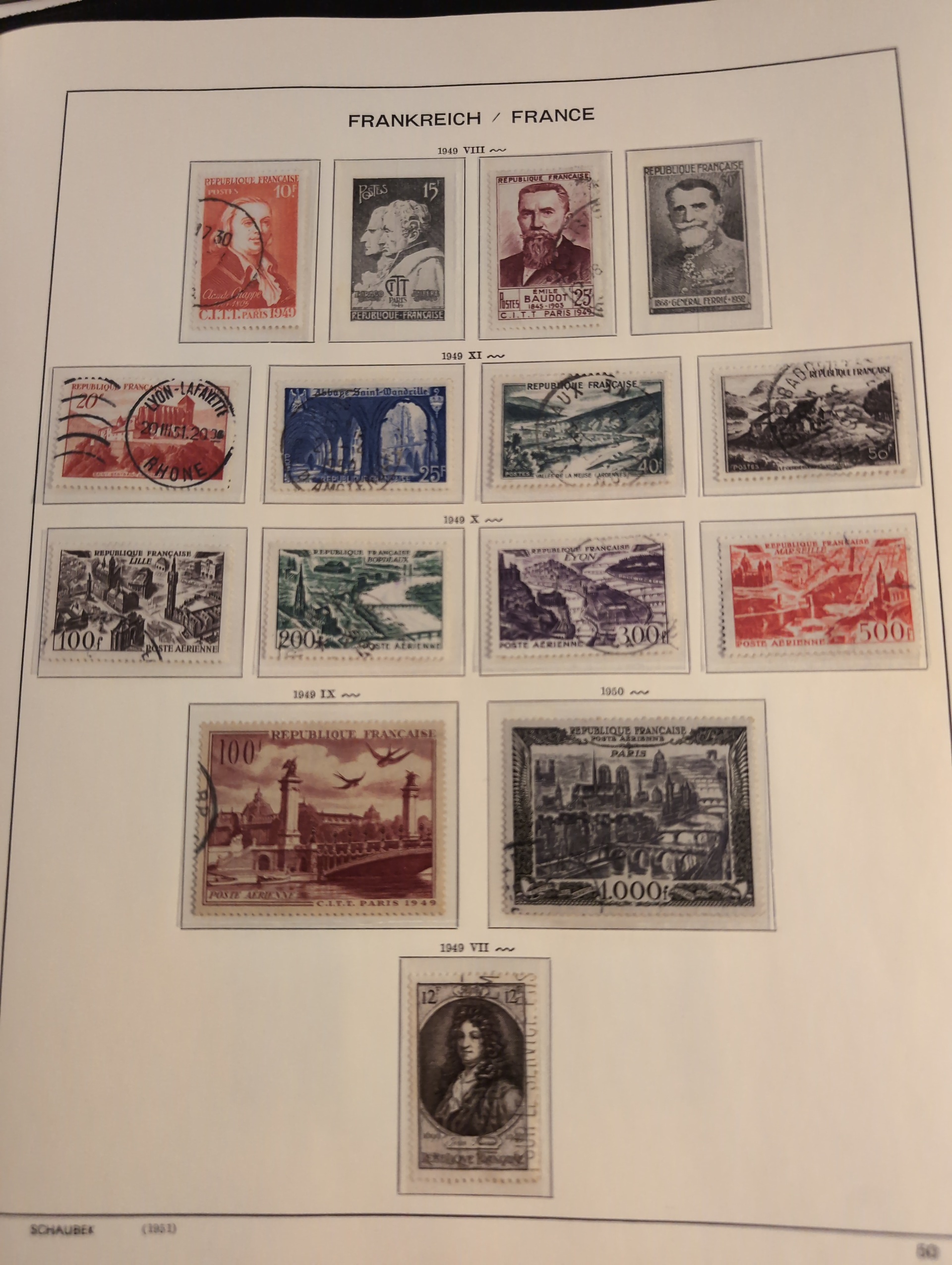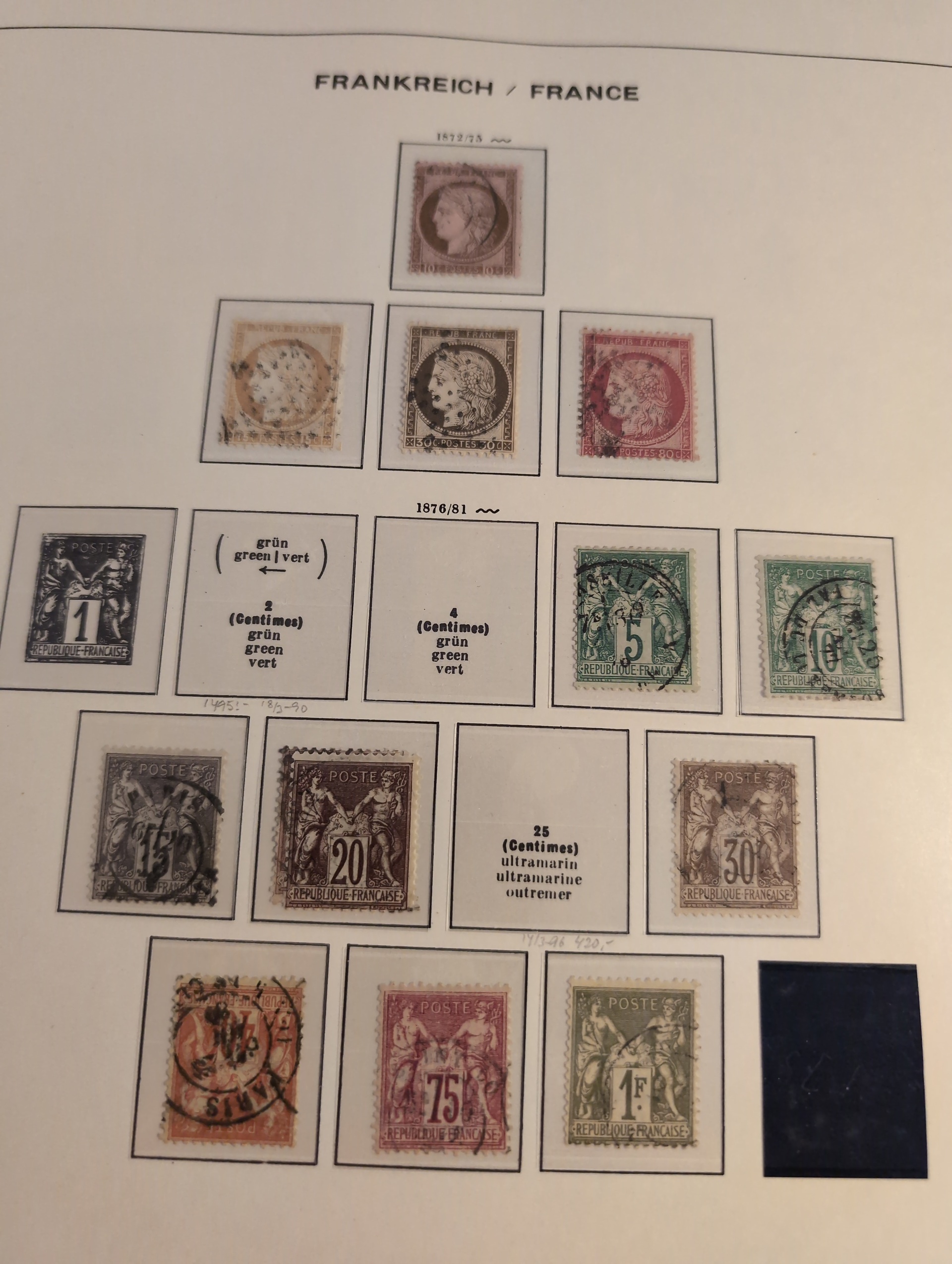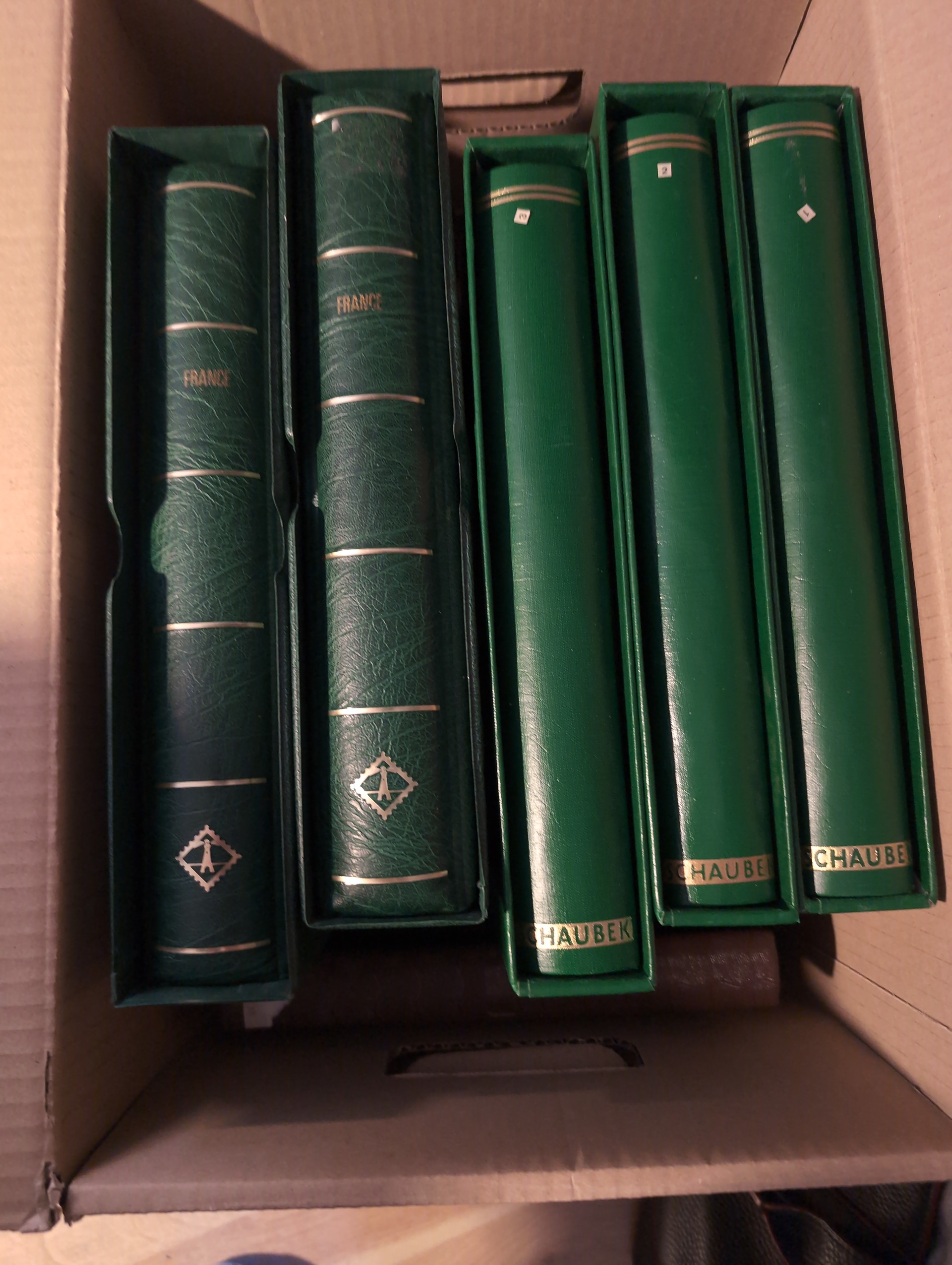 France. Collection mostly used 1849–1994 in small removal box. Collection in three Schaubekalbums 1849–1990 and two Leuchtturm albums 1965–1994. In the beginnig some good stamps. Well filled from 1880s with several better stamps and sets. Please see a selection of scans at www.philea.se. In the beginning mixed quality, later fine. Approx. 15 kg. (1000s)