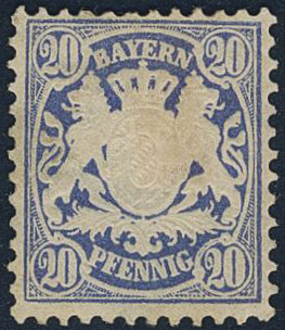 Germany, Bavaria. Michel 40c ★, 1876 Coat-of-arms on Ornament 20 pf ultramarine wmk wavy lines. EUR 220