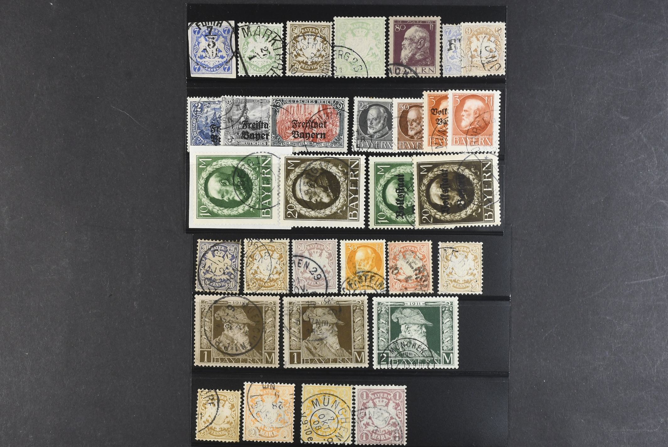 Germany, Bavaria. Used 1868–1919. All different, e.g. Mi 21, 32, 59, 70, 85 I, 108–09, 132–33a. Mostly good quality. Mi € 665 (31)