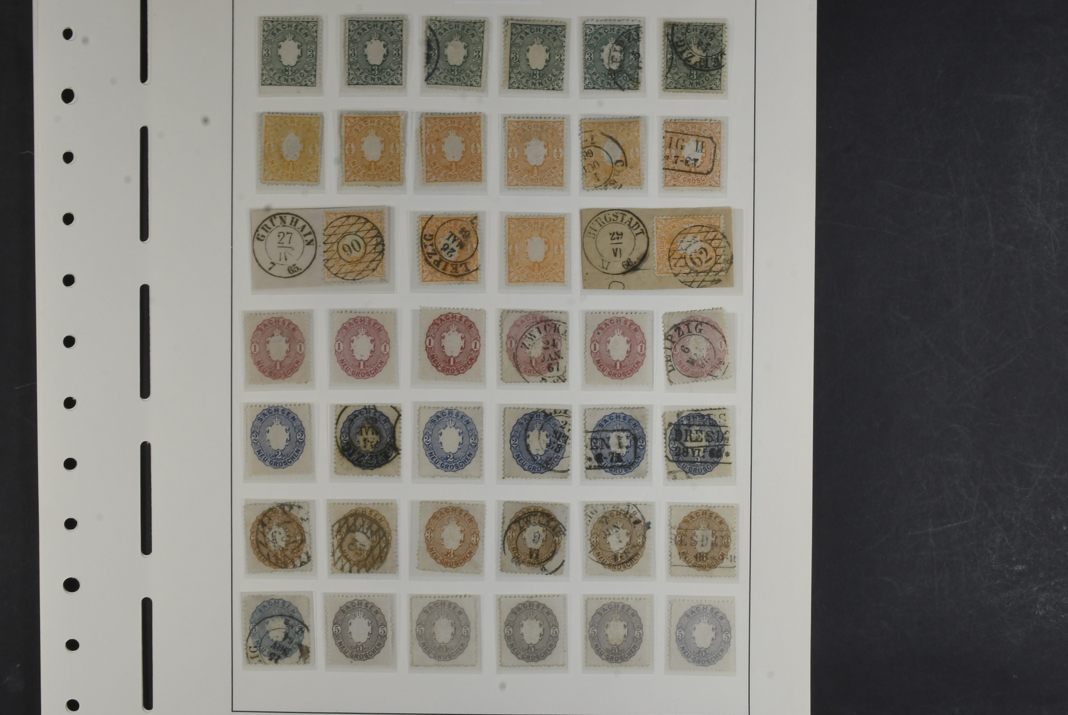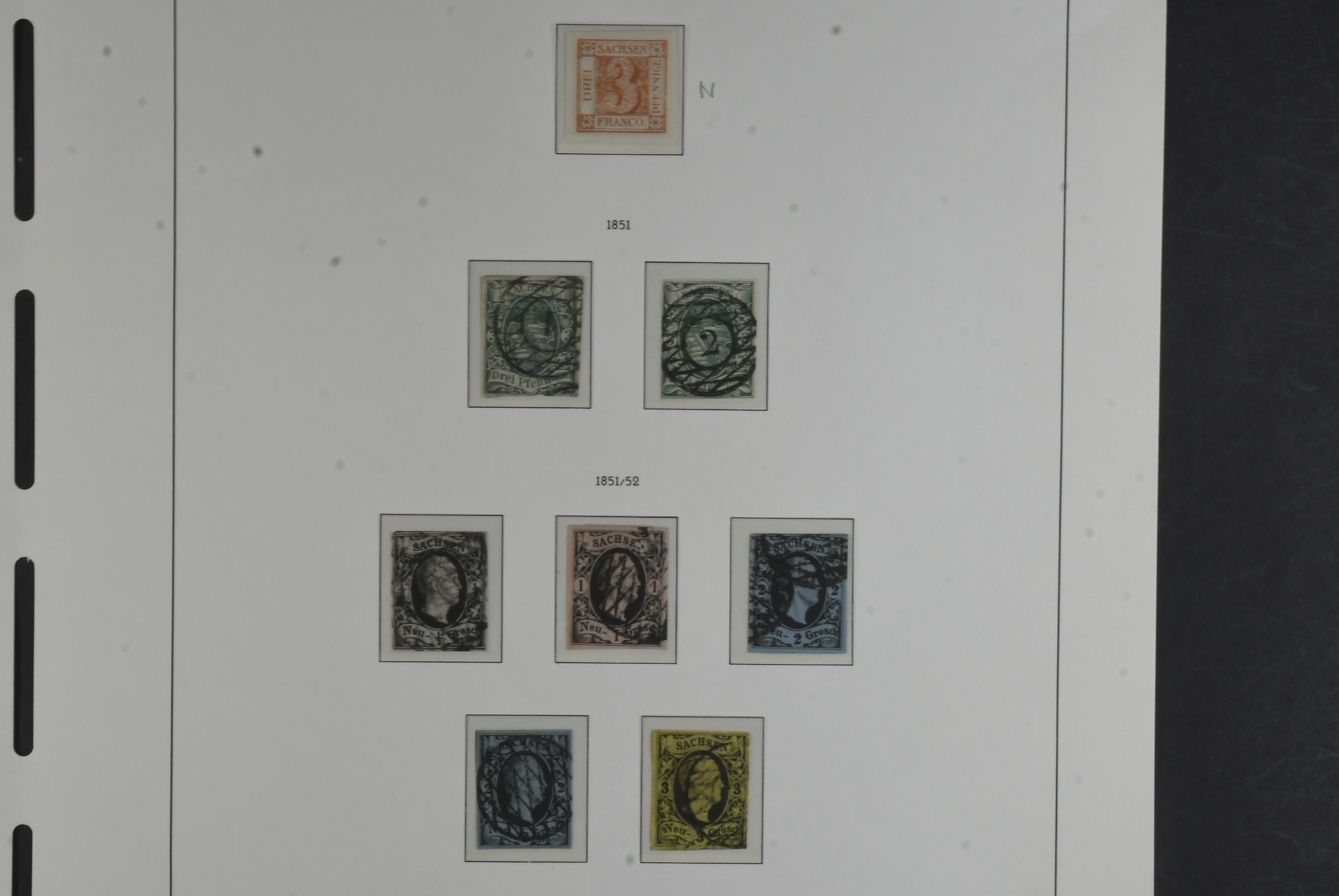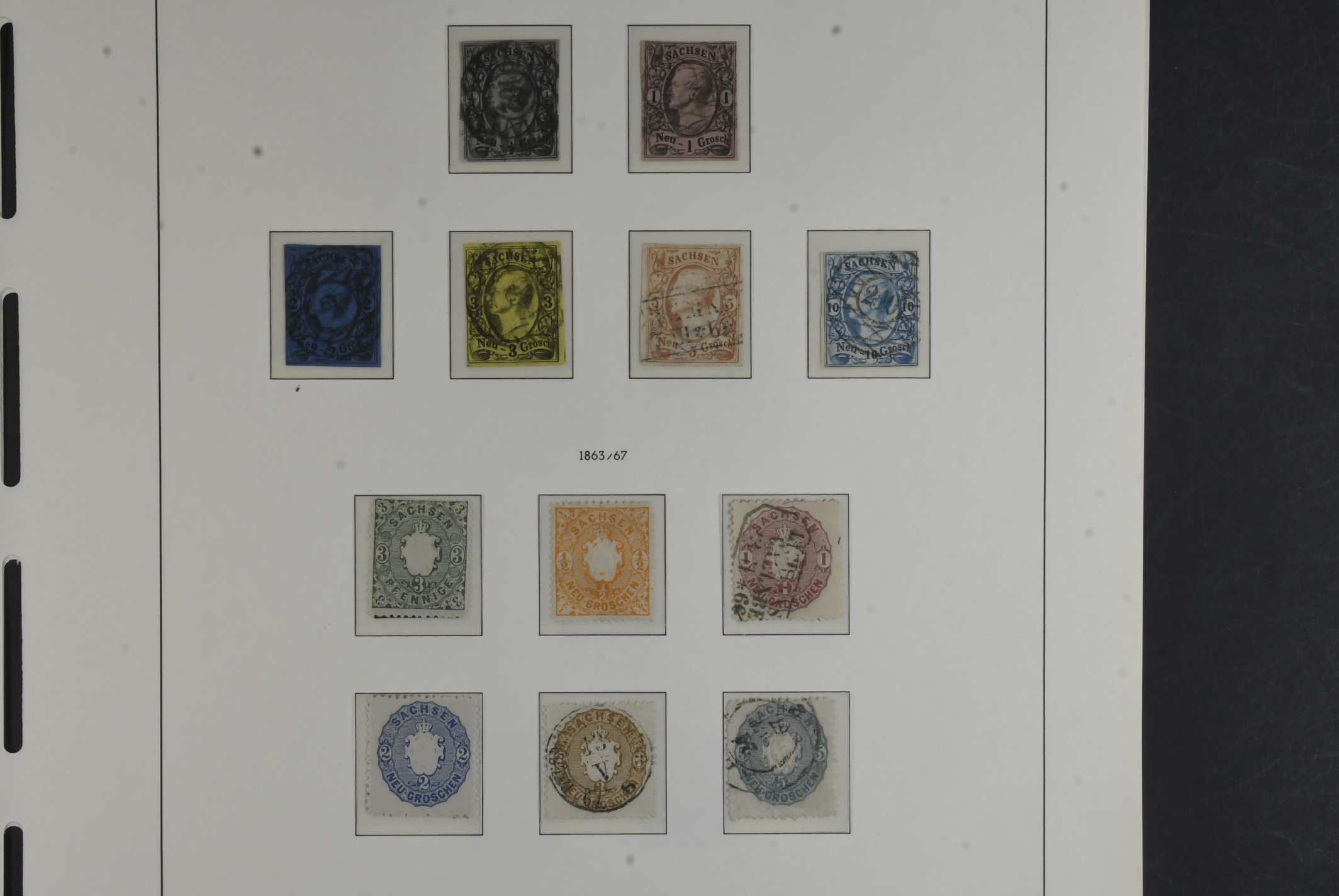 Germany, Saxony. Collection ★/⊙ 1850–1867 on leaves. Complete with many extra stamps mixed mint and used. Mi 1 is a reprint and including Railway freight stamps. Please see a selection of scans at www.philea.se. Somewhat mixed quality. (96)