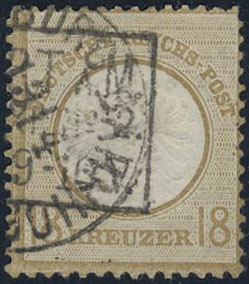 Germany, Reich. Michel 28 used, 1872 Large Coat-of-arms 18 Kr dull ochre. Two cancels, fine. EUR 2800