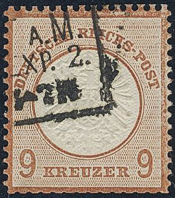 Germany, Reich. Michel 30 used, 1874 Large Coat-of-arms 9 on 9 Kr orange. High perfs in top and low perf at bottom. EUR 650