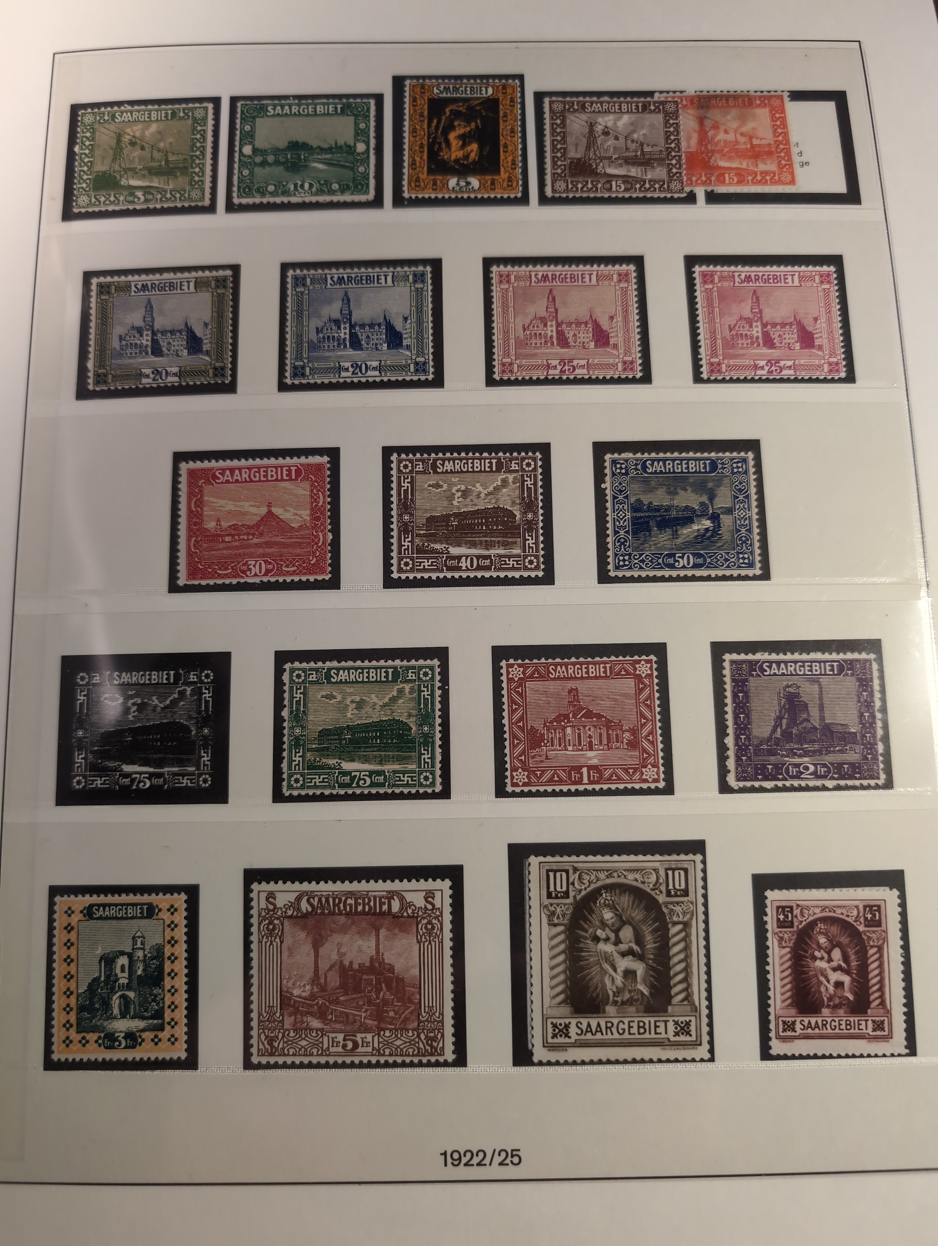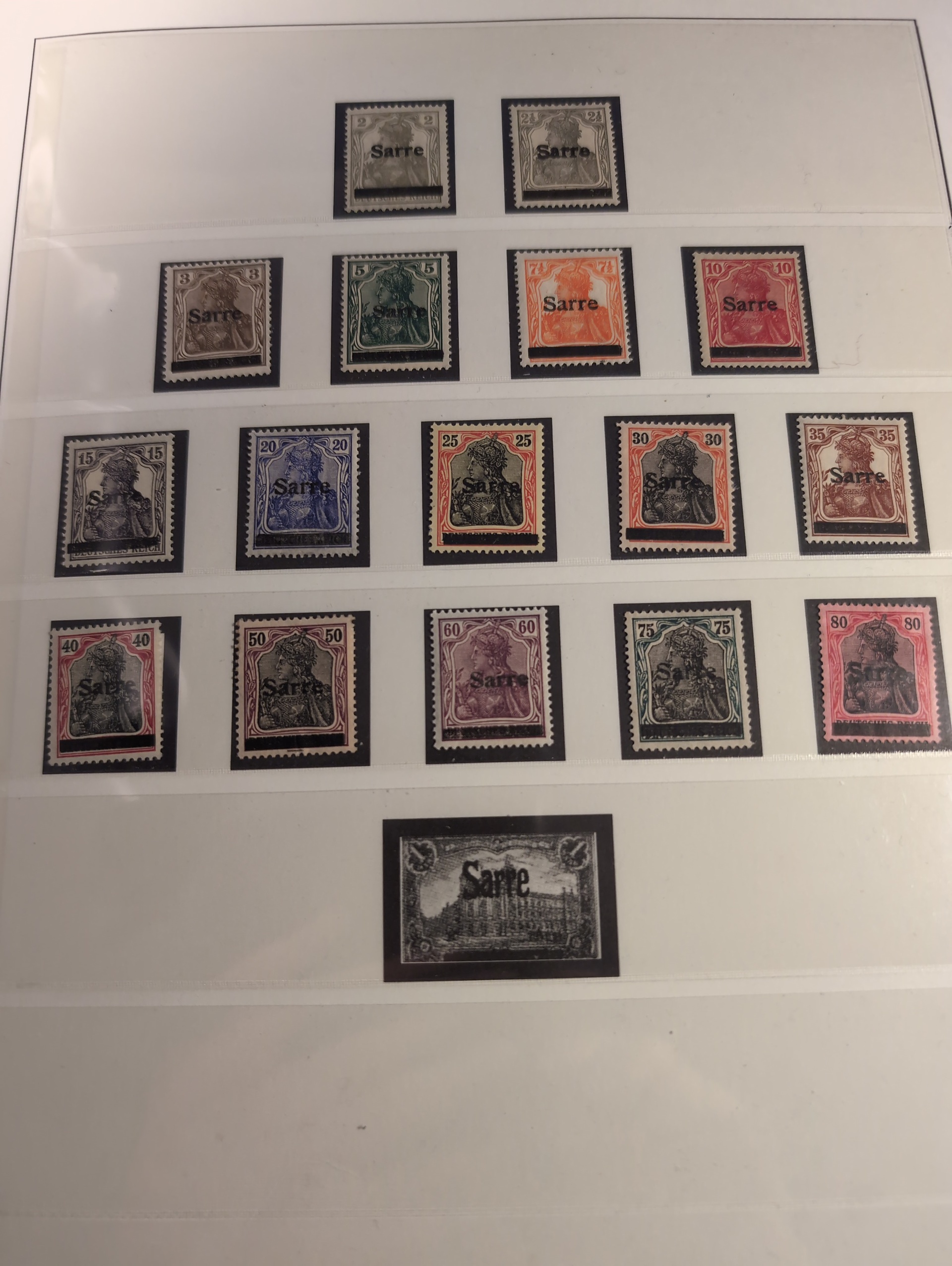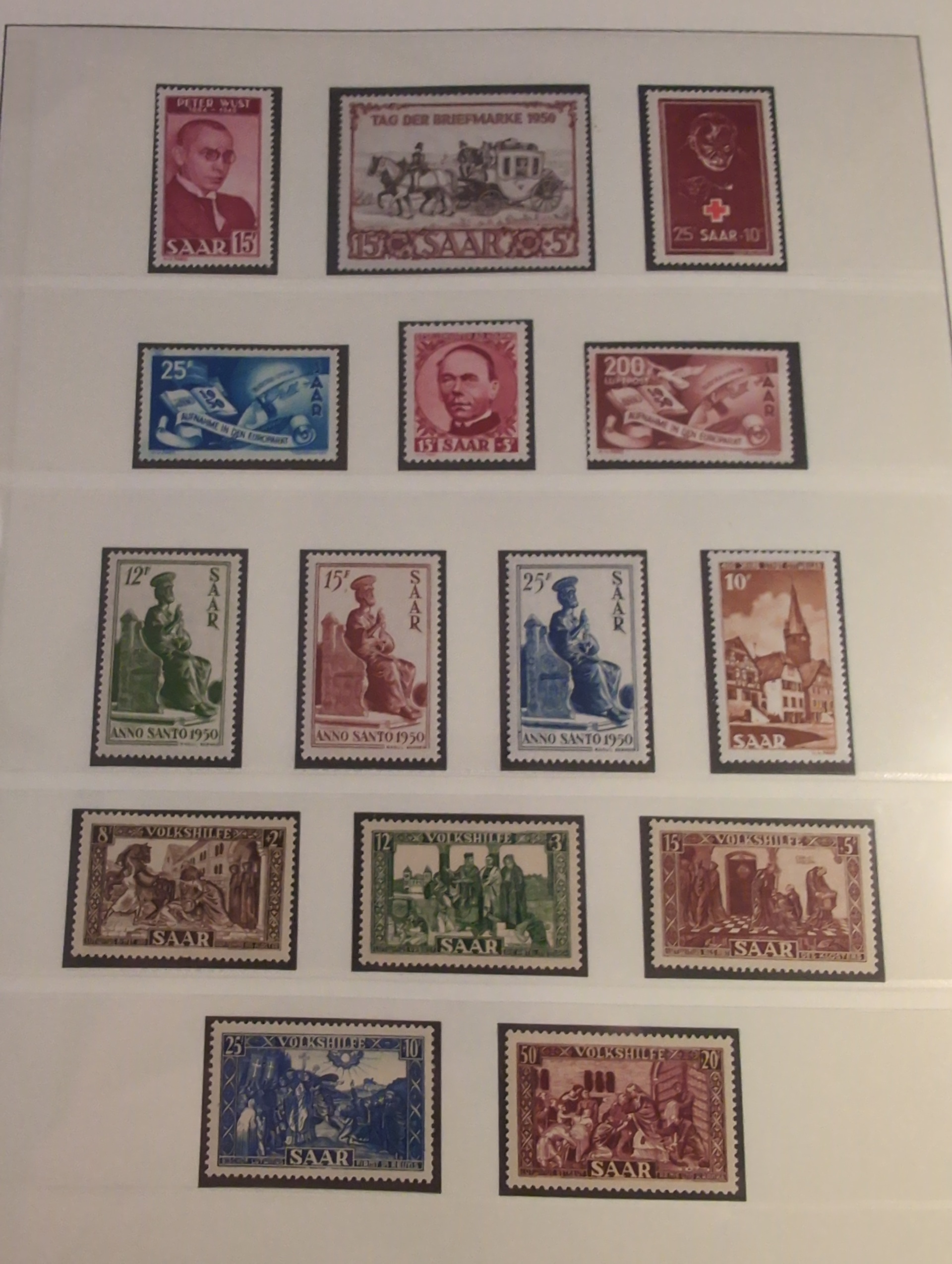 Germany, Saar. Collection ★★/★ 1920–1959 in Lindner album with stamp mounts. Well filled with many better stamps. Saargebiet mostly mint but also a few NH and sadly some with 'postfrisch' hinges. Saarland almost complete just missing Mi bl2. Majority is NH but a few hinged have been spotted. Bl. 1 is signed C. Ney (high) and have disturbed gum. Please see a selection of scans at www.philea.se. Somewhat mixed quality. (ca. 400)
