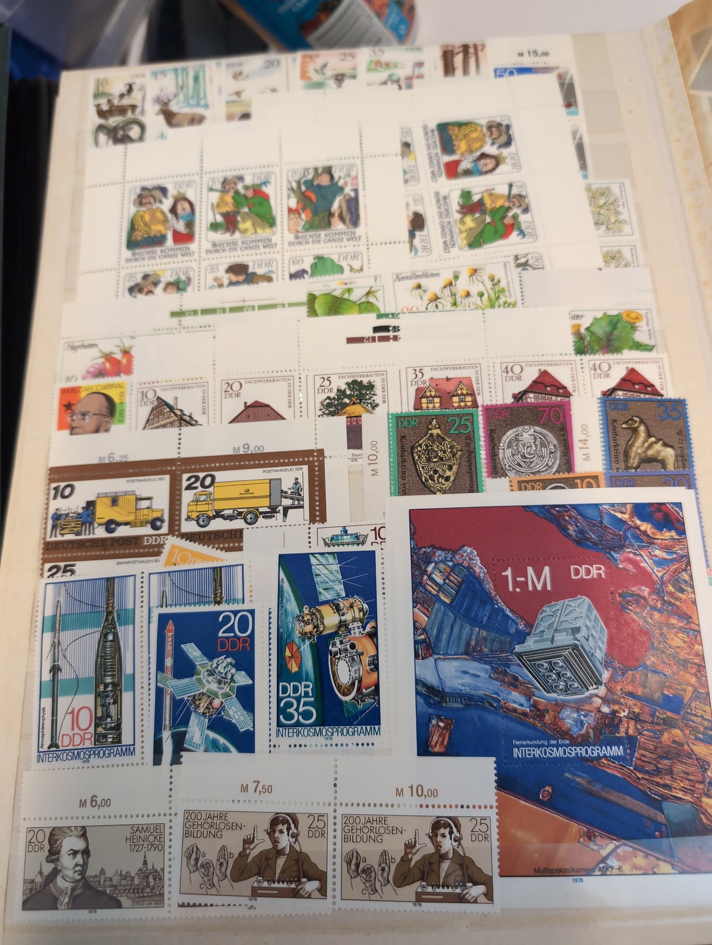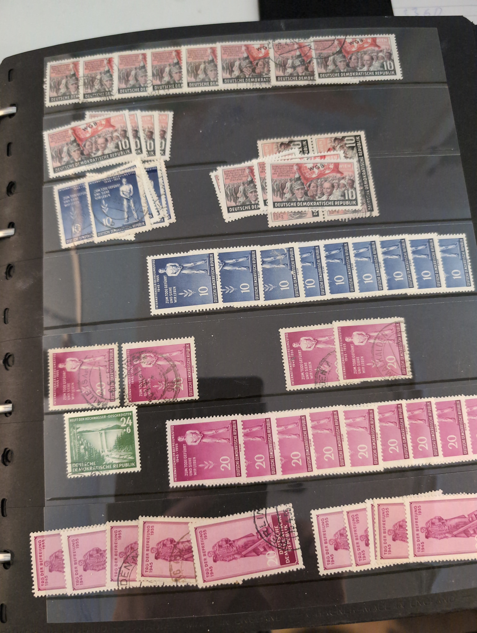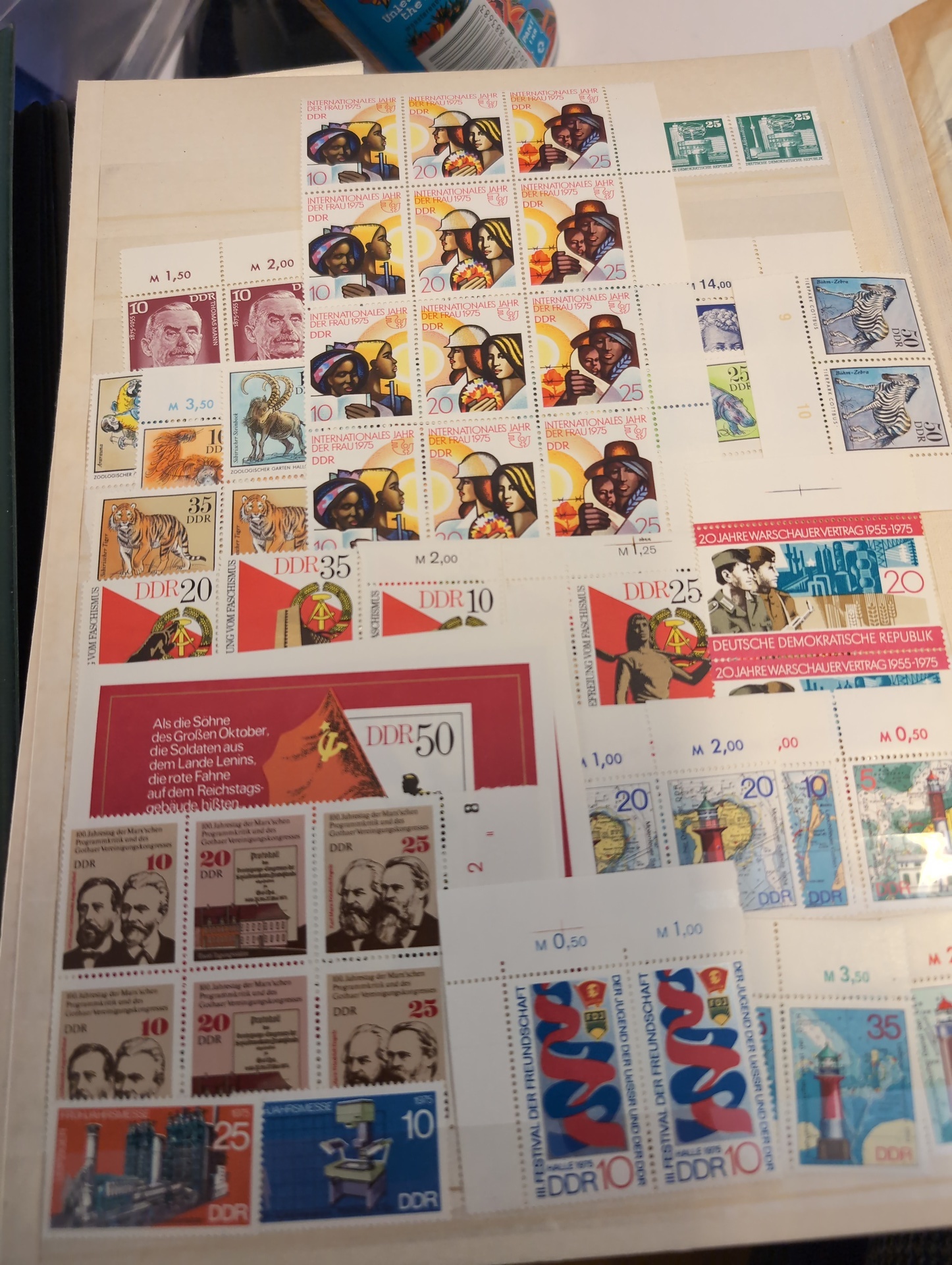 Germany, GDR (DDR). Accumulation ★★/⊙ 1955–1979 in box. One thick visir album crammed with used and ** stamps. Two stockbooks with mostly ** in units incl. many blocks of four. Included is also some Berlin ETB. Mostly good quality. (1000s)