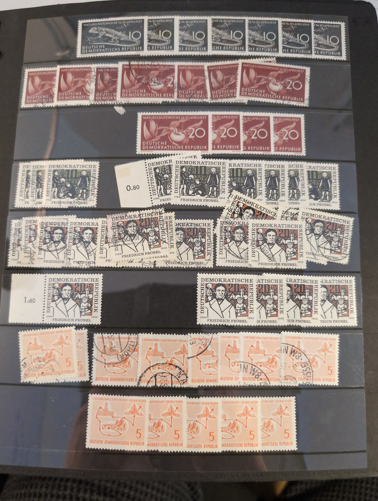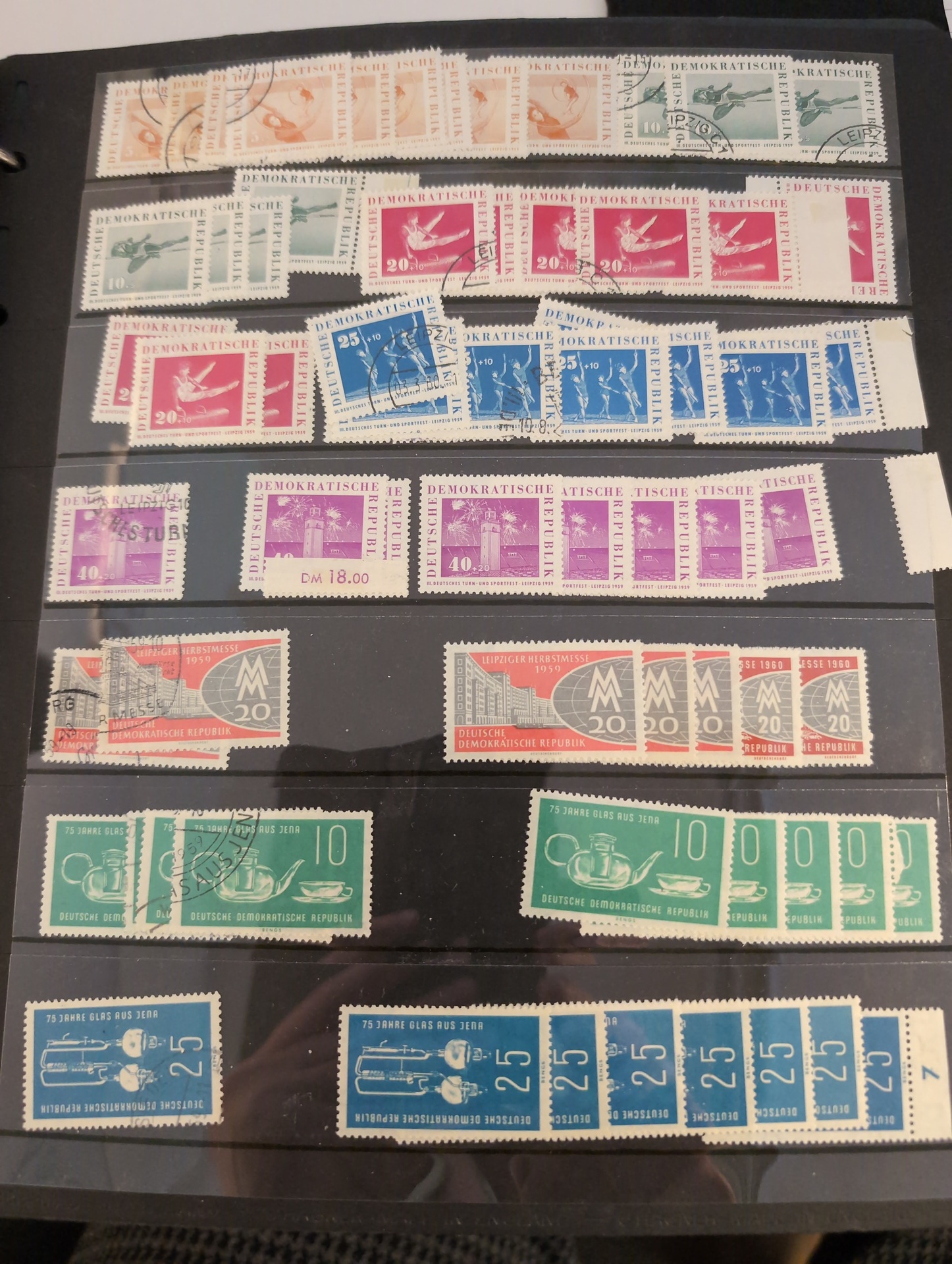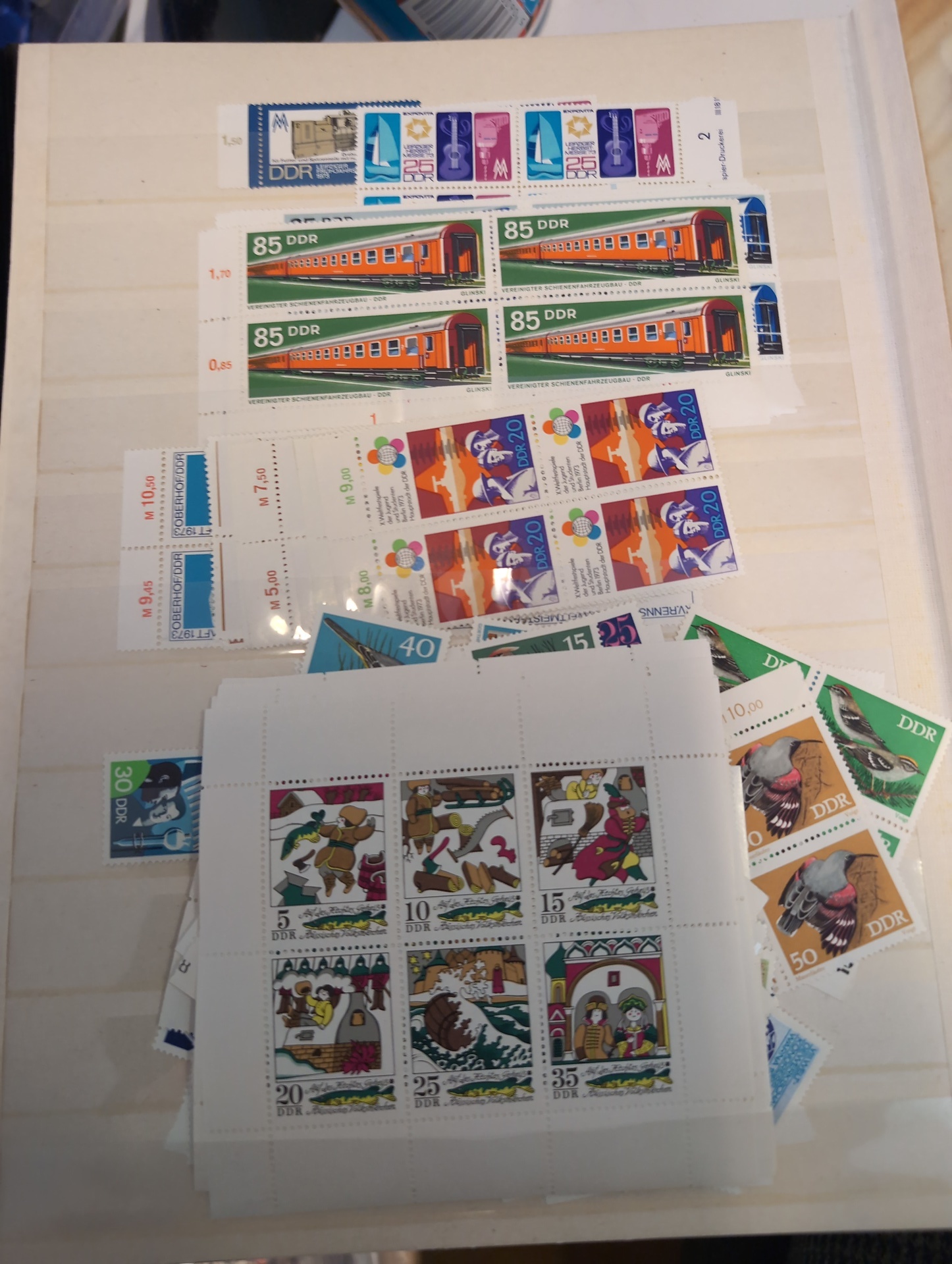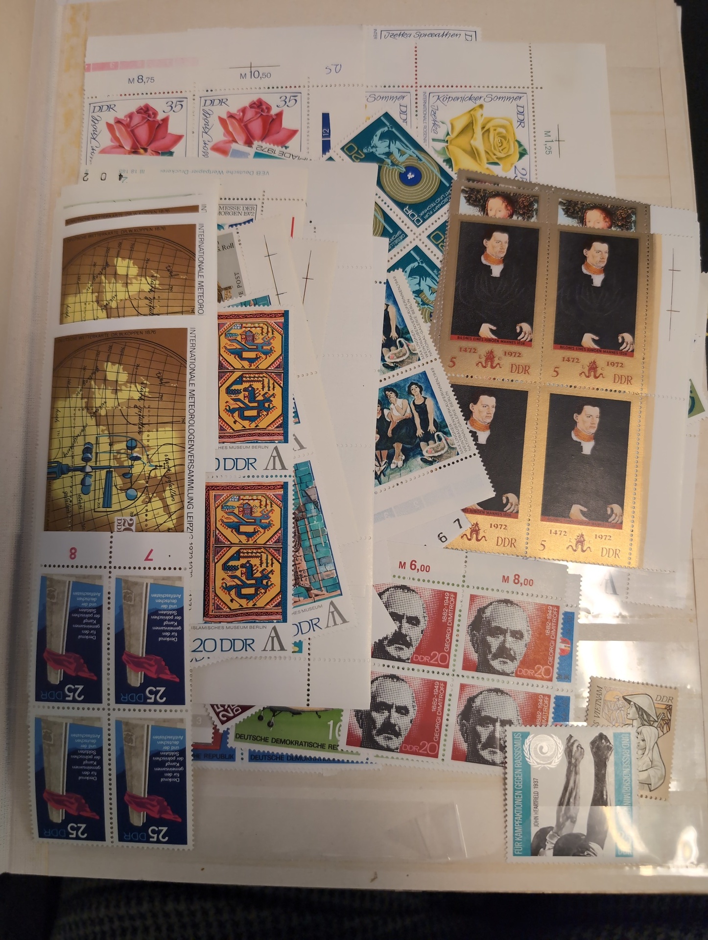 Germany, GDR (DDR). Accumulation ★★/⊙ 1955–1979 in box. One thick visir album crammed with used and ** stamps. Two stockbooks with mostly ** in units incl. many blocks of four. Included is also some Berlin ETB. Mostly good quality. (1000s)