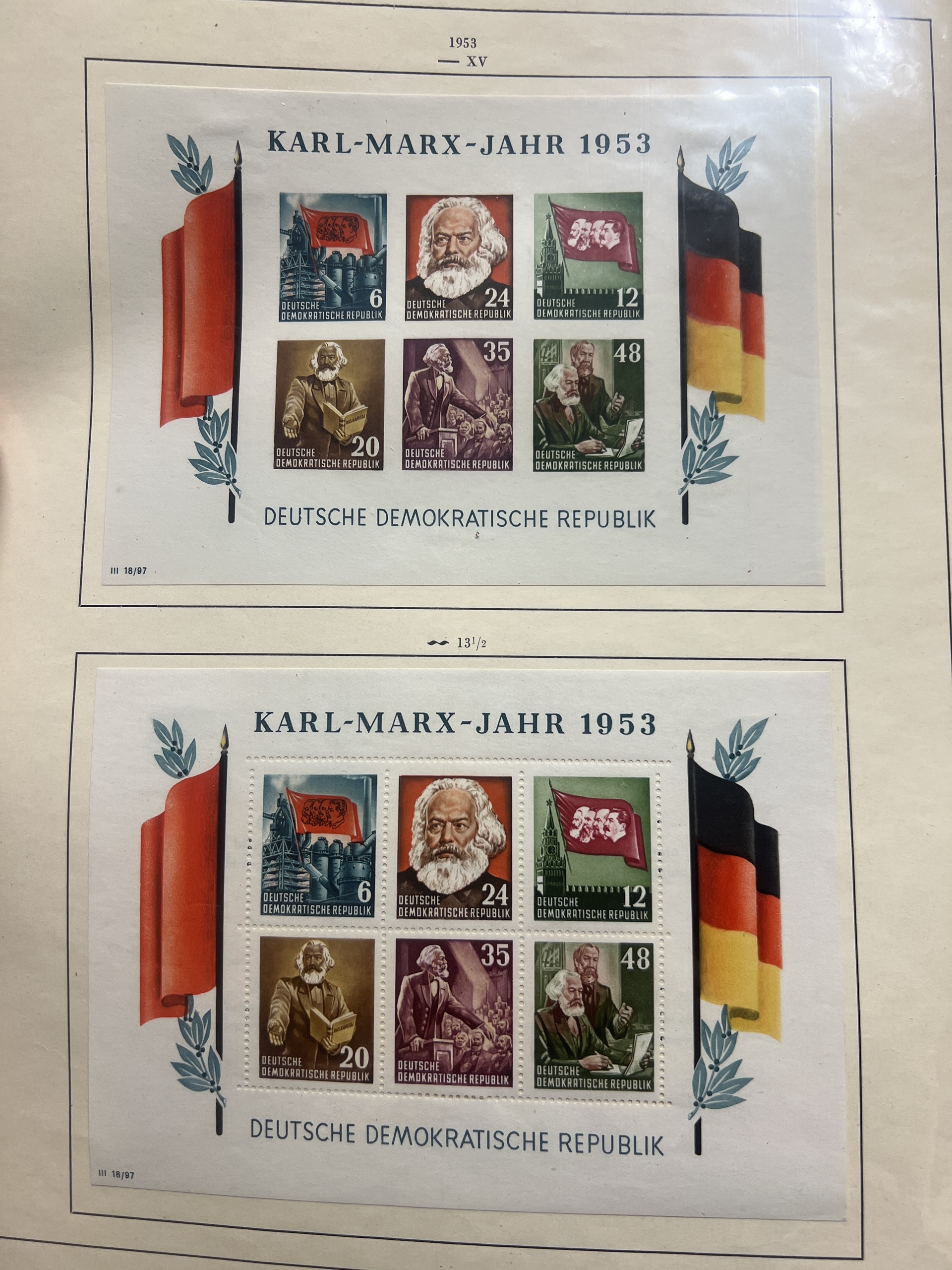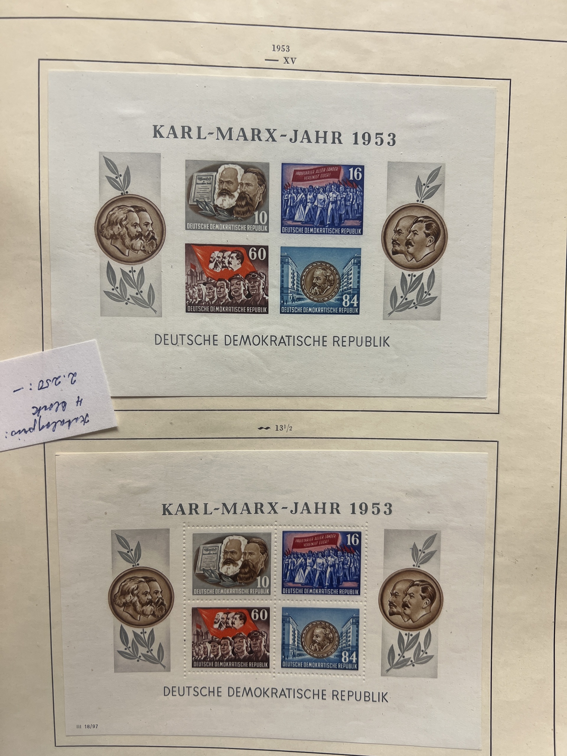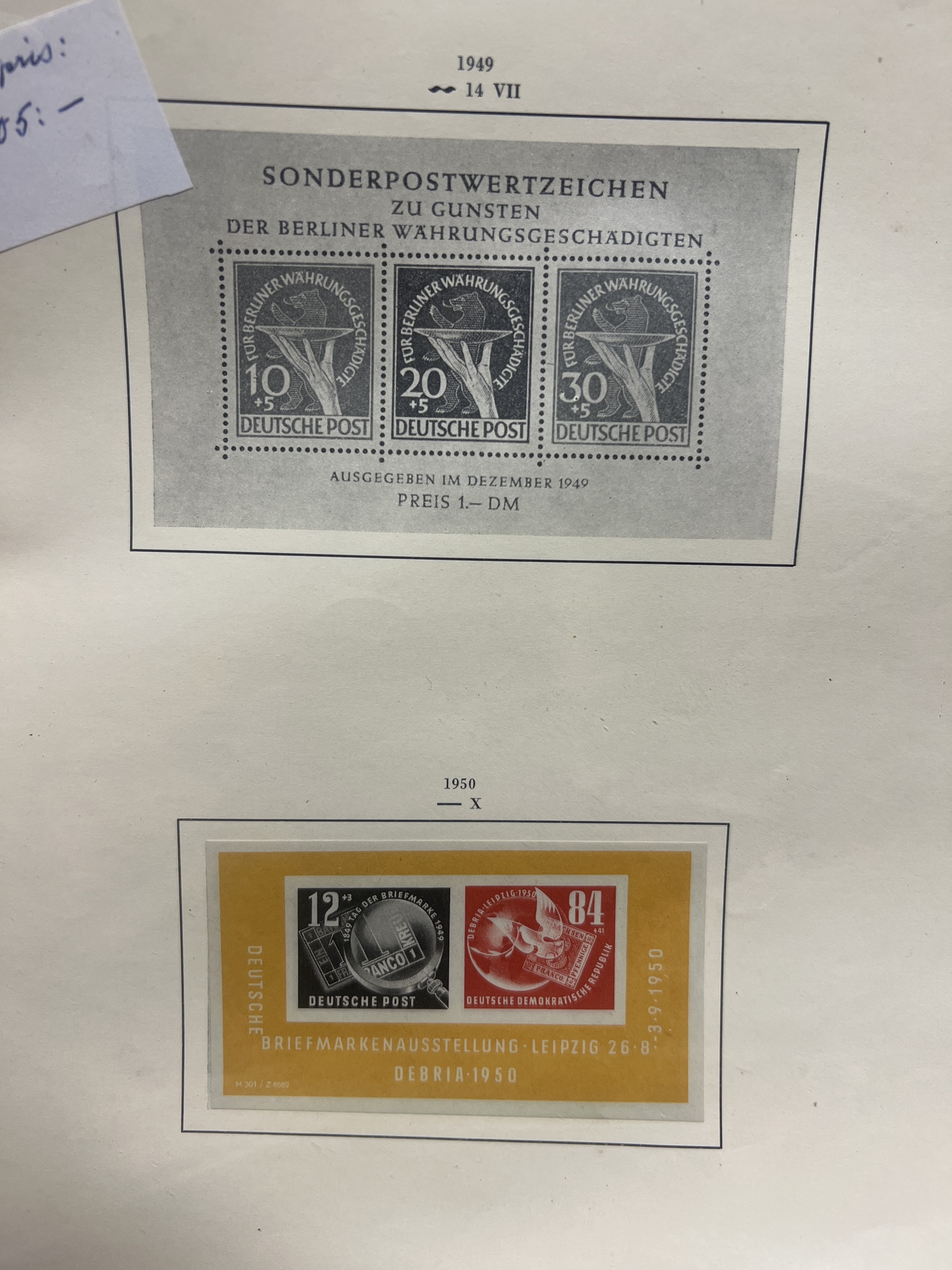 Germany, mixed. Accumulation ★★/★/⊙ 1940–1955 on leaves. Better stamps and sets incl. SAAR, Reich i.e. Braune band 1939–1944, GFR and GDR incl. Karl-Marx souvenir sheets set *. Mostly fine quality. (76)