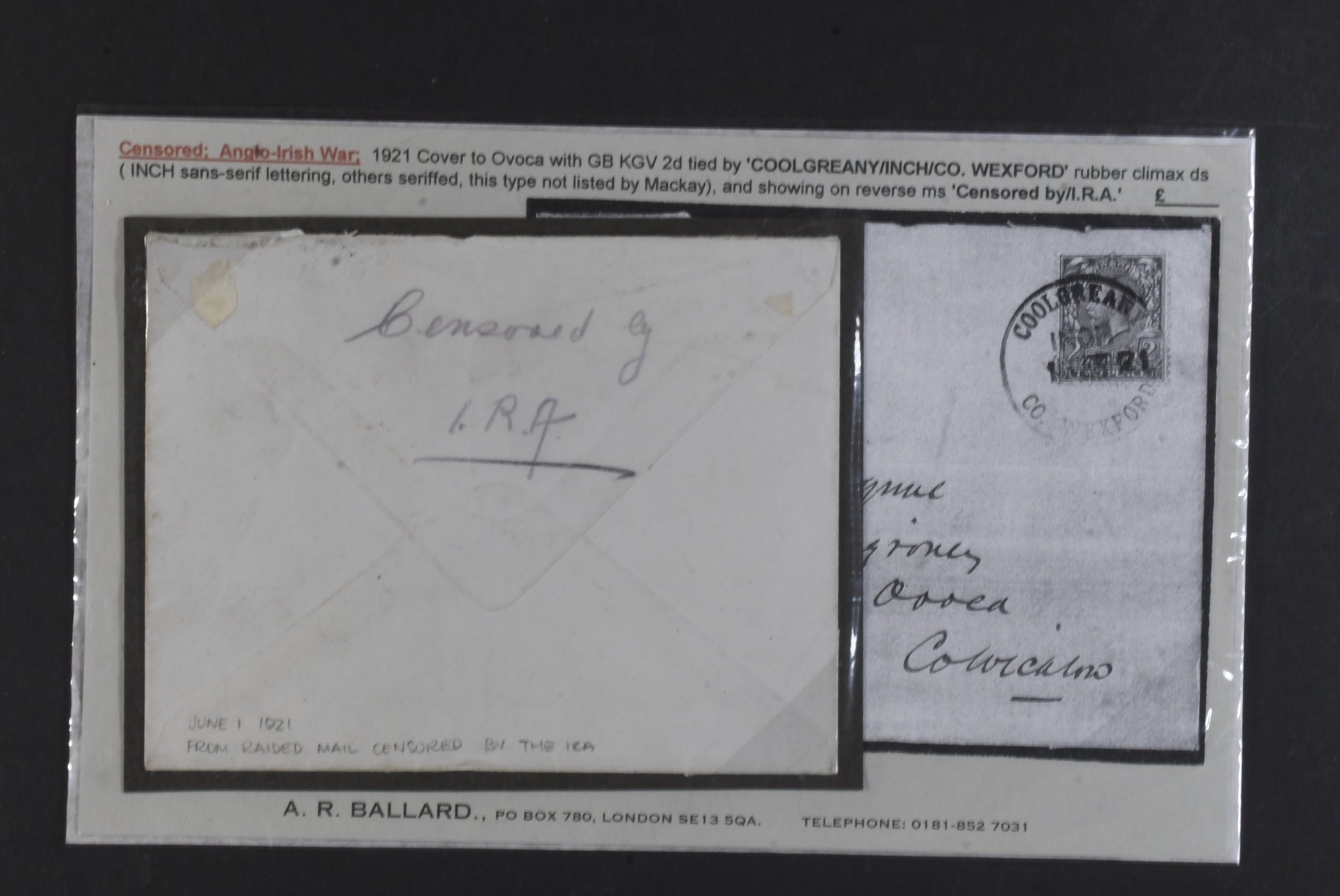 Ireland. Cover, an extraordinary IRA censorship cover, 1921 tied by county Wexford pmk and I.R.A. censorship reverse from mail raided on June 1st 1921. Exhibition item.