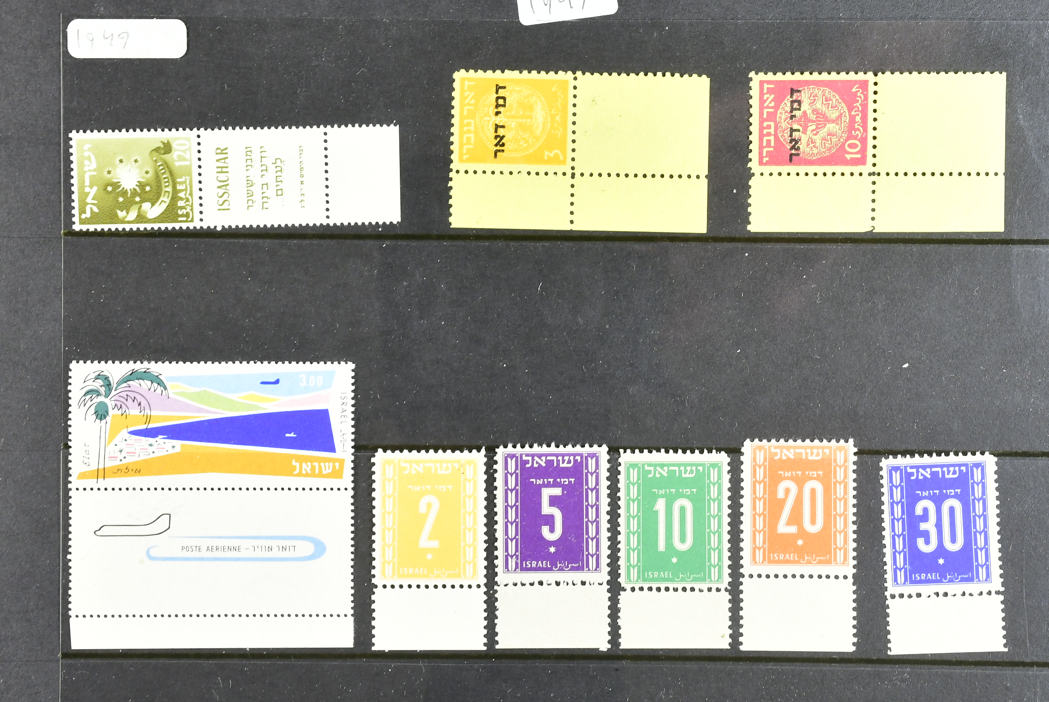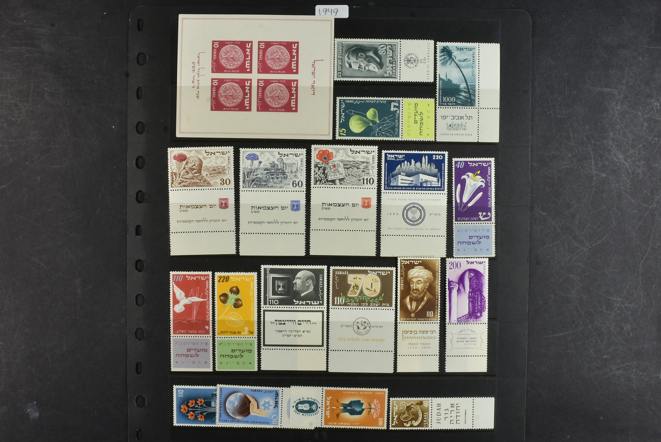 Israel. ★★ 1949–1960 on leaves. All different, all with full tabs e.g. Mi 17-souv. sheet 1, 69–72, 73–76, 79, 86, 154, postage due 3, 6–11. Good quality. Mi € 788 (29)