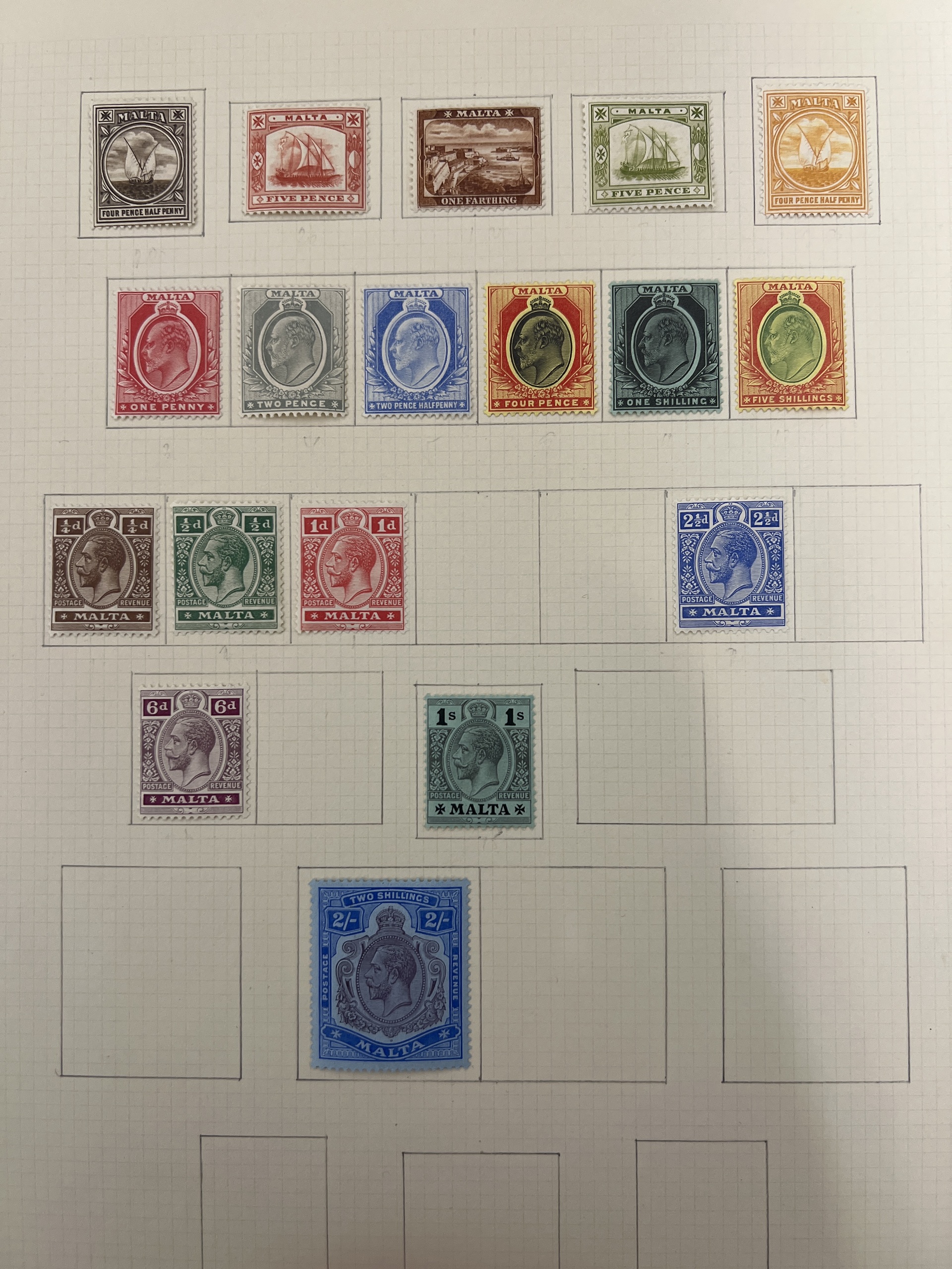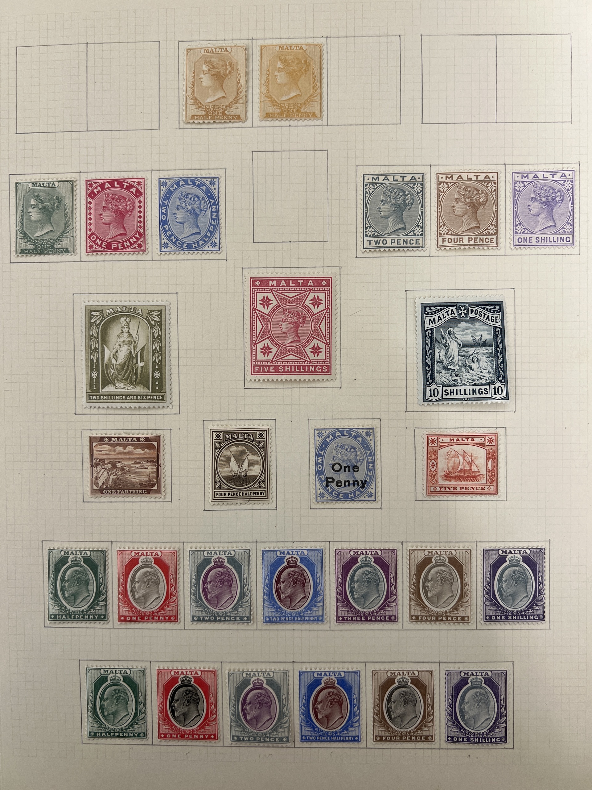 Malta. Collection ★ 1863–1914 on leaves without stamp mounts. Mi 2, 3, 4–9, 10, 11–12, 13–14, 17–23, 24–32, 32–40 etc, Mi about 1150 Euro. Fine quality.