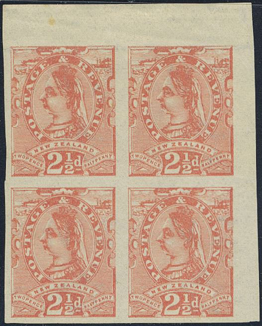 New Zealand. (★), Right hand sheet corner marginal block of four type 16, colour trial, imperf in red, rare.