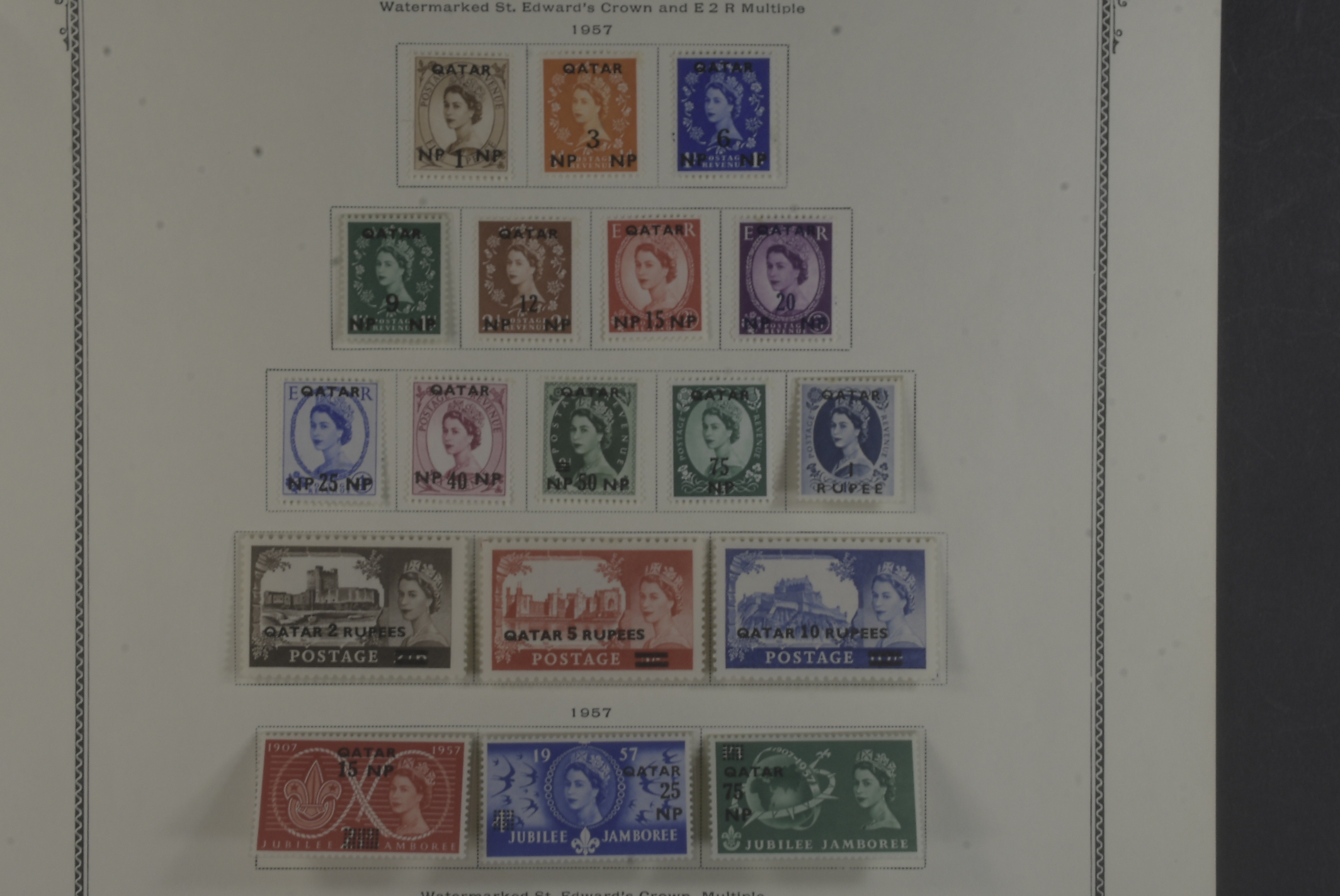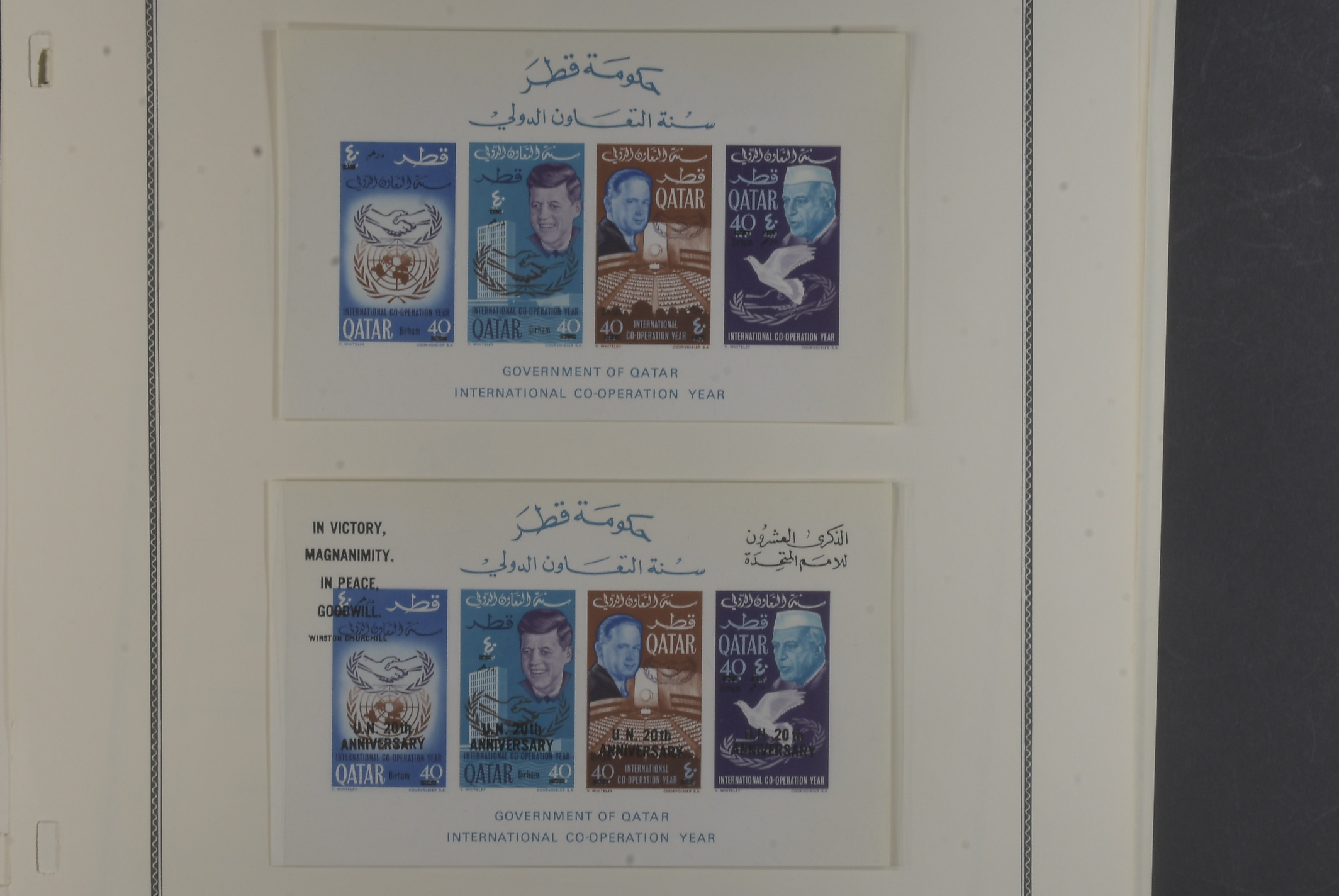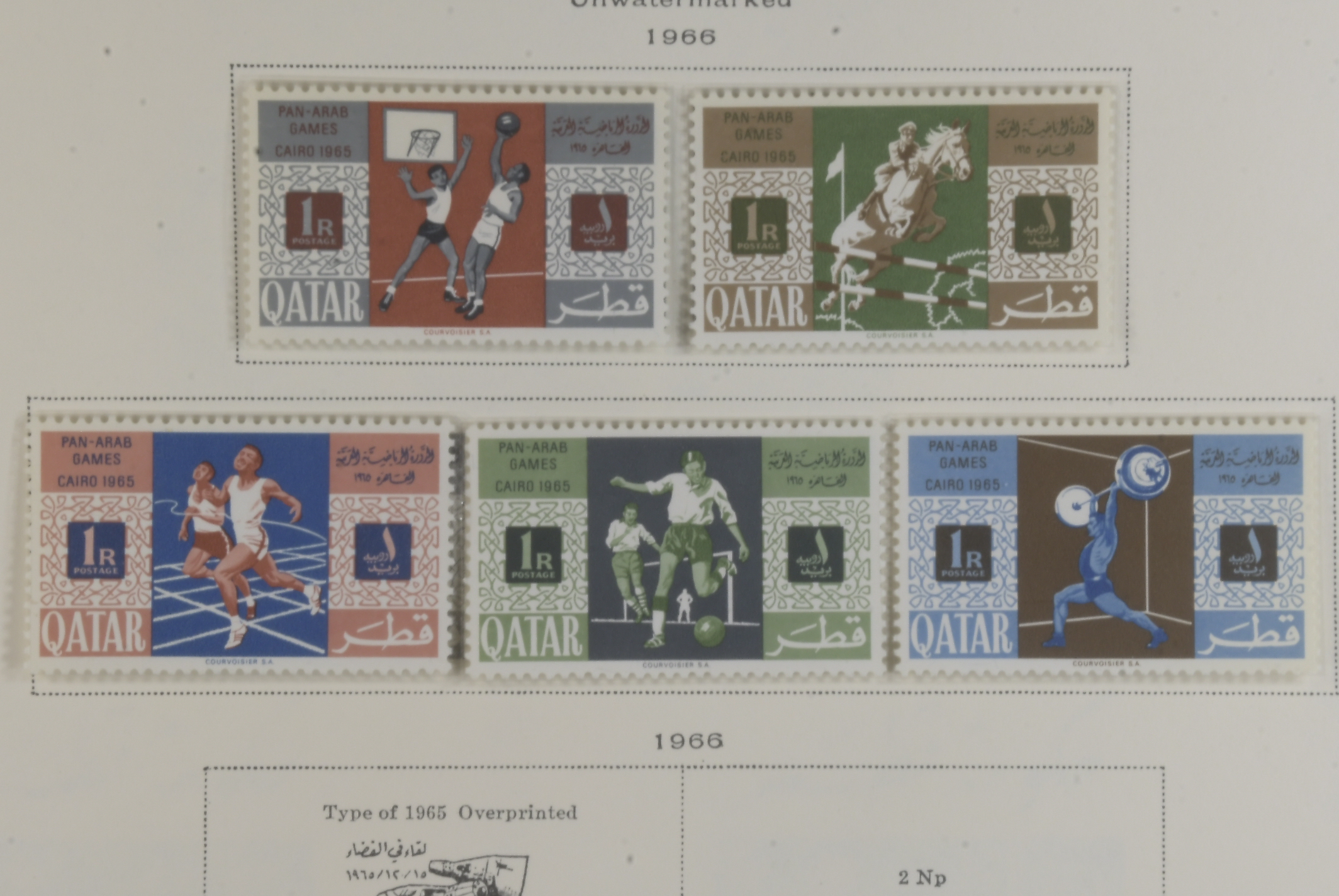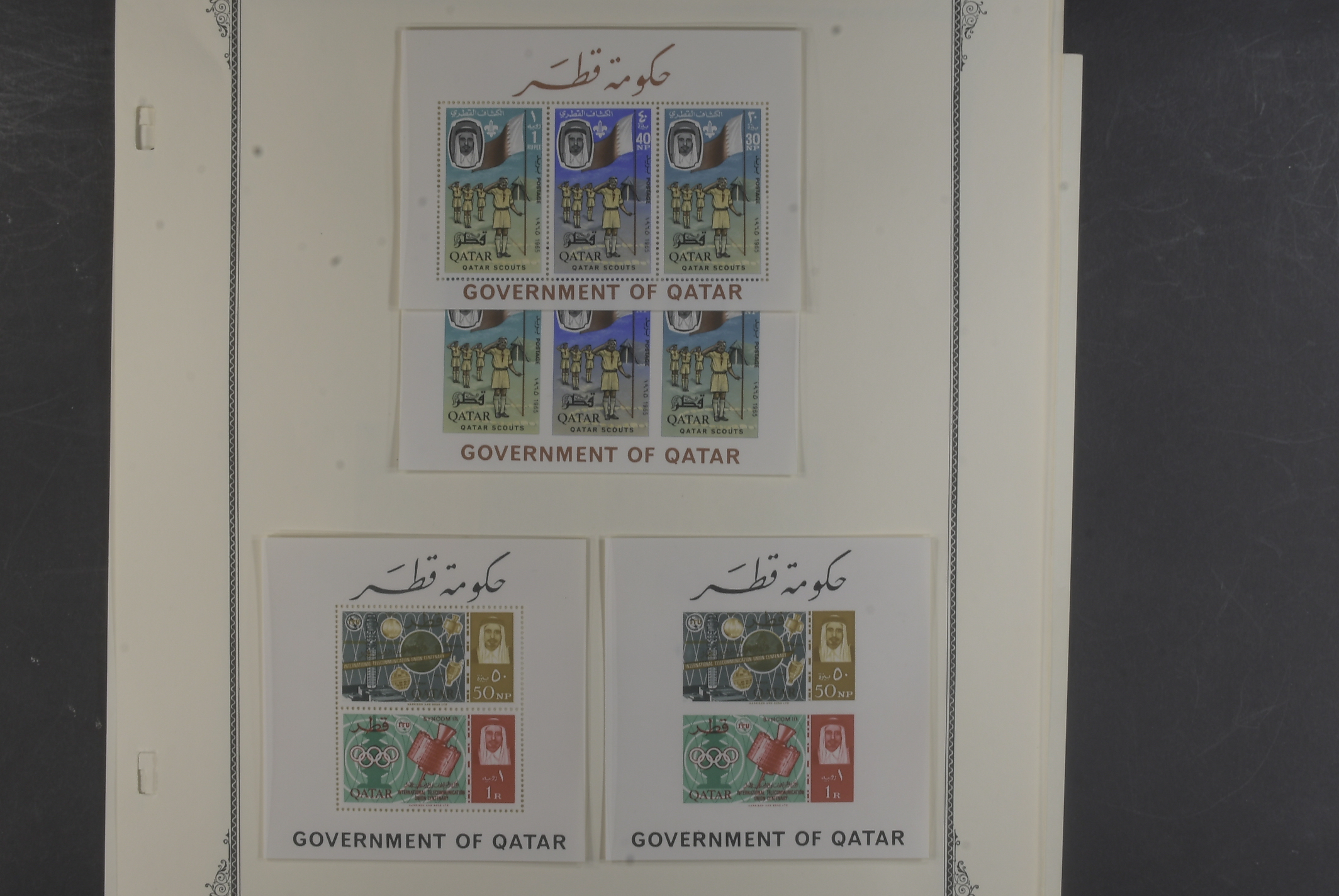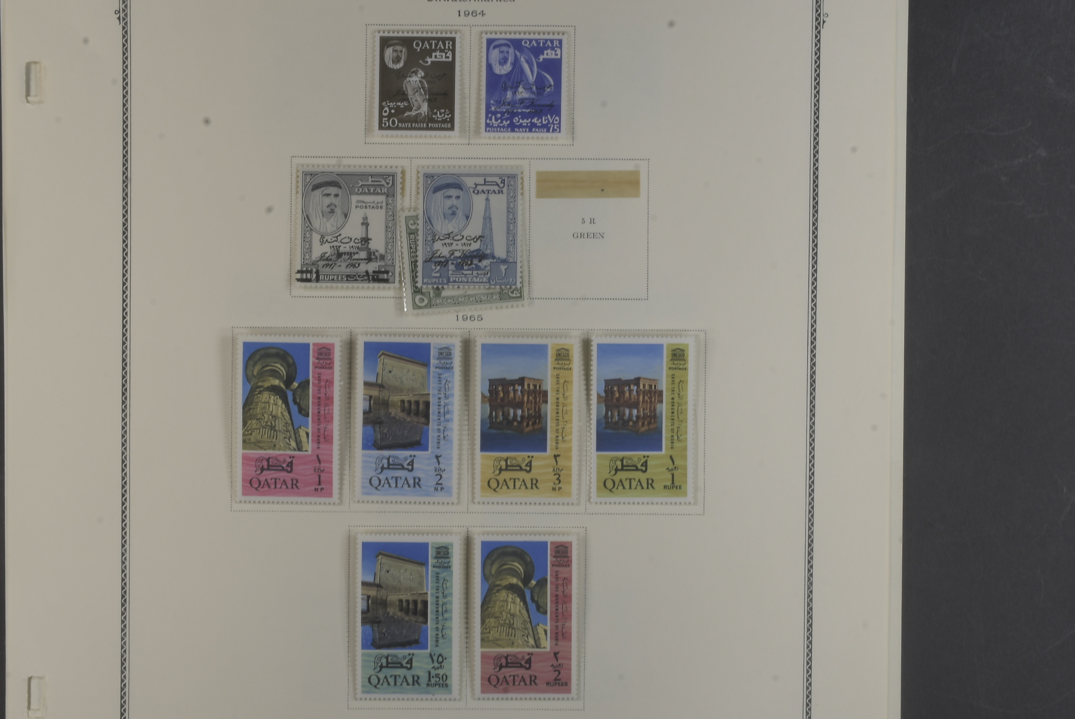 Qatar. Collection ★★ 1957–66 on six leaves well filled collection incl. m/s, first defins 1961 complete, Olympic o/ps 1964 complete, 1965 o/ps complete, all MNH, various commems and definitive sets esp Kenedy both with and without o/ps. Good quality.