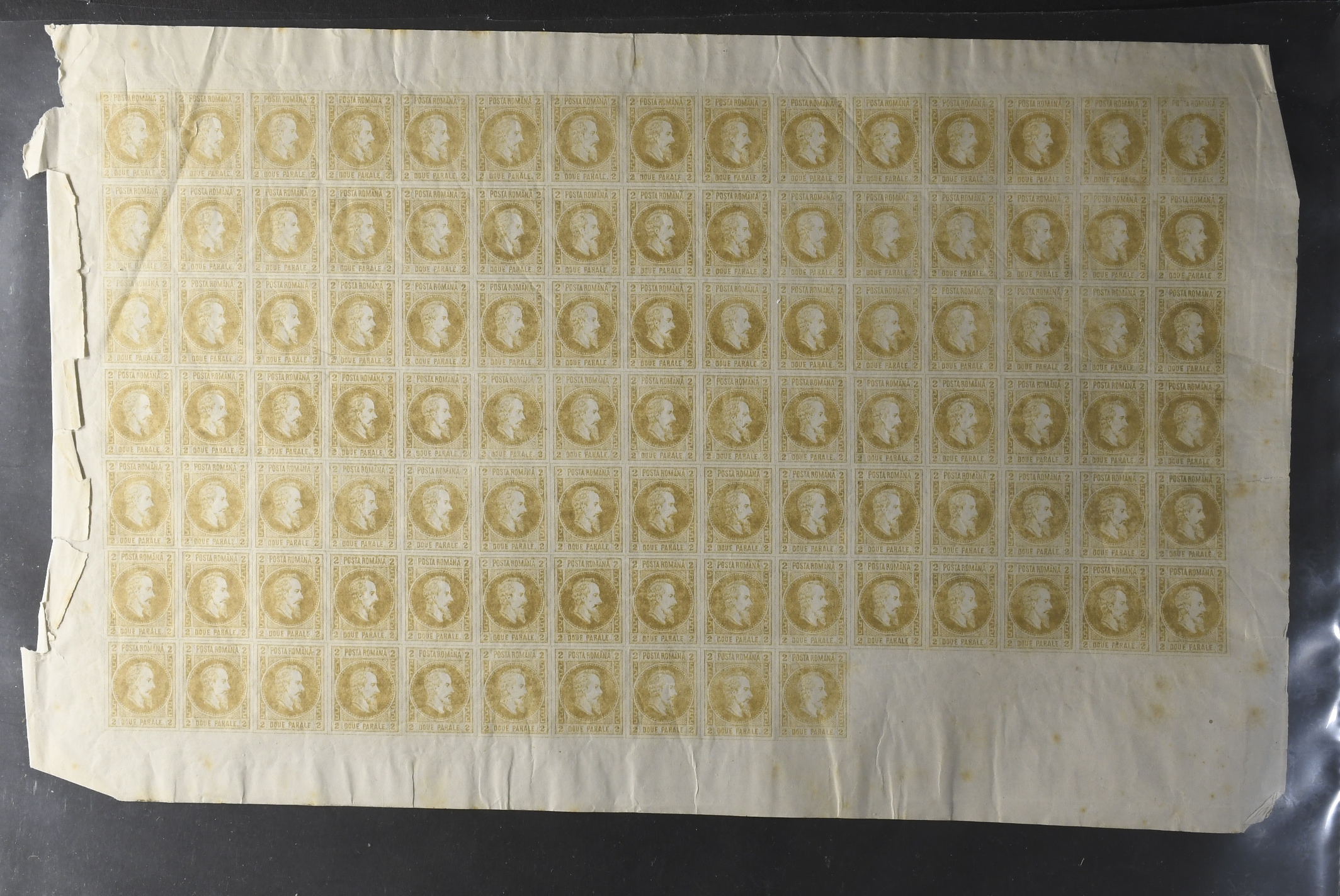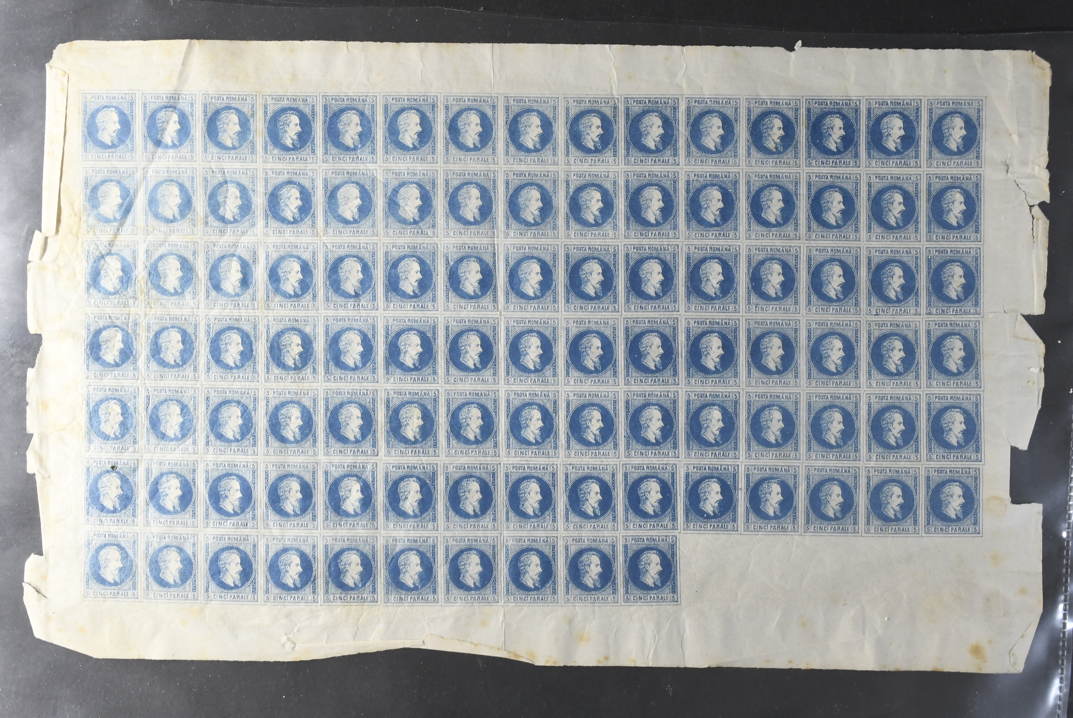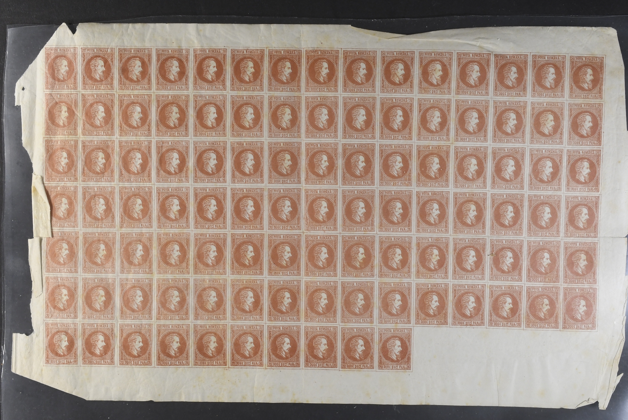 Romania. ★★. Very attractive and unusual complete sheets of the imperforate Prince Alexander Cuza definitives of 1865, SG #46 5 p blue, #48 20 p red and #49a 2 p orange. The catalogue as singles hinged alone is £150 per set i.e. £15,000 for the 3x sheets of 100. It should be noted that each sheet has five empty spaces to the bottom row and each sheet is particularly visually impressive as such. There is some toning on reverse of the 20 p red and a little toning this time on the selvage of the 5 p blue and occasional toning on the 2 p orange. Overall however, the toning is not at all obvious from the front of the stamps and given their age it is quite extraordinary to see such good condition generally, especially as never hinged. An opportunity very seldom available, much recommended.