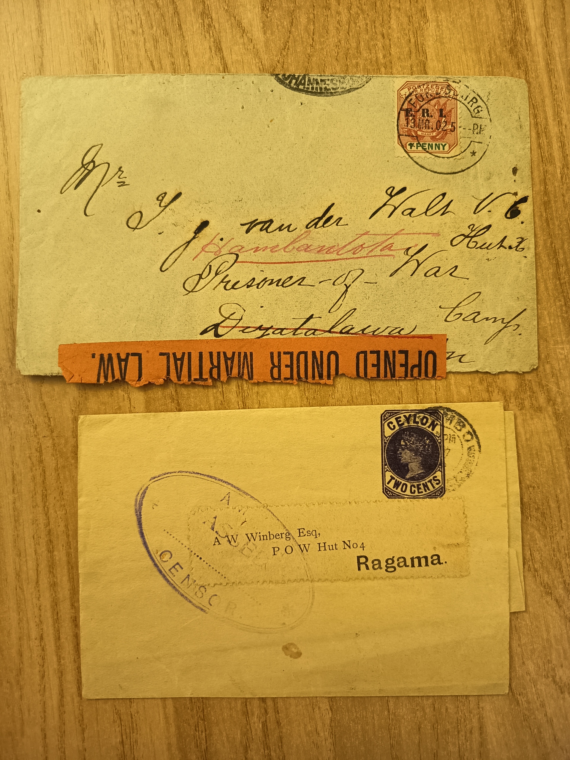 South Africa. Covers. Boer war, prisoner of war camps in Ceylon. Cover FORDSBURG 13.3.1902 to camp Dizatalawa redirected to Hambanttota and Ceylon wrapper to Ragama camp both censored.
