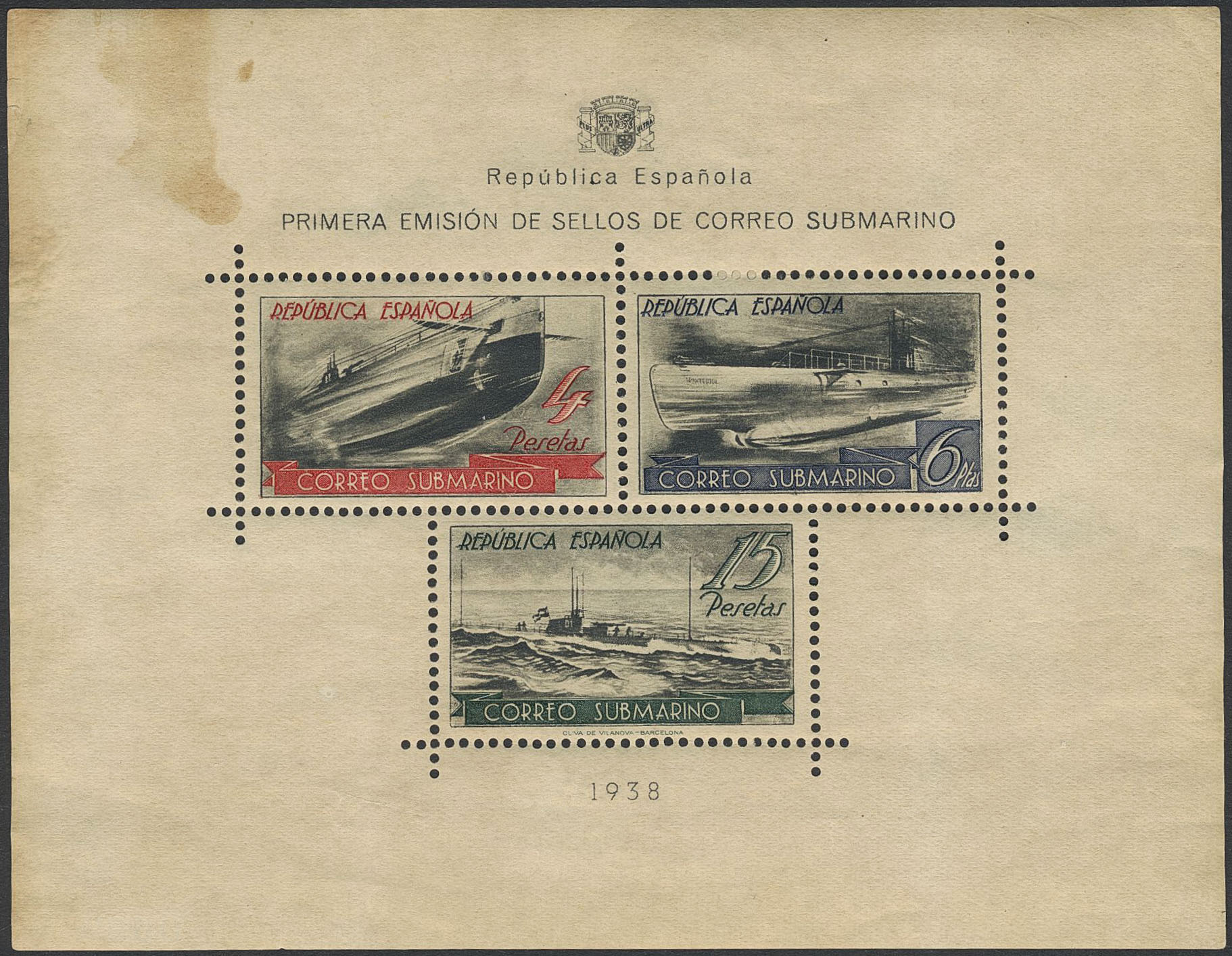 Spain. Michel 727–29 ★, 1938 Submarine Post Souvenir sheet 5. With large stain and heavy climate affected. EUR 700