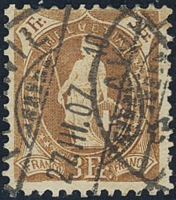 Switzerland. Michel 80D used, 1905 Standing Helvetia 3 Fr yellow-brown perf 11½ × 12 wmk. EUR 350