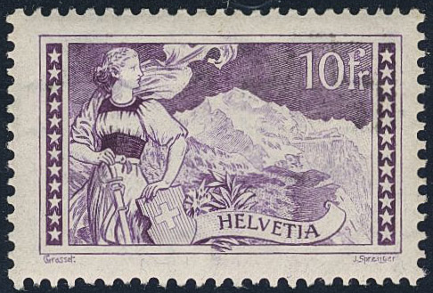 Switzerland. Michel 123 ★★, 1914 Landscapes 10 Fr violet. EUR 240