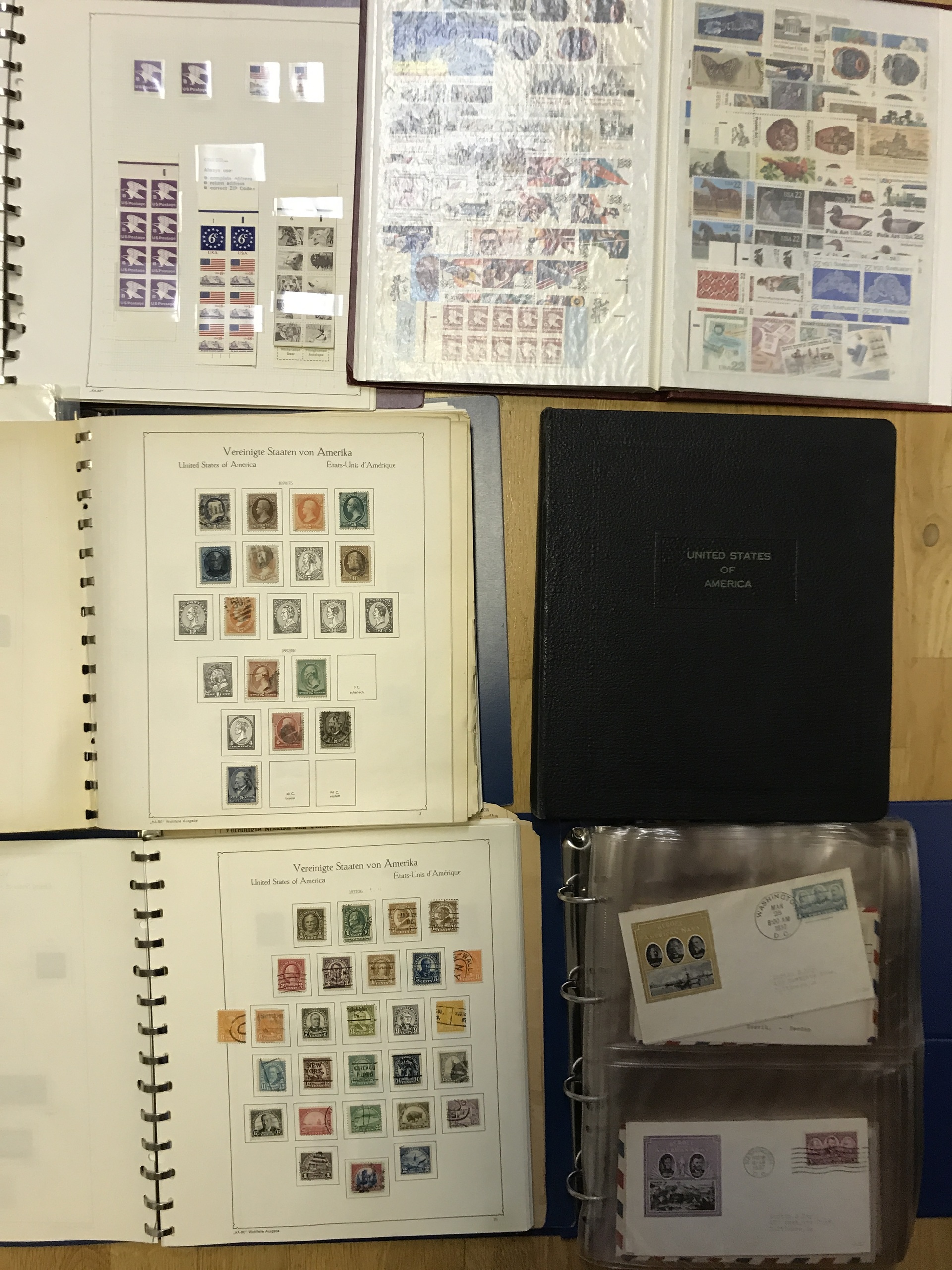 U.S.A. ★★/★/⊙. Coll./accumulation classics–2000s in five albums + one binder with covers. E.g. many ** blocks-of-four, some booklets and sheets, etc. Approx. 9 kg.