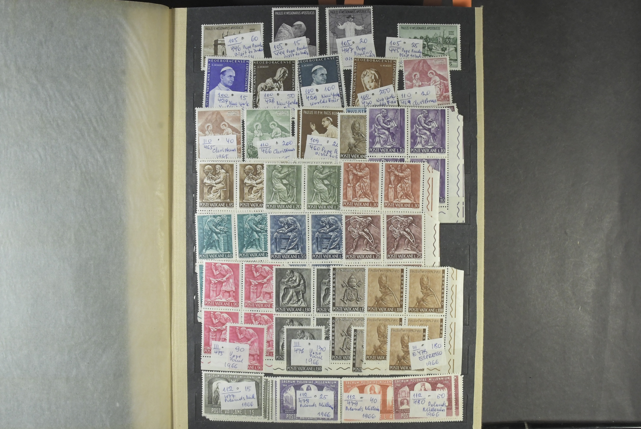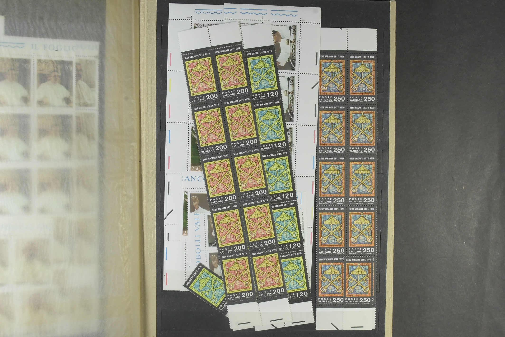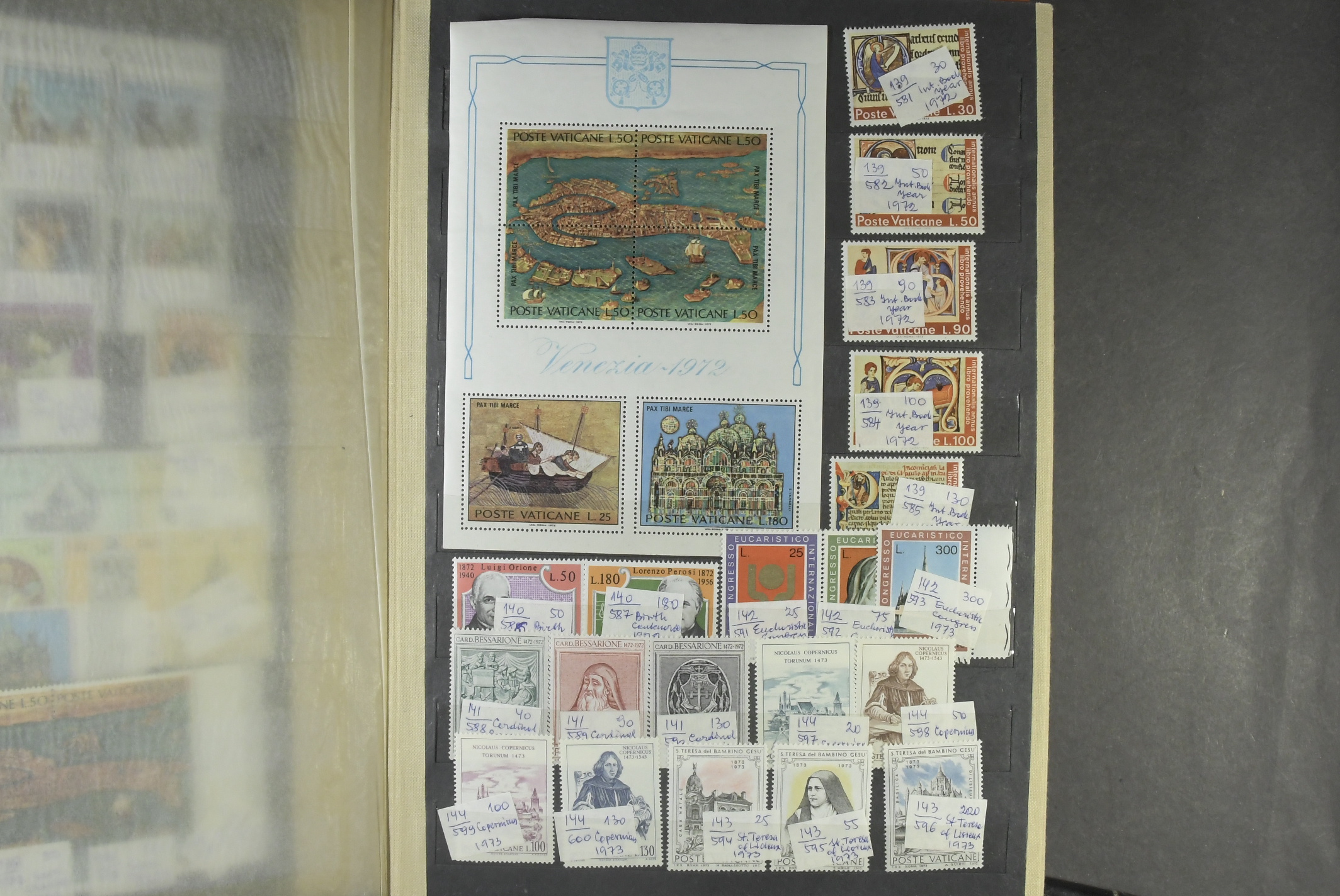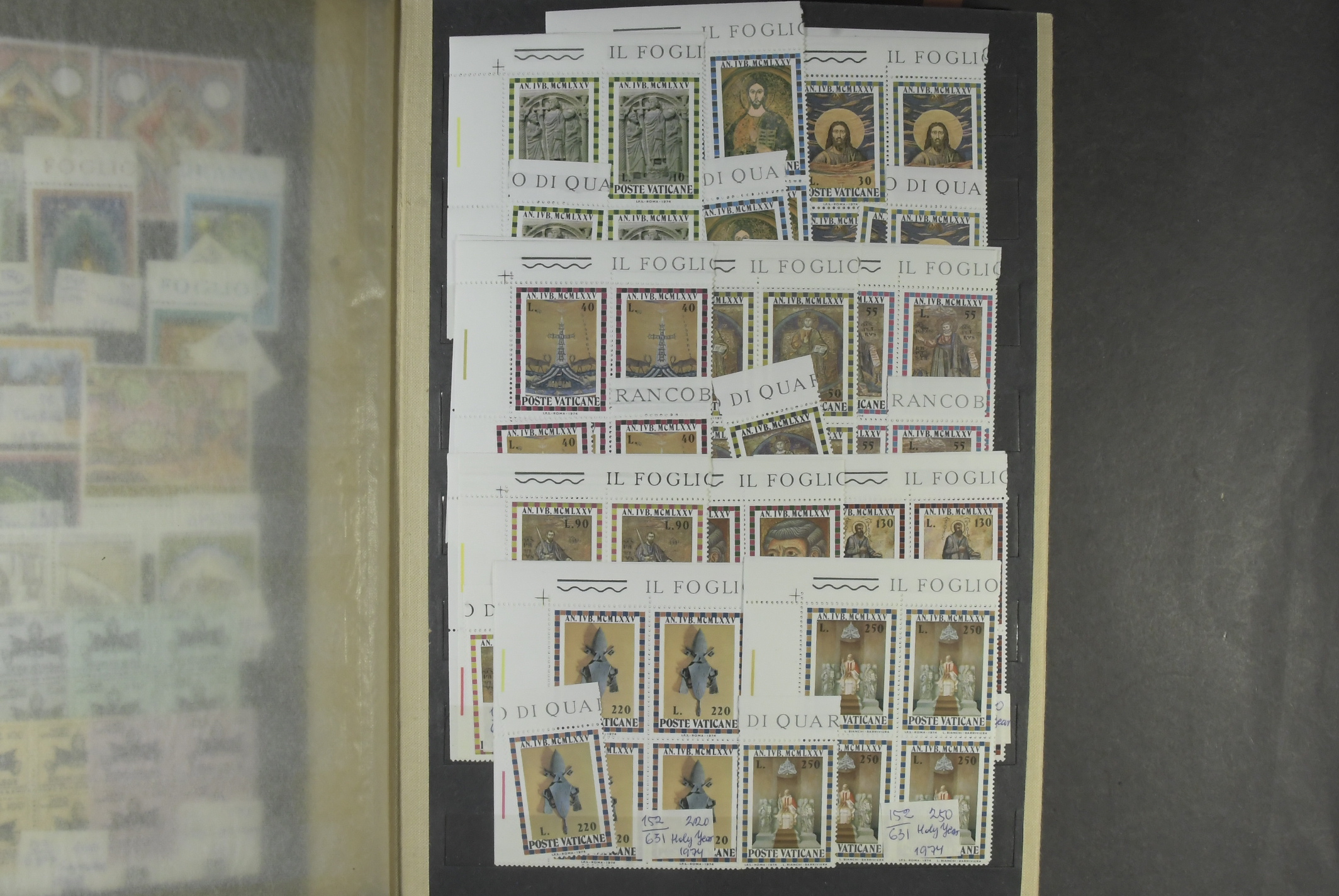 Vatican. Collection/accumulation ★★ 1964–1980 in stockbook. Single stamps, sets, series, stamp sheets (both complete and parts thereof), blocks of four with and without margins, mini sheets and more. Additionally a stockbook Italy. Please see a selection of scans at www.philea.se. Excellent quality. (>1000)